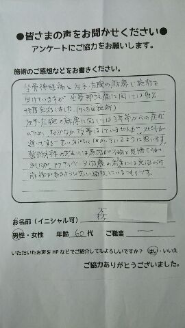 こんにちは!望月です頸椎脊柱管狭窄症による首と手の痛みと痺れ症状で来院して下さった患者様から施術の感想を頂きましたご協力頂きまして本当にありがとうございます!40代 男性 K,K様 【大田…