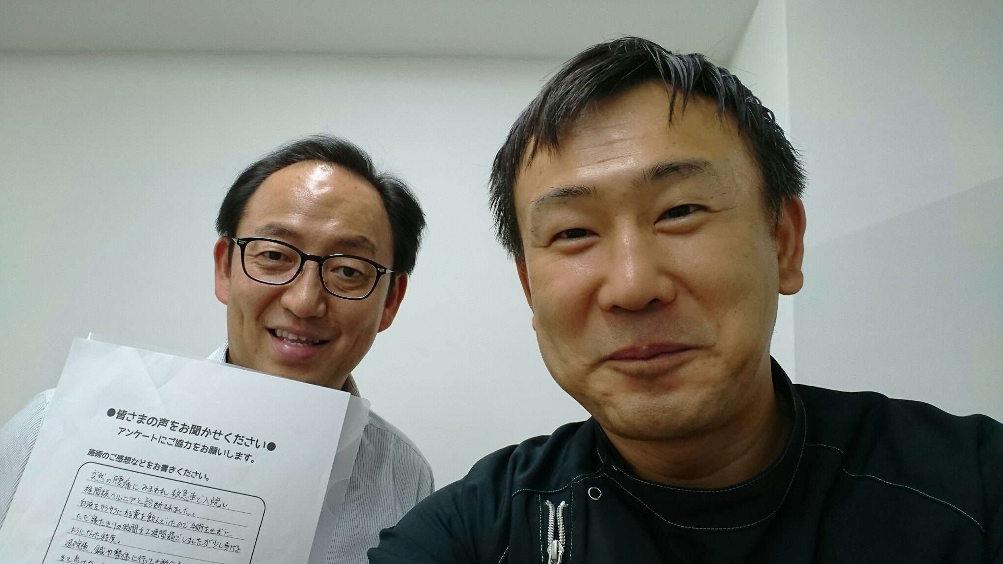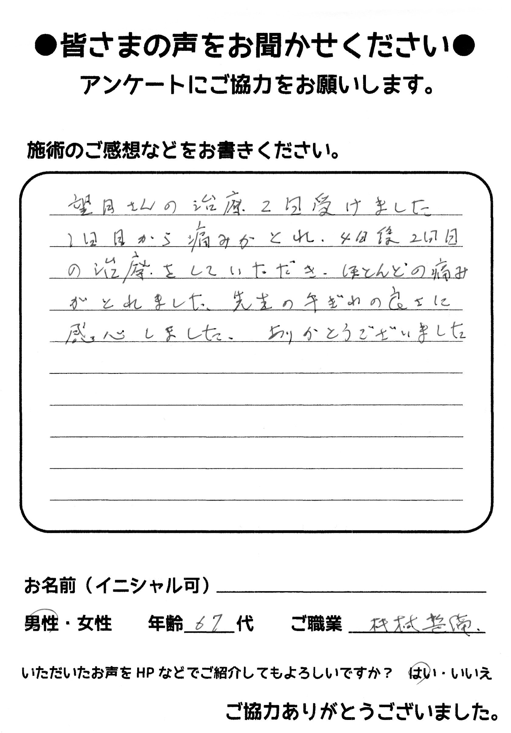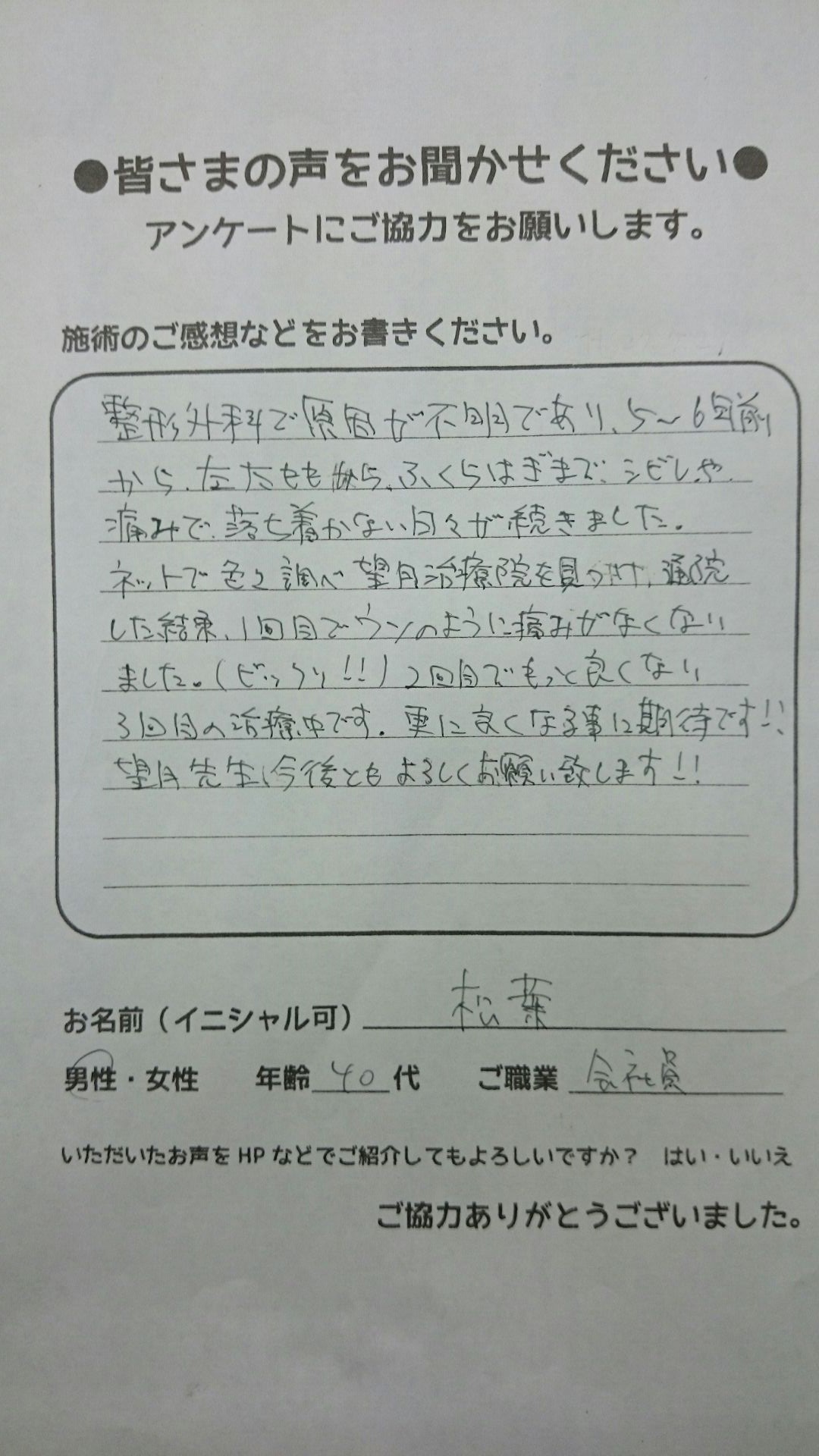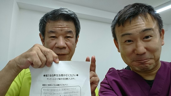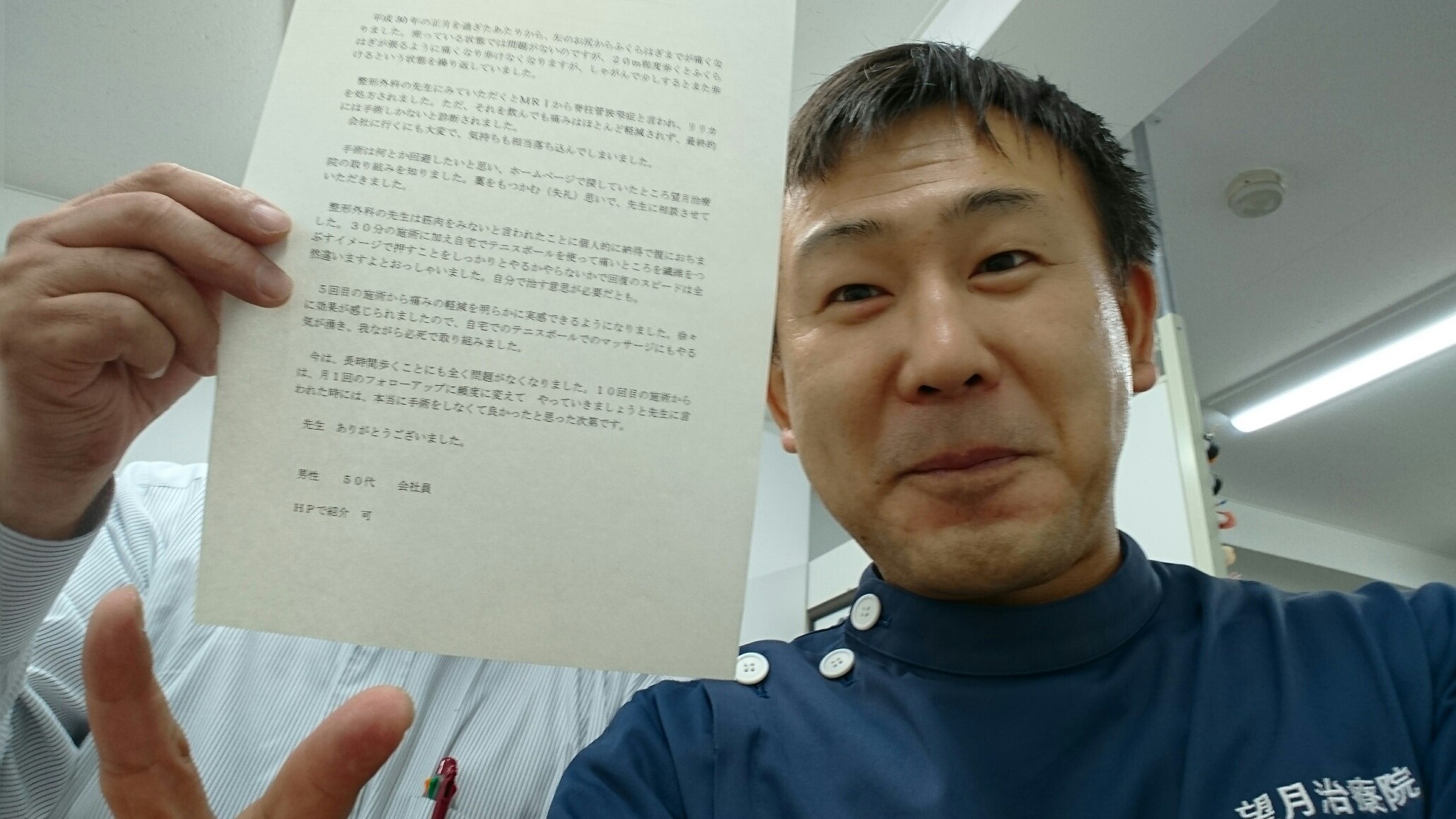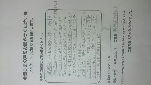 こんにちは!望月治療院の望月です!椎間板ヘルで来院して下さった患者様から治療の感想を頂きました。すっきり治って私も嬉しいです!ご協力頂きましてありがとうございました!60代 男性 M,I様…