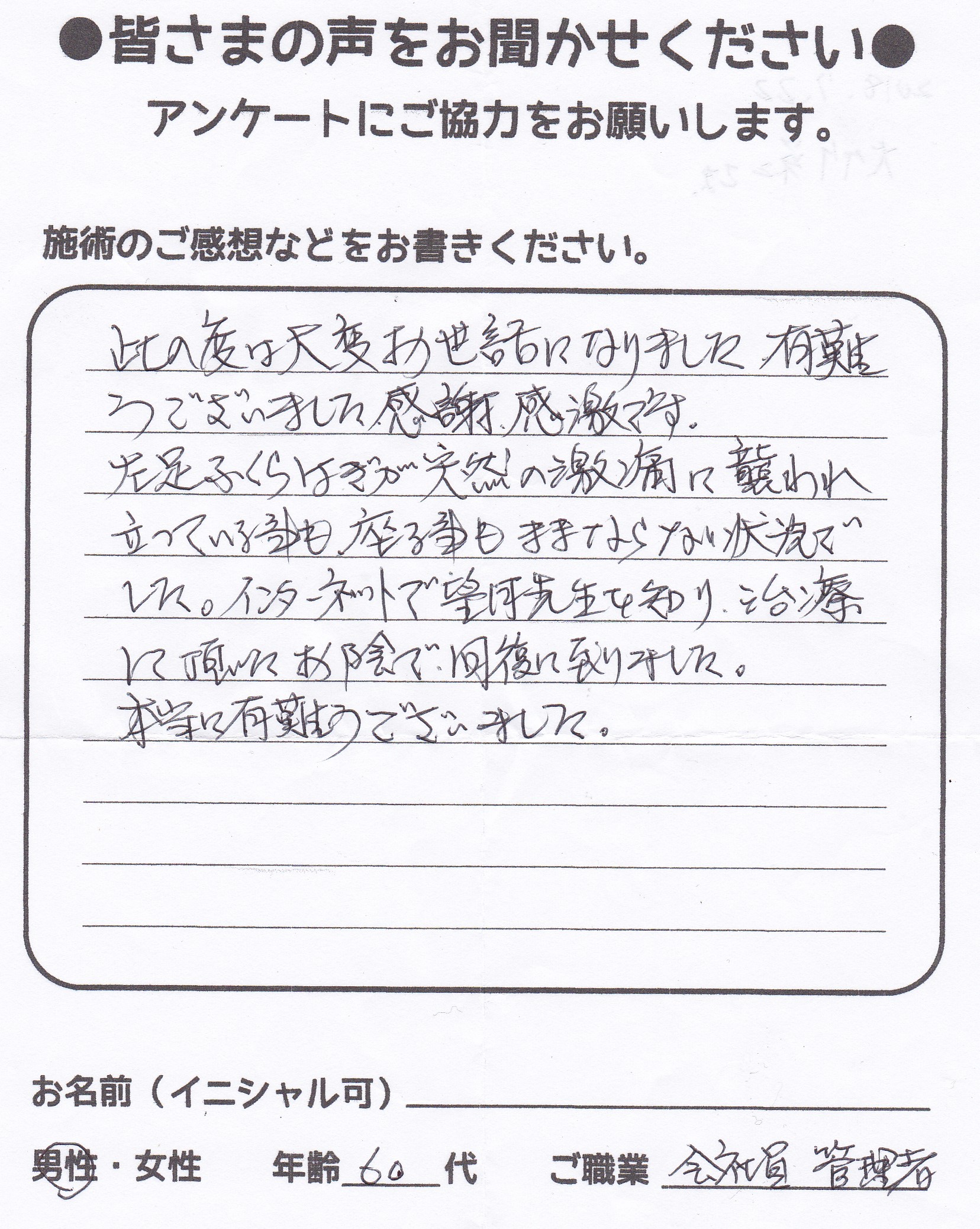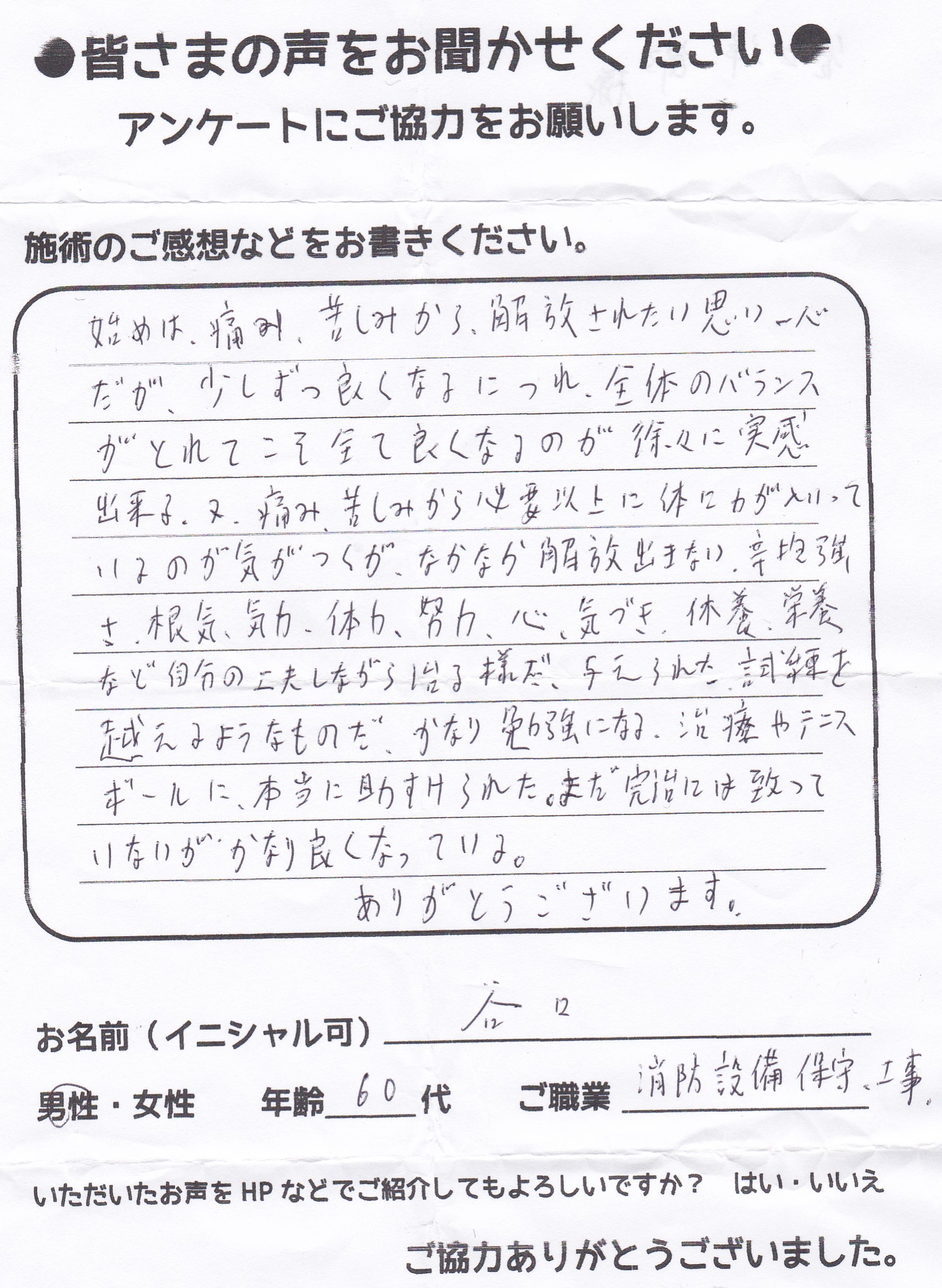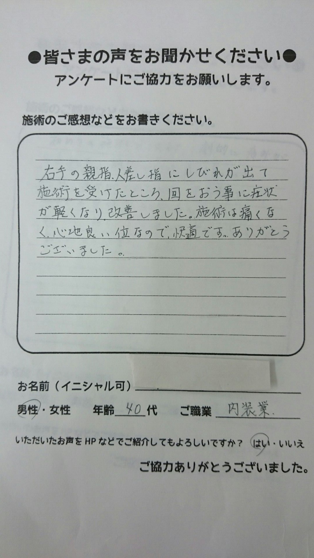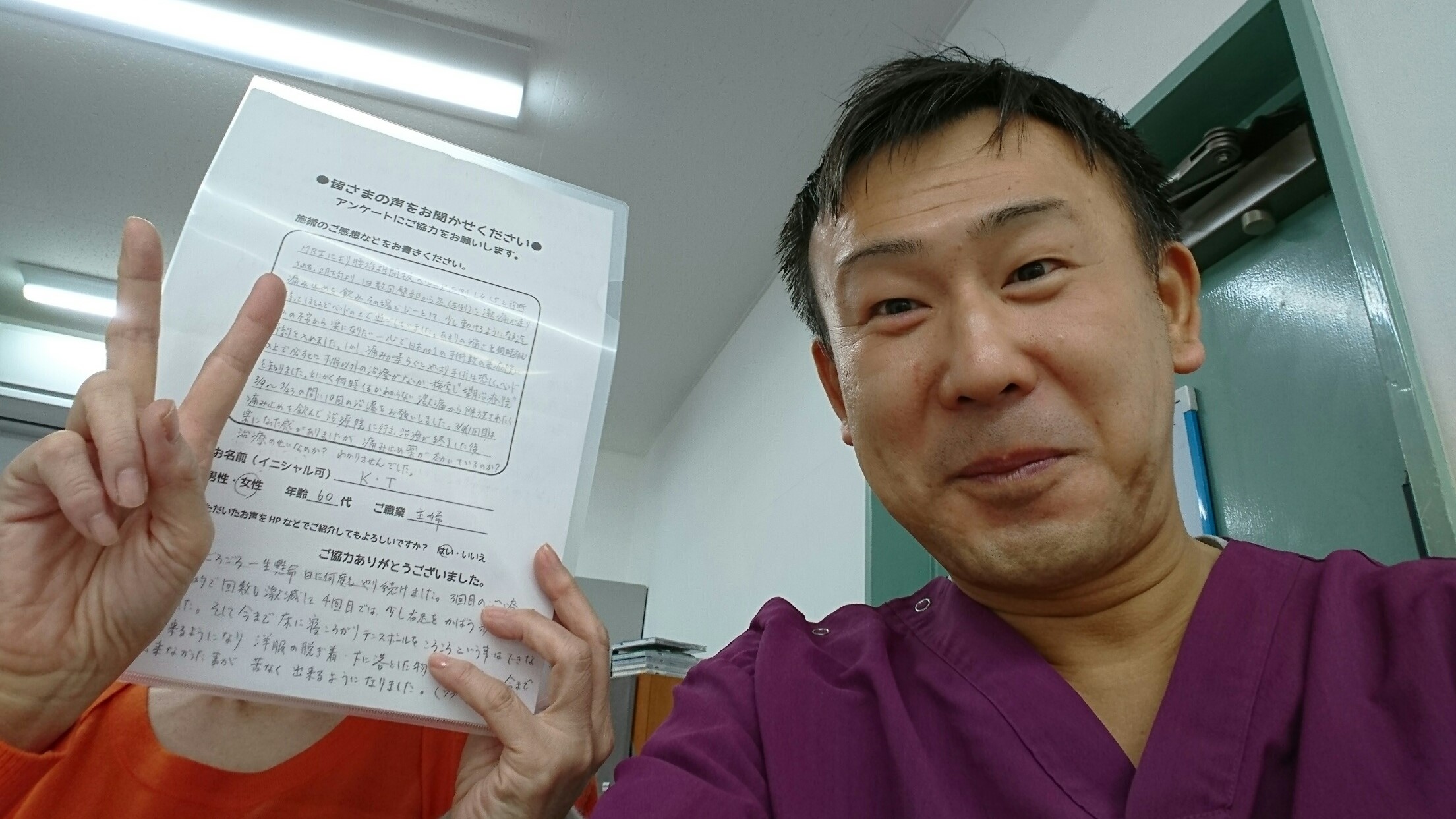 こんにちは!望月治療院の望月です!椎間板ヘルで来院して下さった患者様から治療の感想を頂きました。すっきり治って私も嬉しいです!ご協力頂きましてありがとうございました!60代 男性 M,I様…