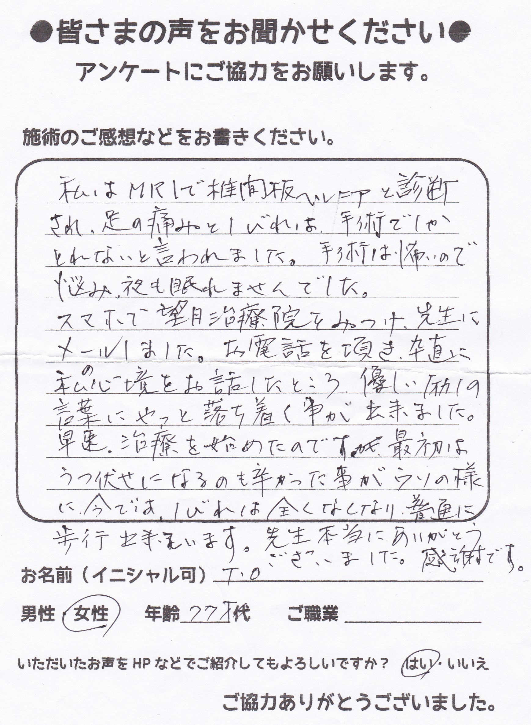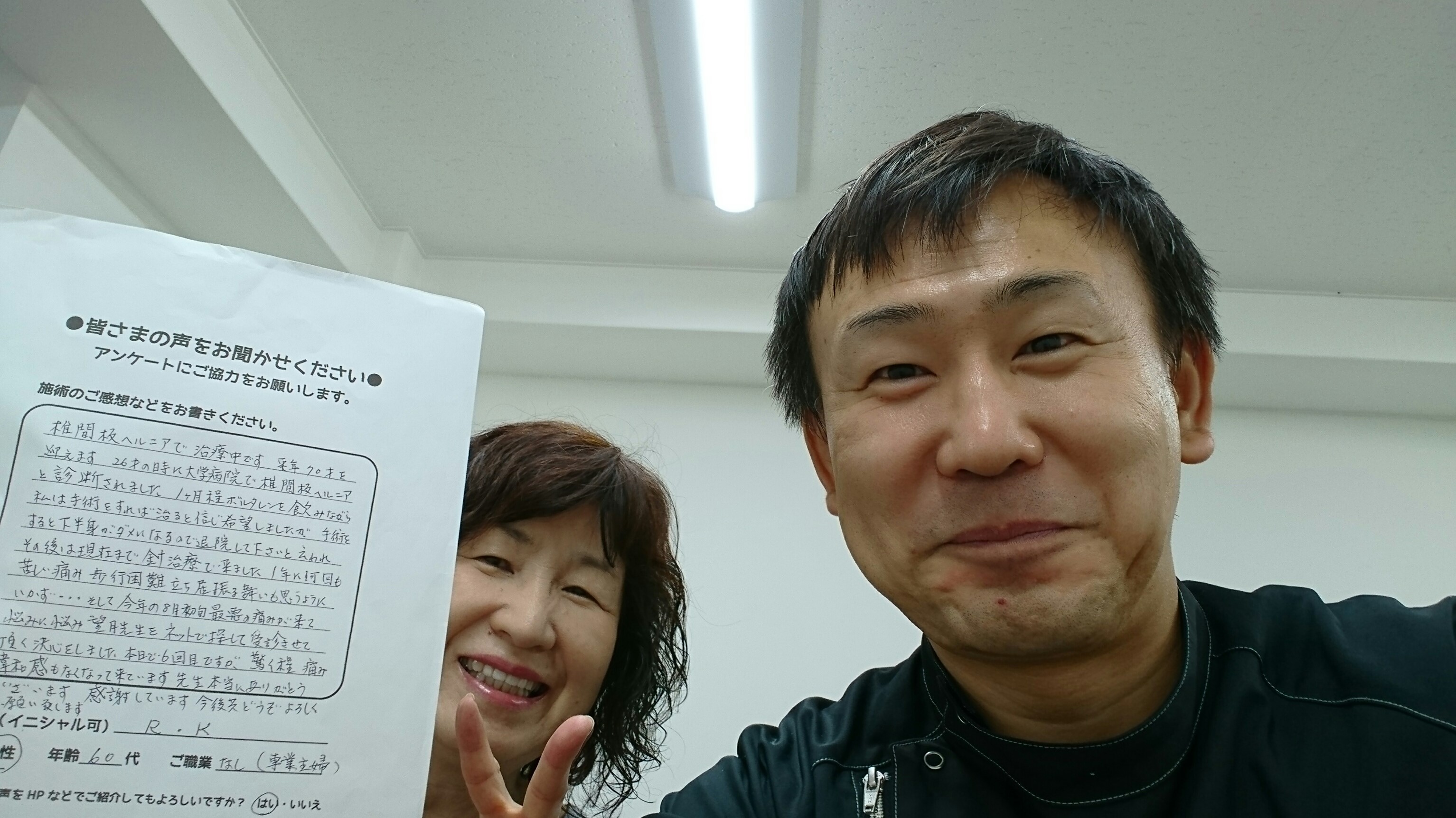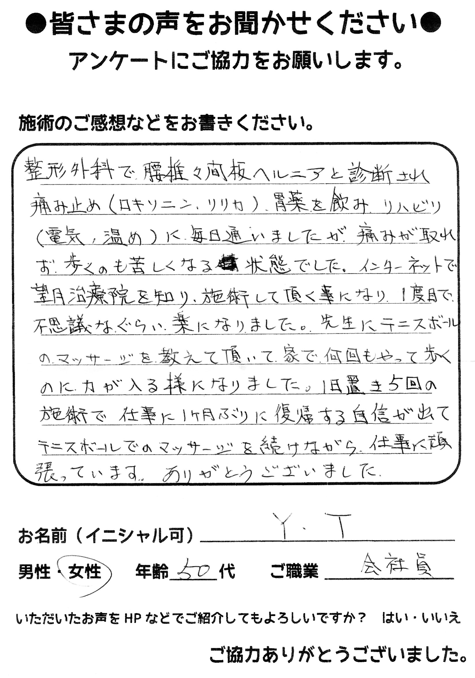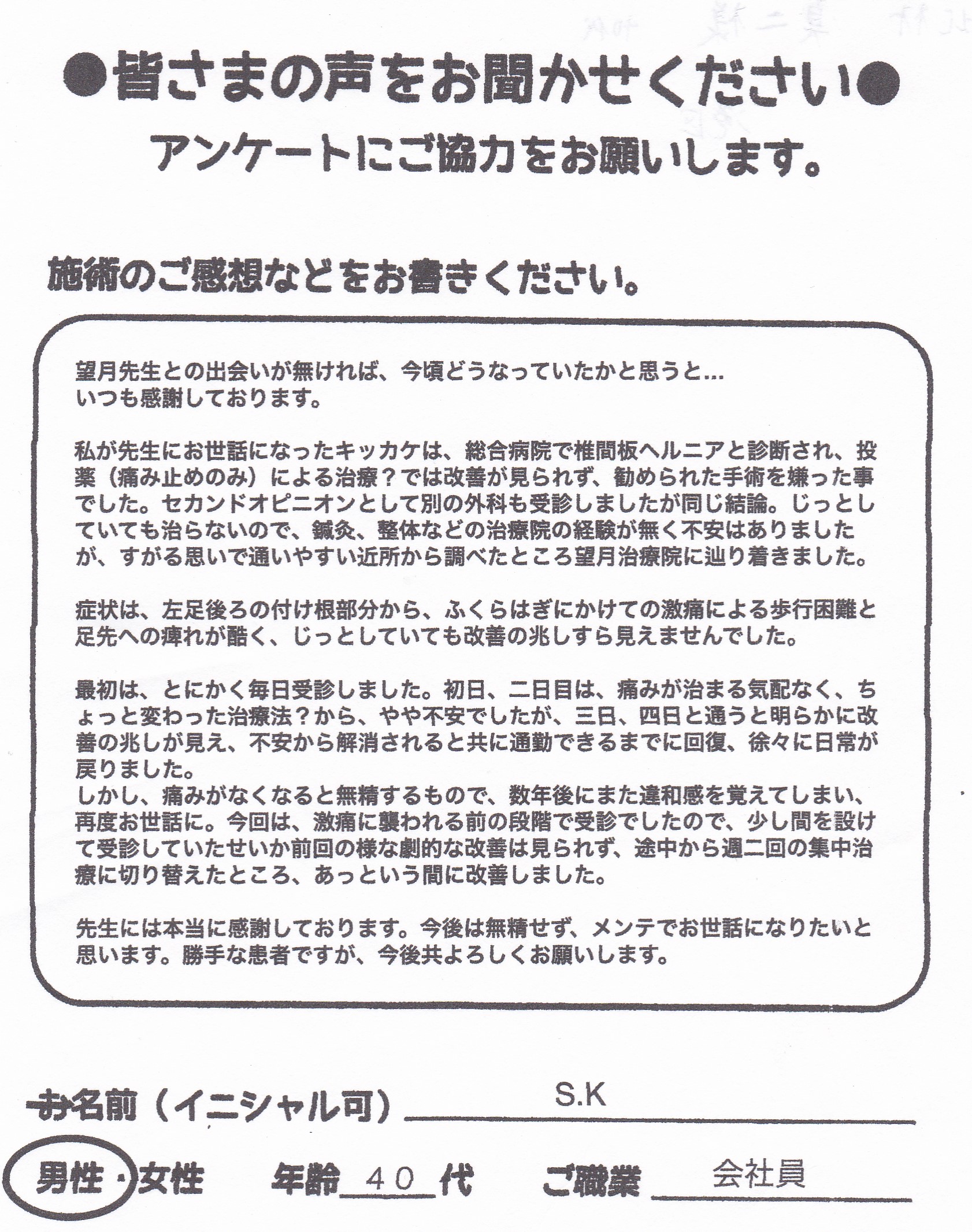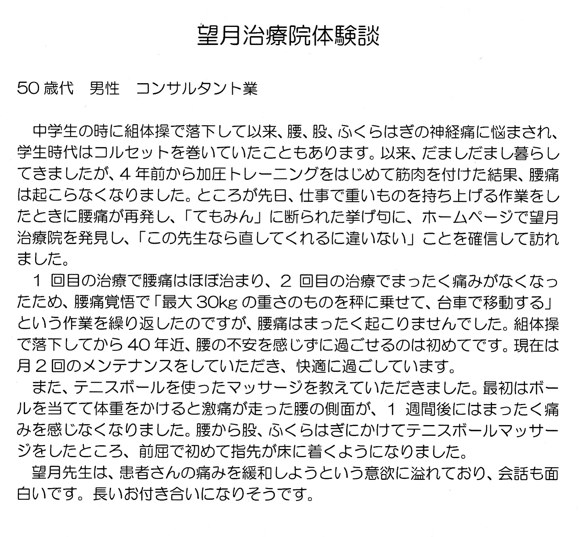 こんにちは!望月治療院の望月です。椎間板ヘルニアで来院した患者様から施術の感想を頂きました。すっかり良くなって私も嬉しいです!ご協力頂きありがとうございました!50代 女性 S,Y様 【品…