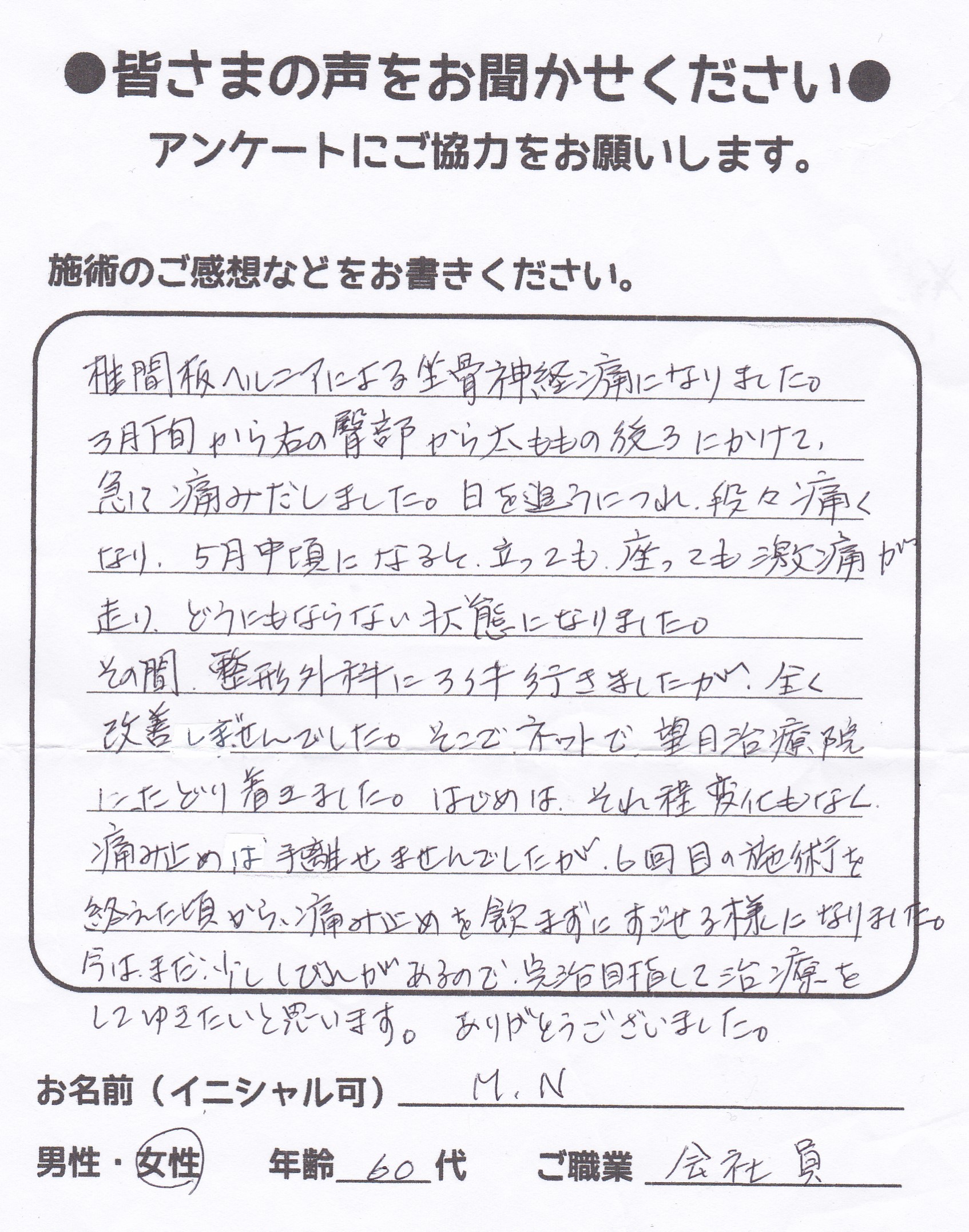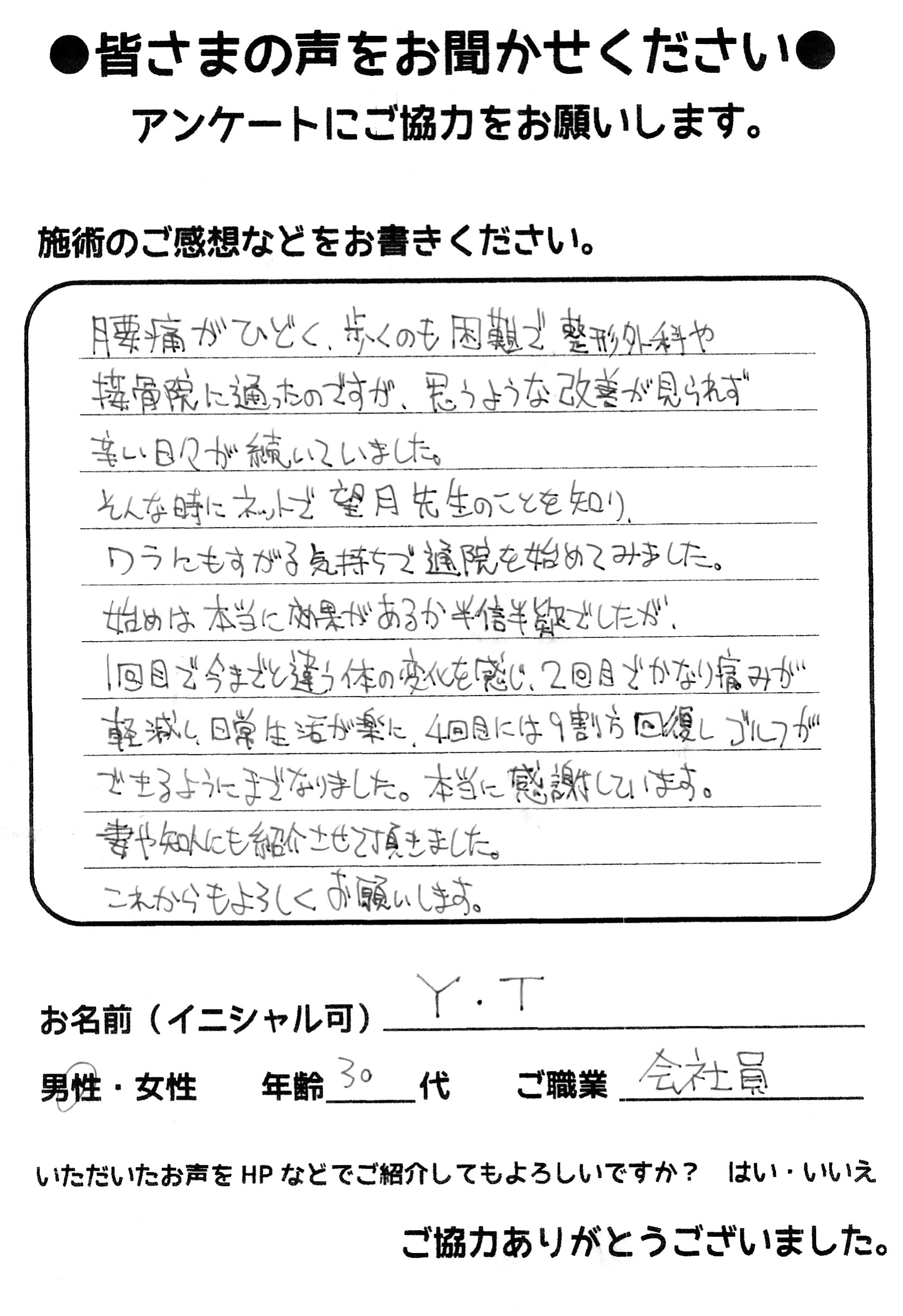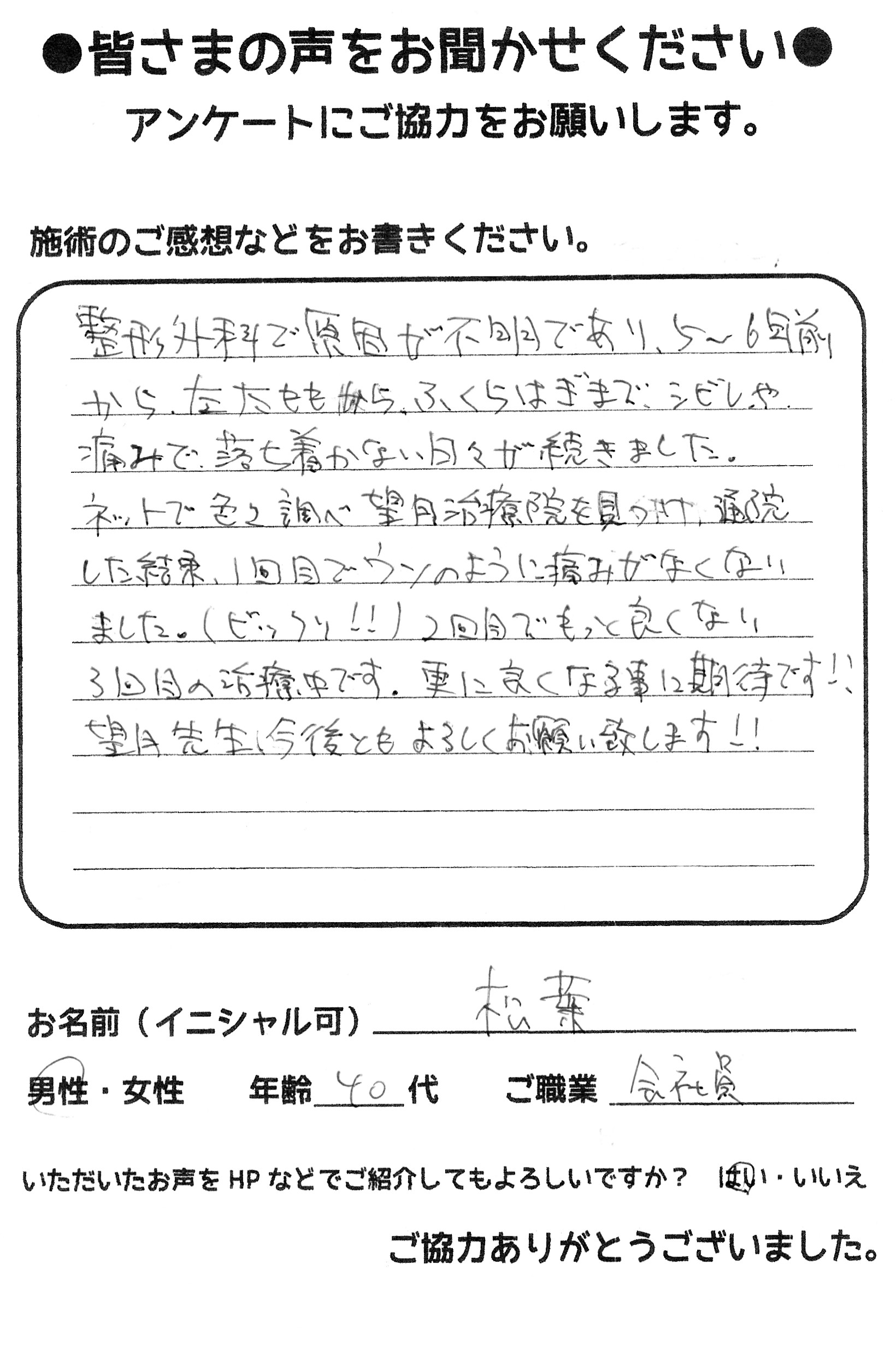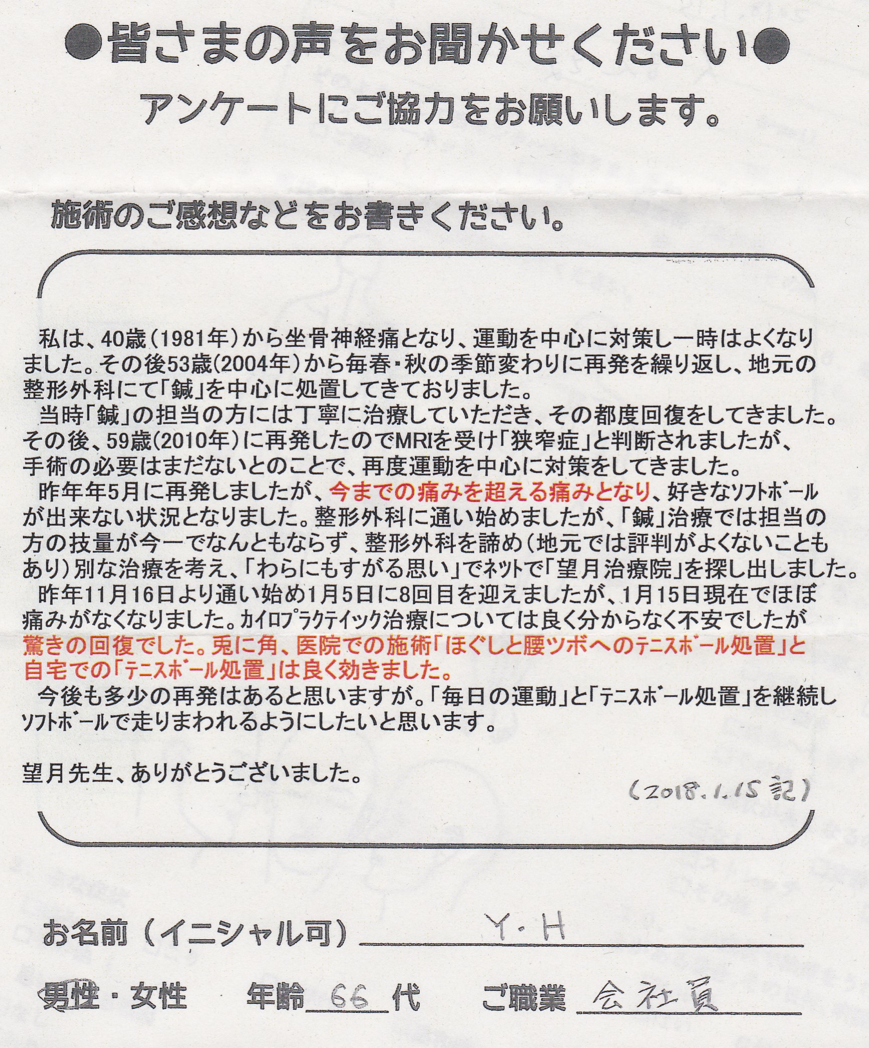 こんにちは!望月治療院の望月です。椎間板ヘルニアで来院した患者様から施術の感想を頂きました。すっかり良くなって私も嬉しいです!ご協力頂きありがとうございました!50代 女性 S,Y様 【品…