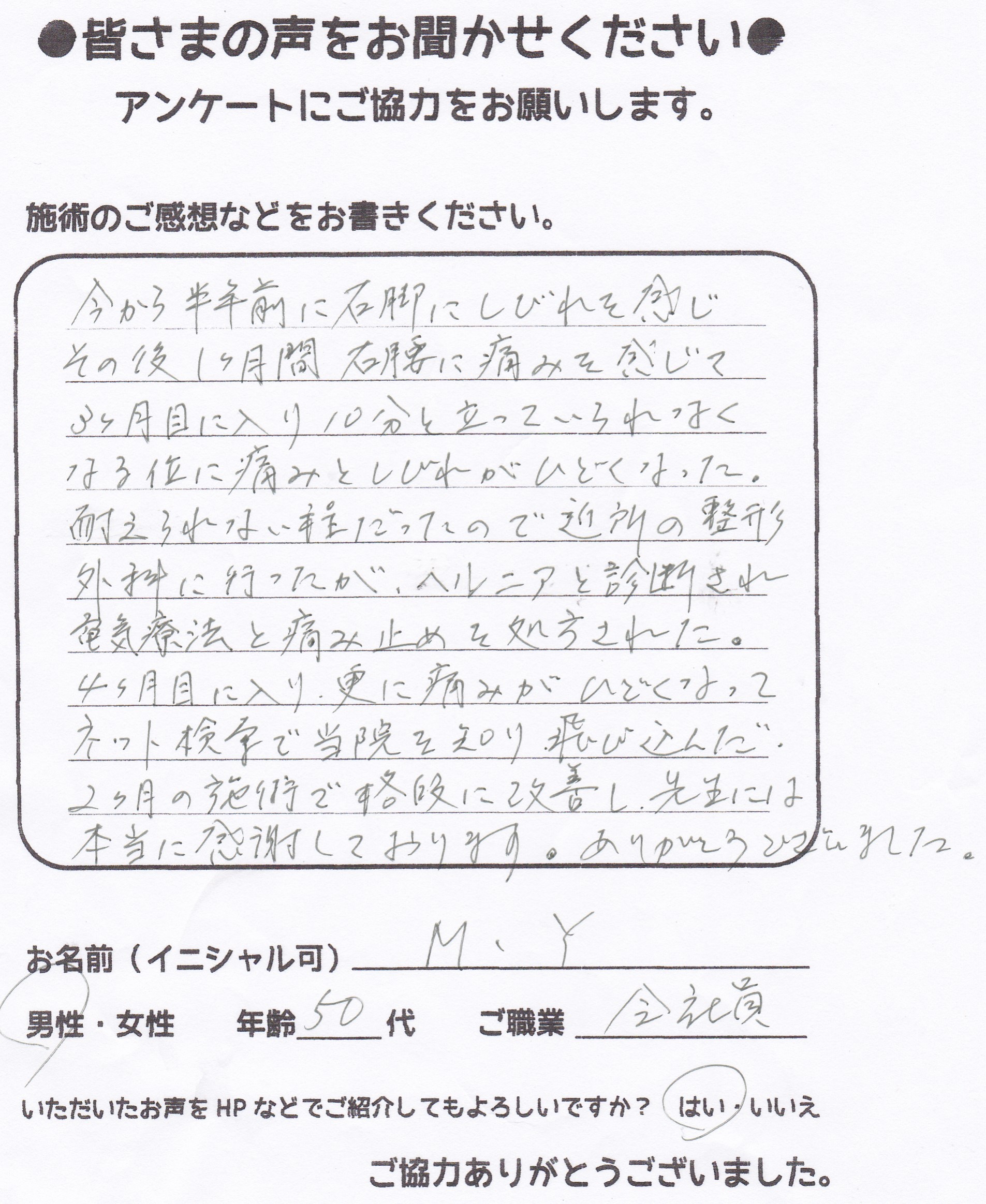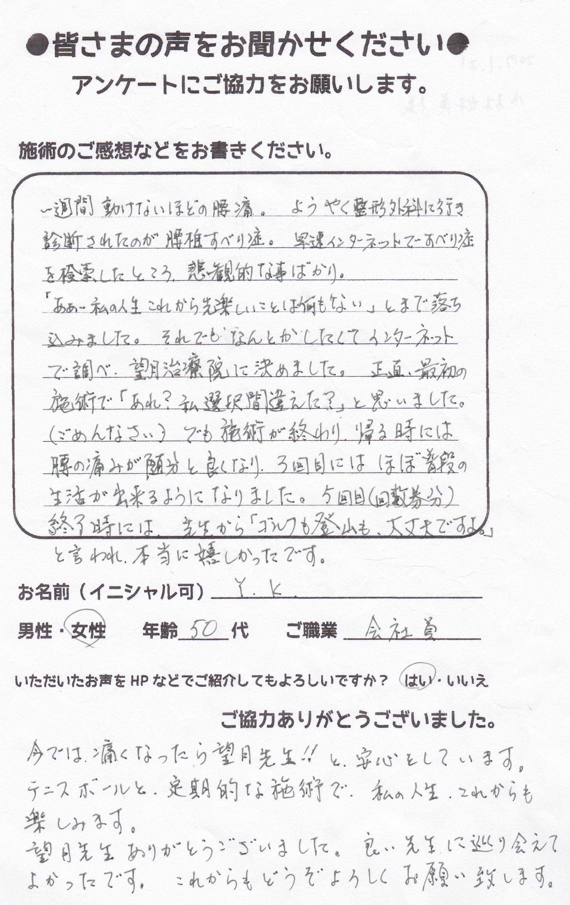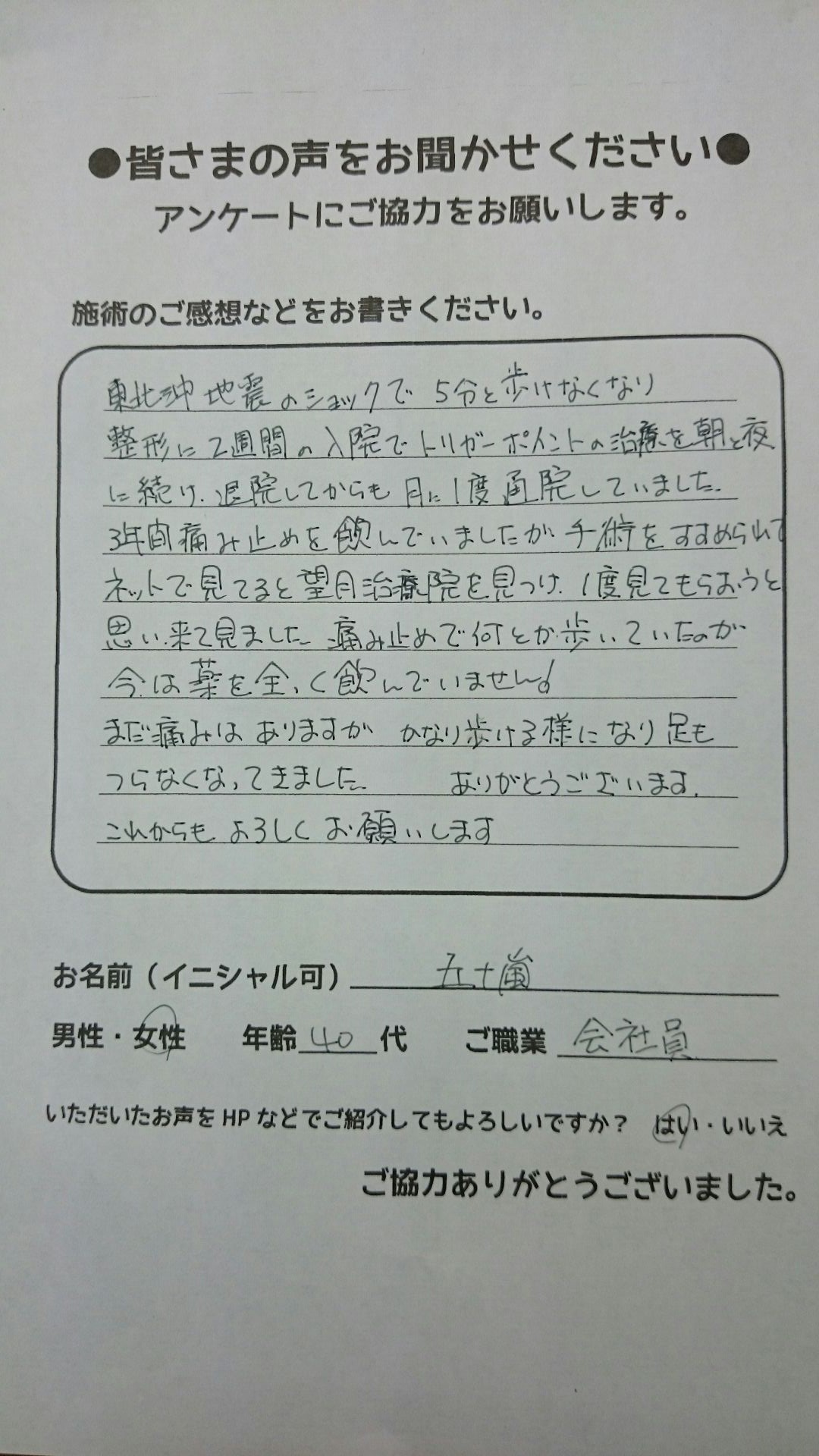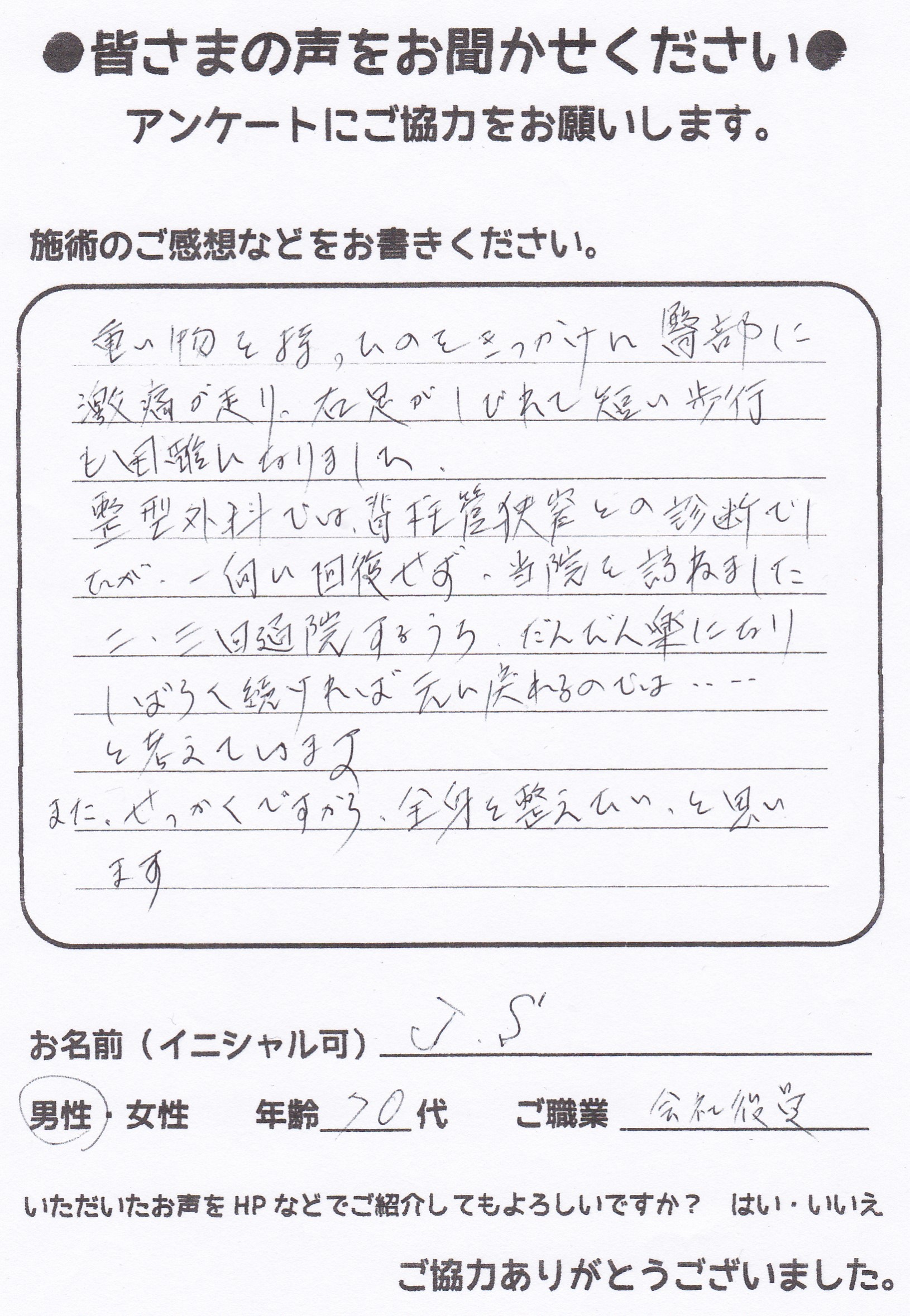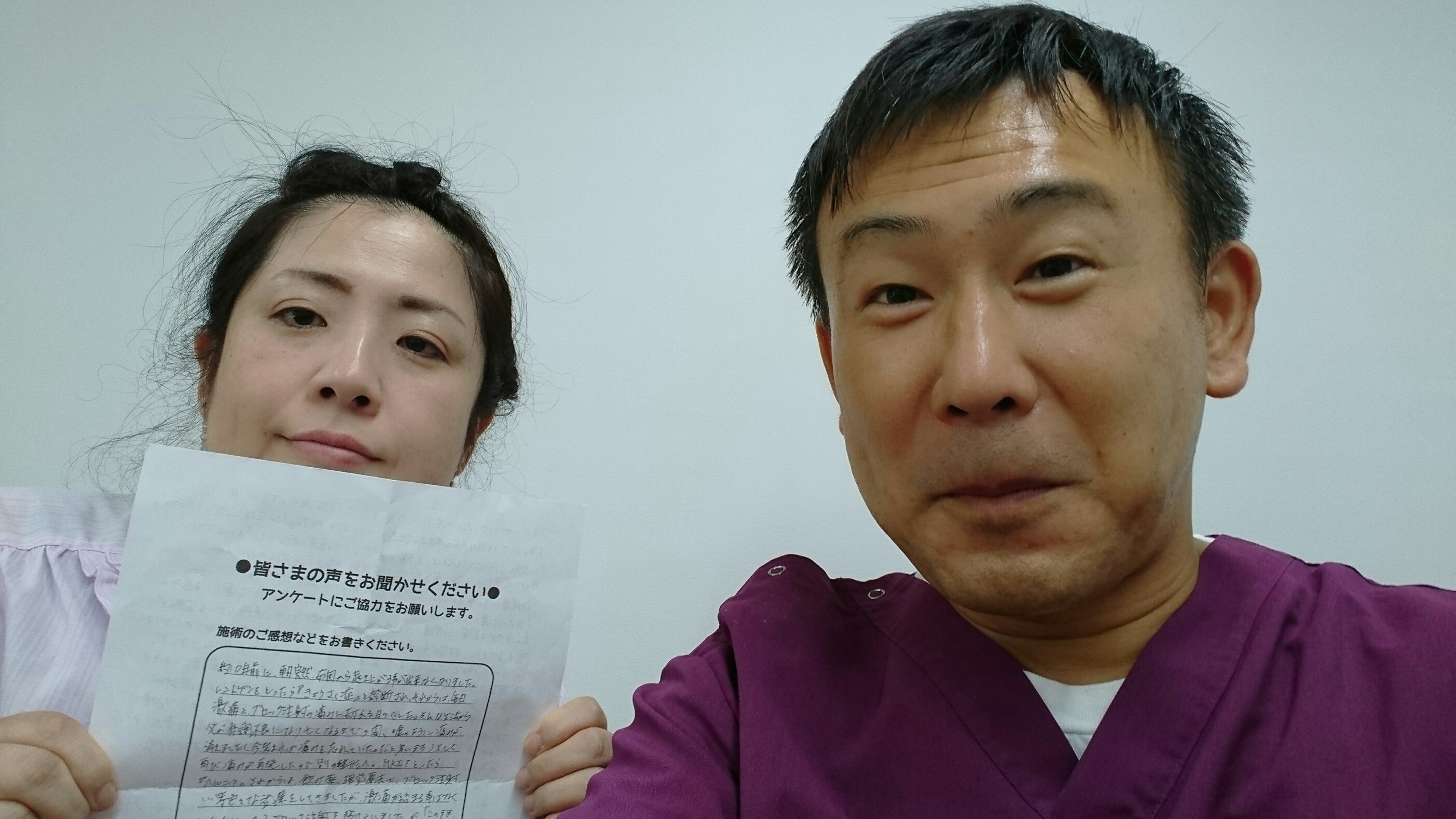 こんにちは!望月治療院の望月です。椎間板ヘルニアで来院した患者様から施術の感想を頂きました。すっかり良くなって私も嬉しいです!ご協力頂きありがとうございました!50代 女性 S,Y様 【品…