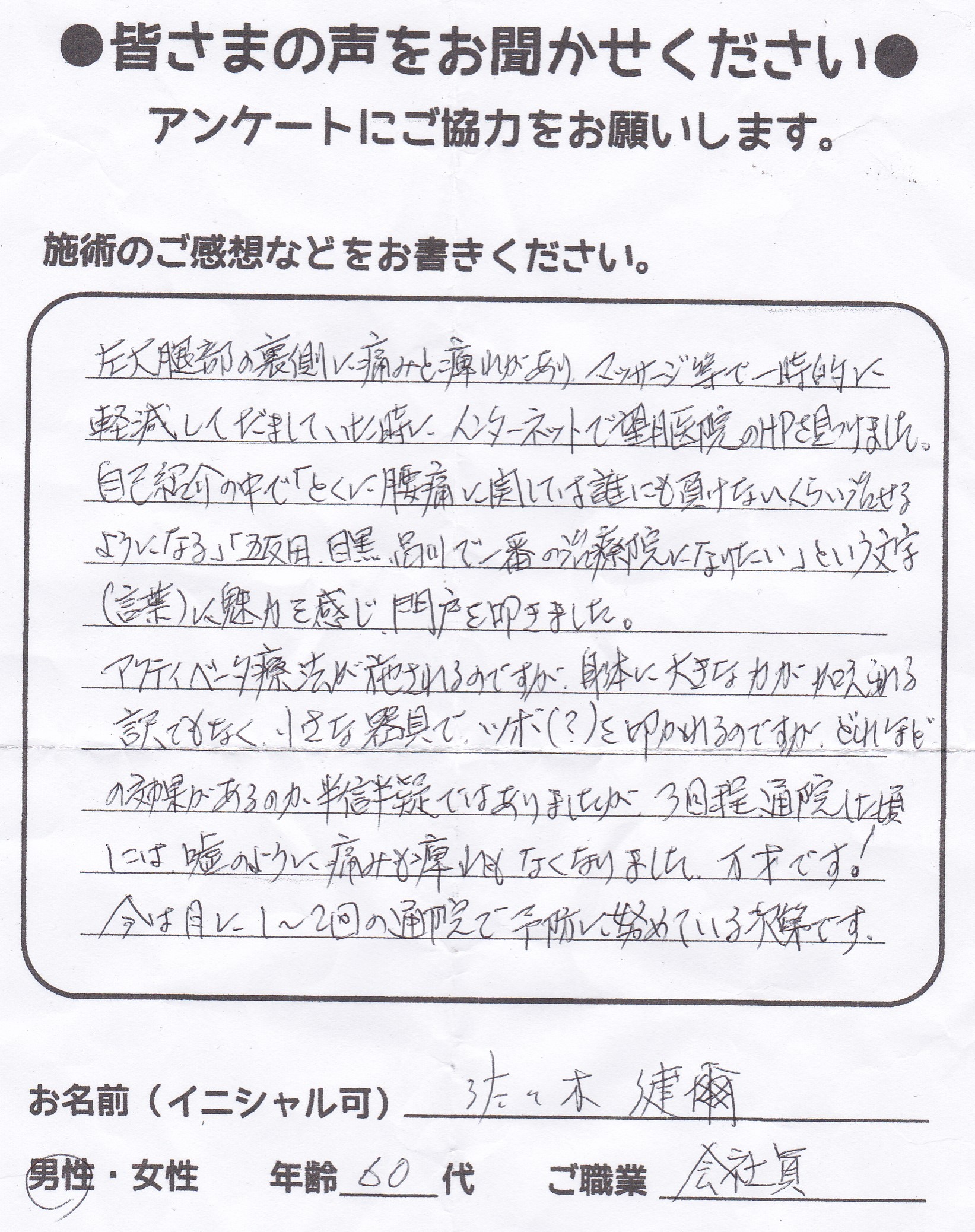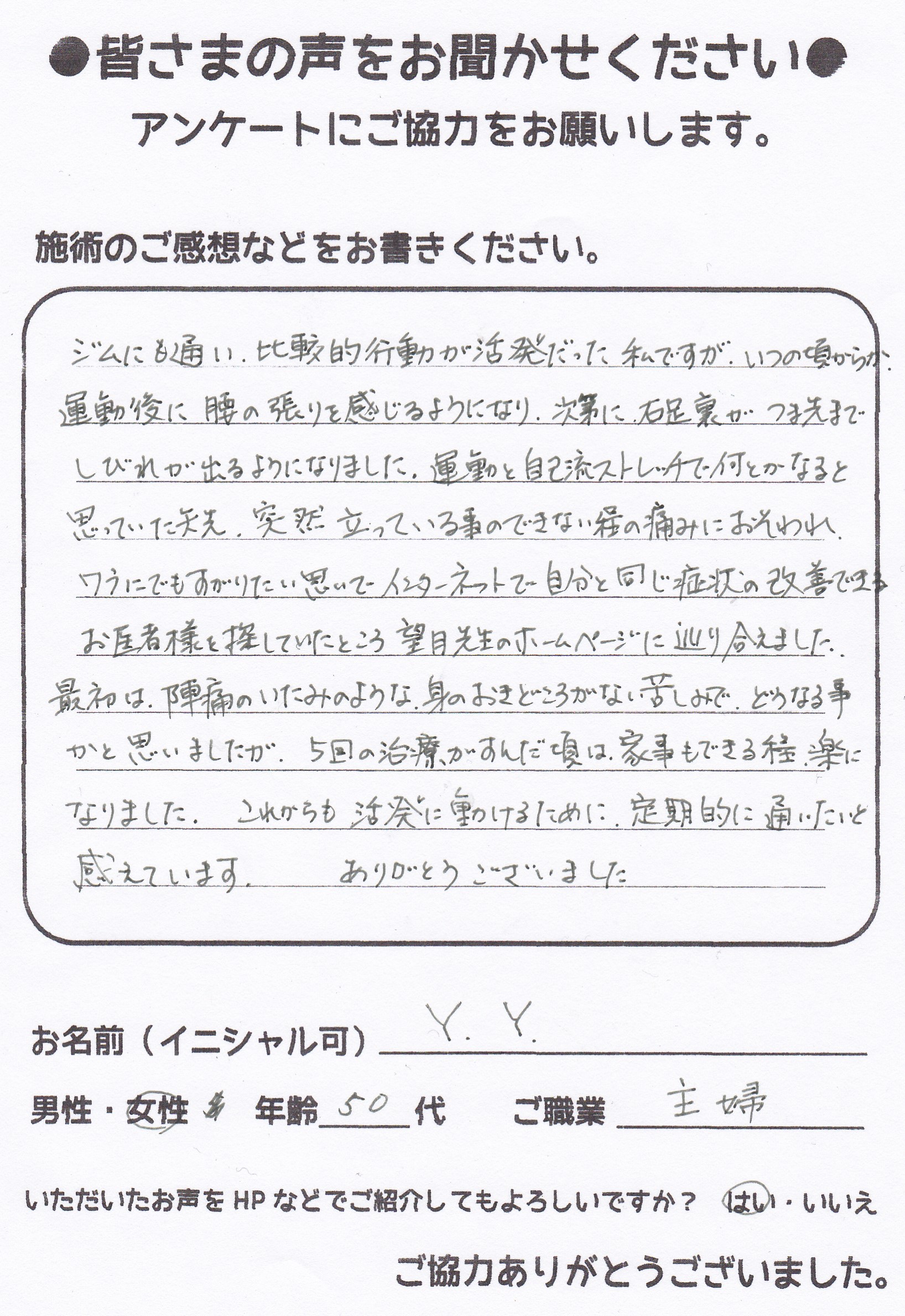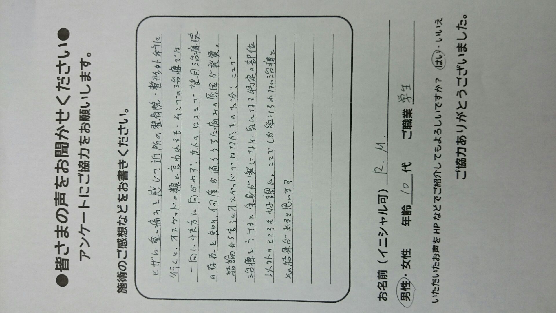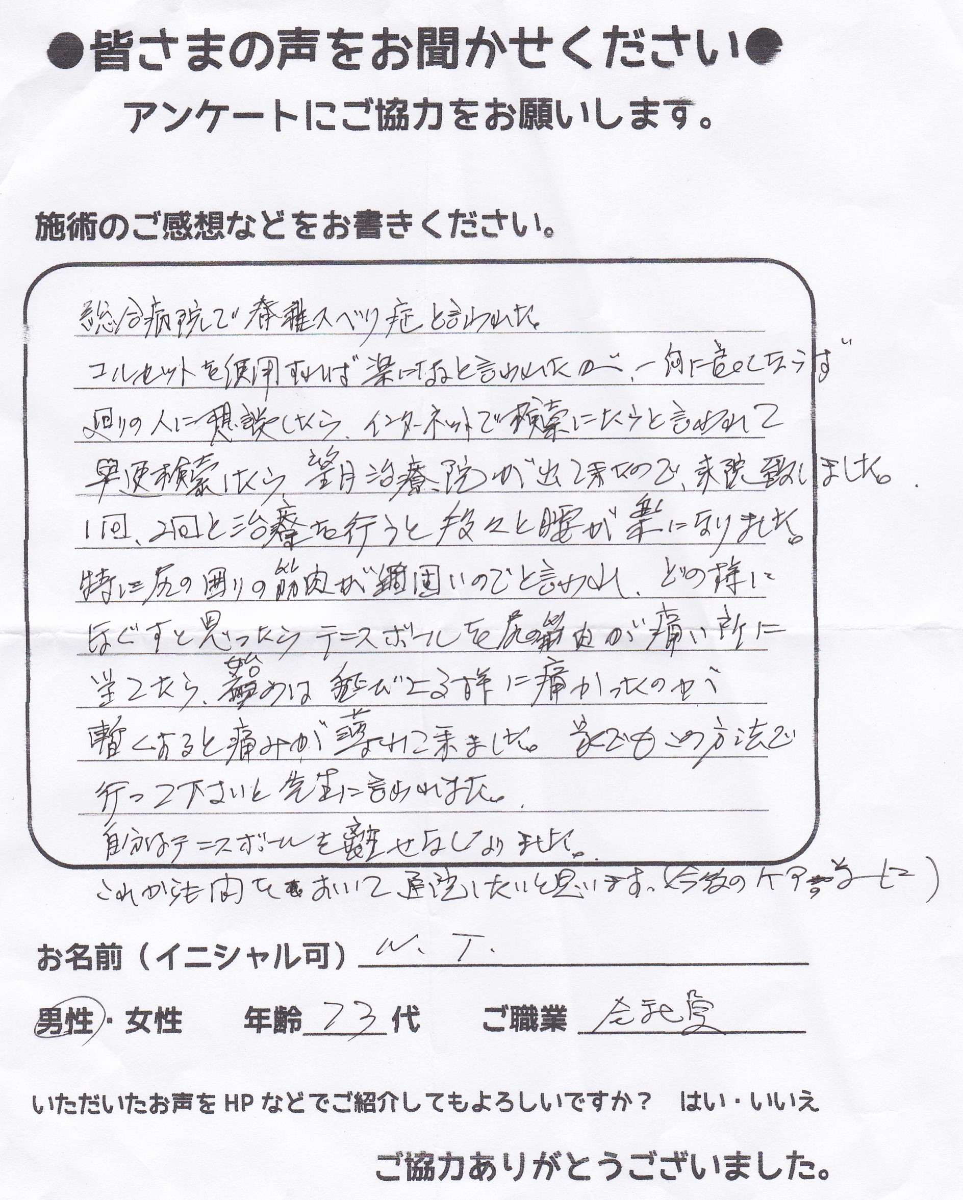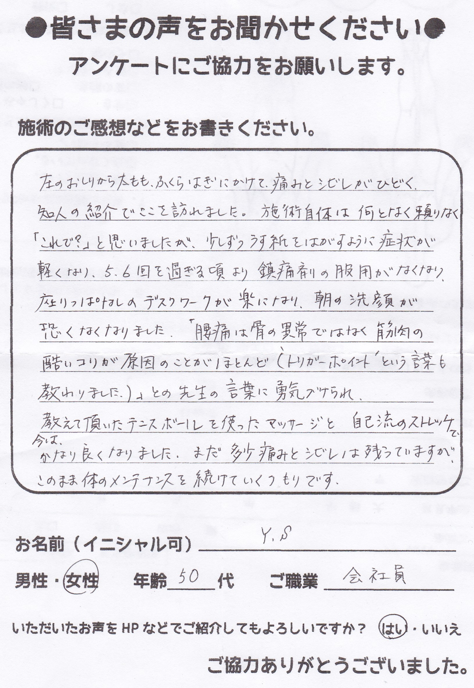 こんにちは!望月治療院の望月です。椎間板ヘルニアで来院した患者様から施術の感想を頂きました。すっかり良くなって私も嬉しいです!ご協力頂きありがとうございました!50代 女性 S,Y様 【品…