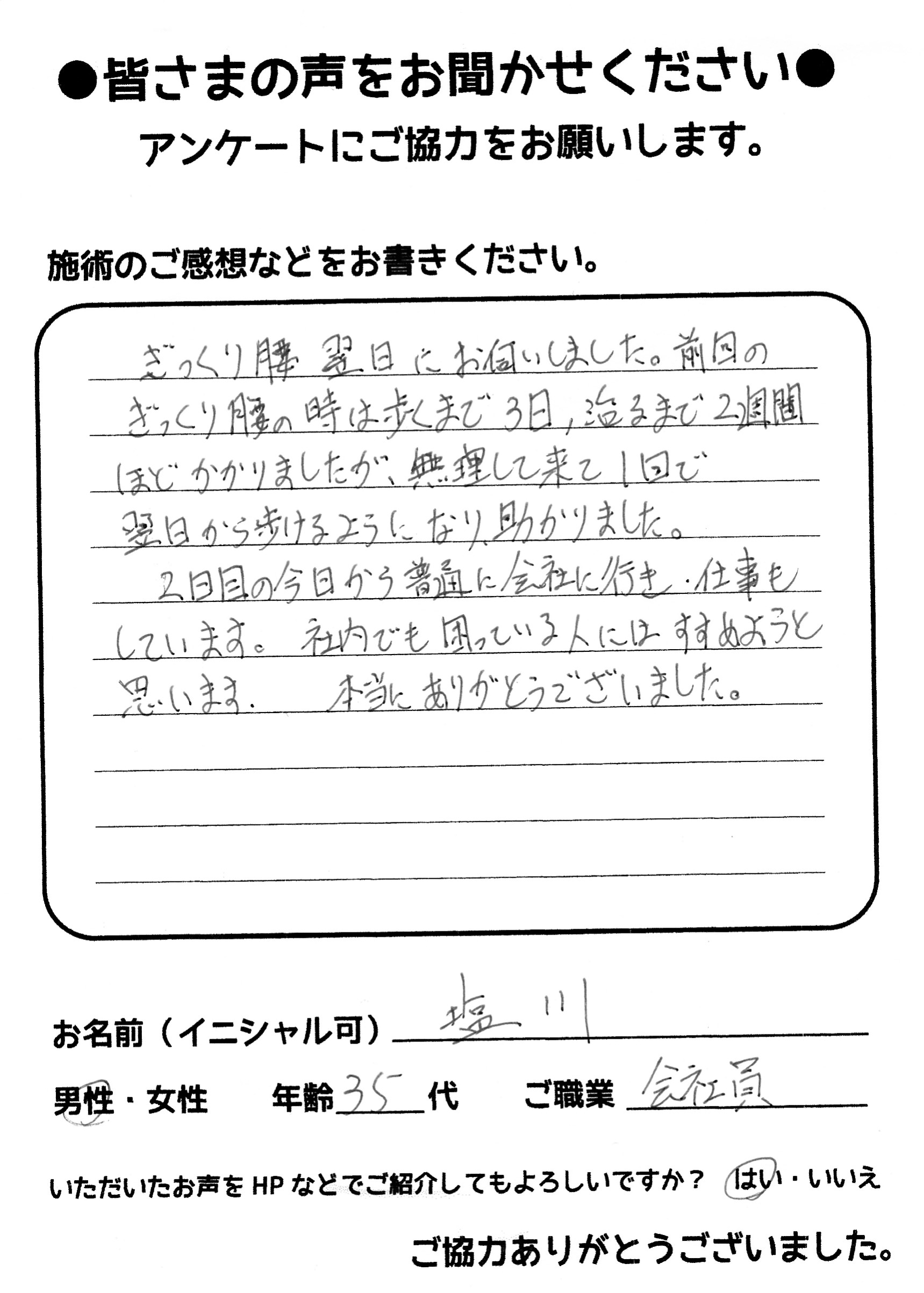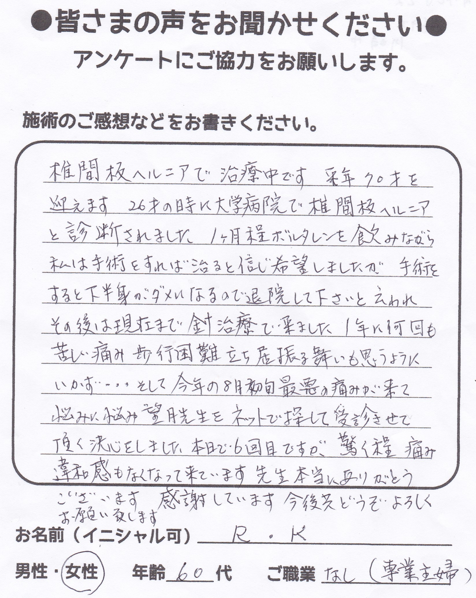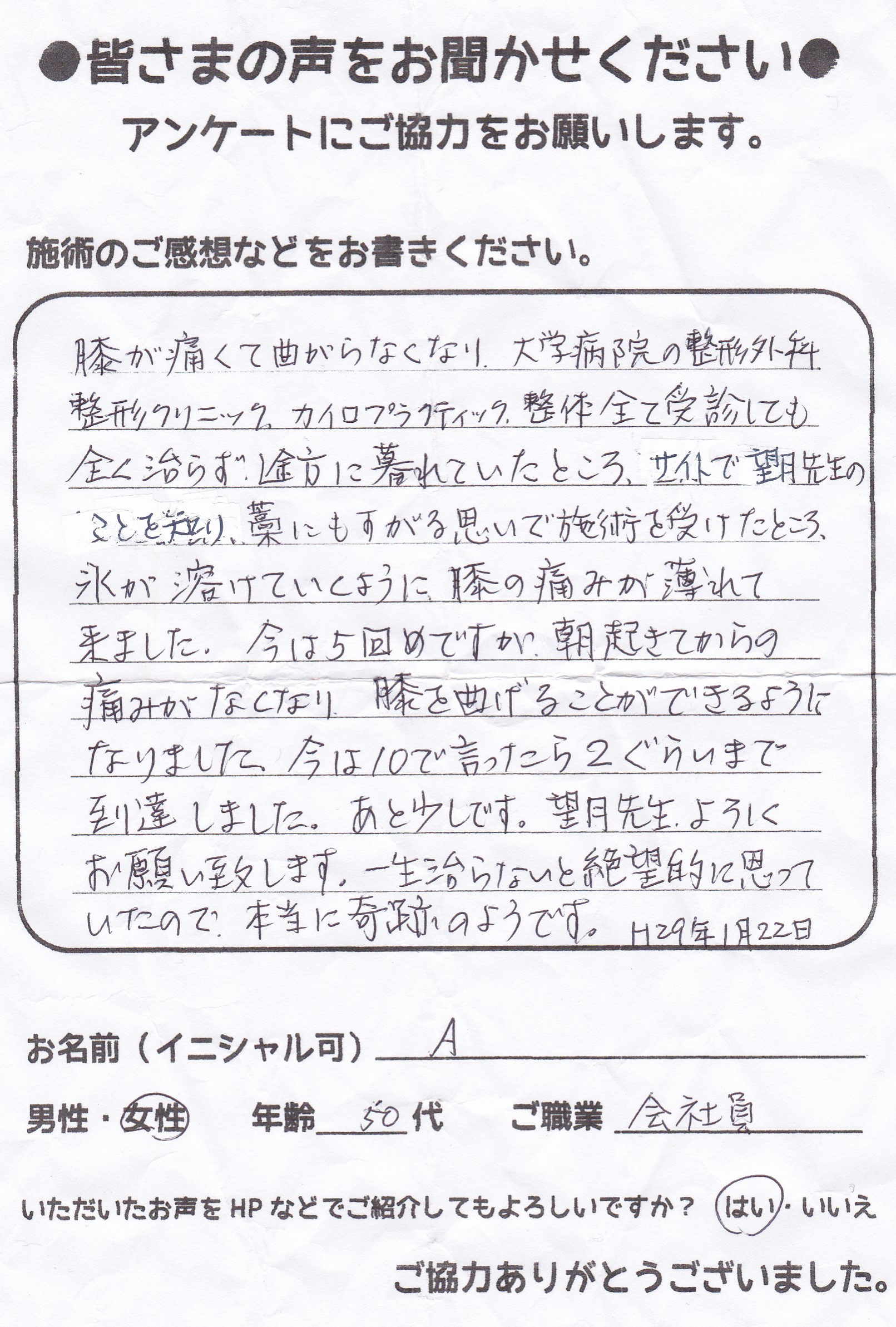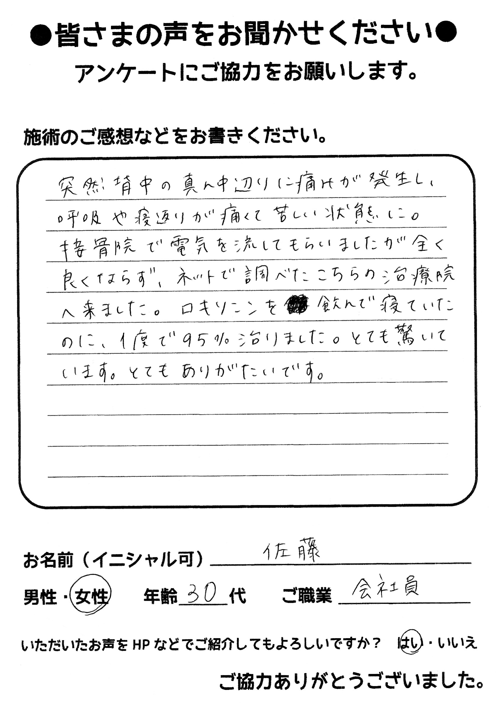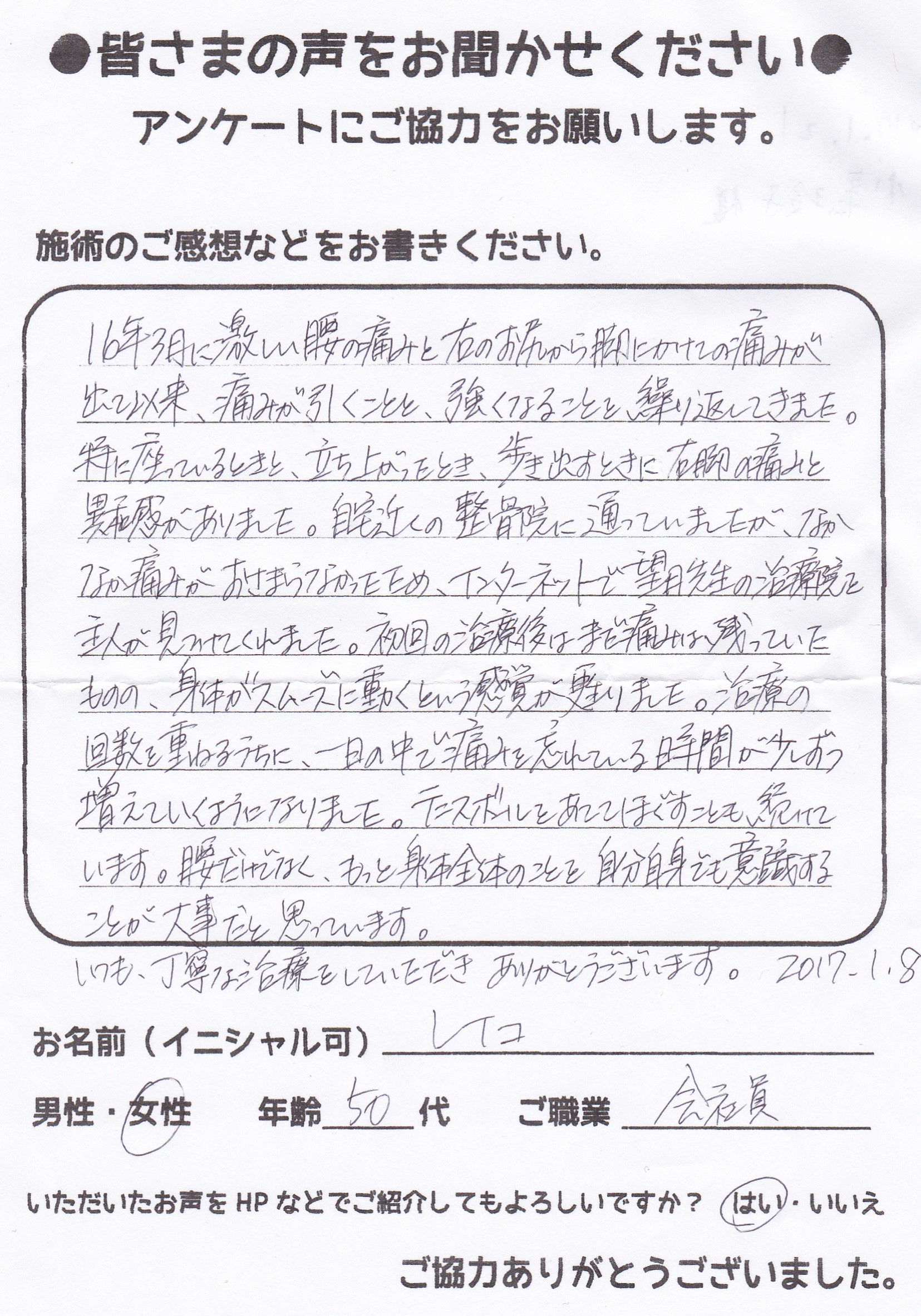 こんにちは!望月治療院の望月です。椎間板ヘルニアで来院した患者様から施術の感想を頂きました。すっかり良くなって私も嬉しいです!ご協力頂きありがとうございました!50代 女性 S,Y様 【品…