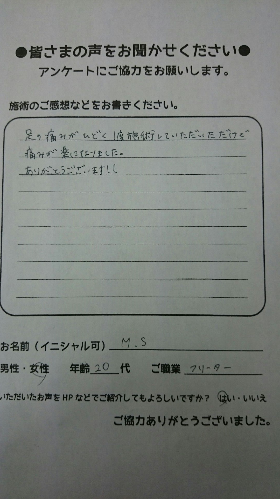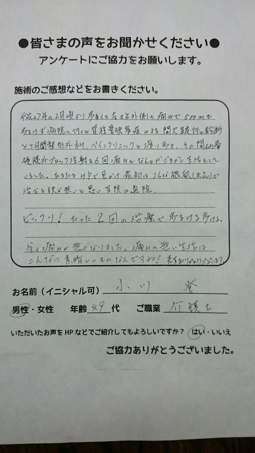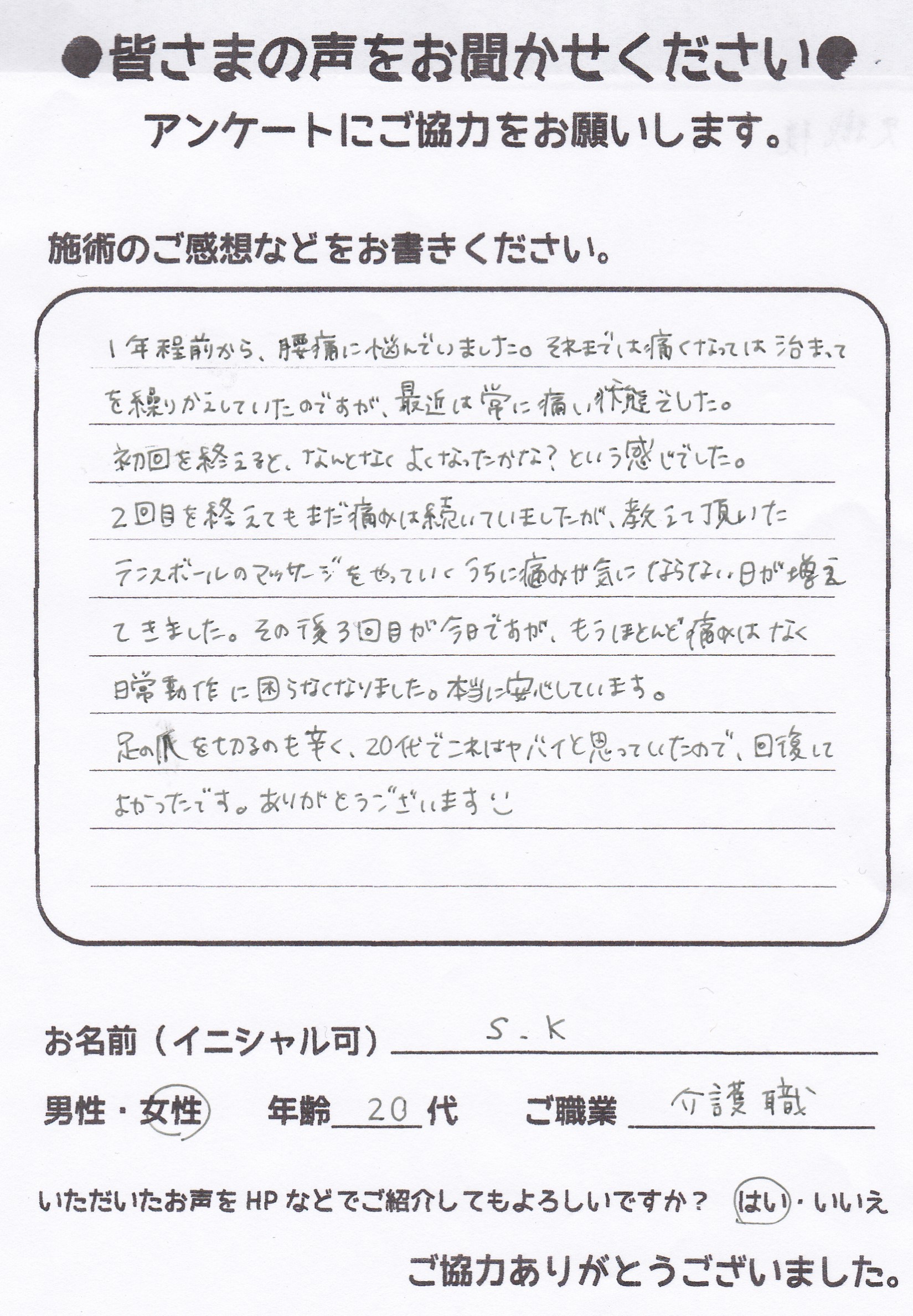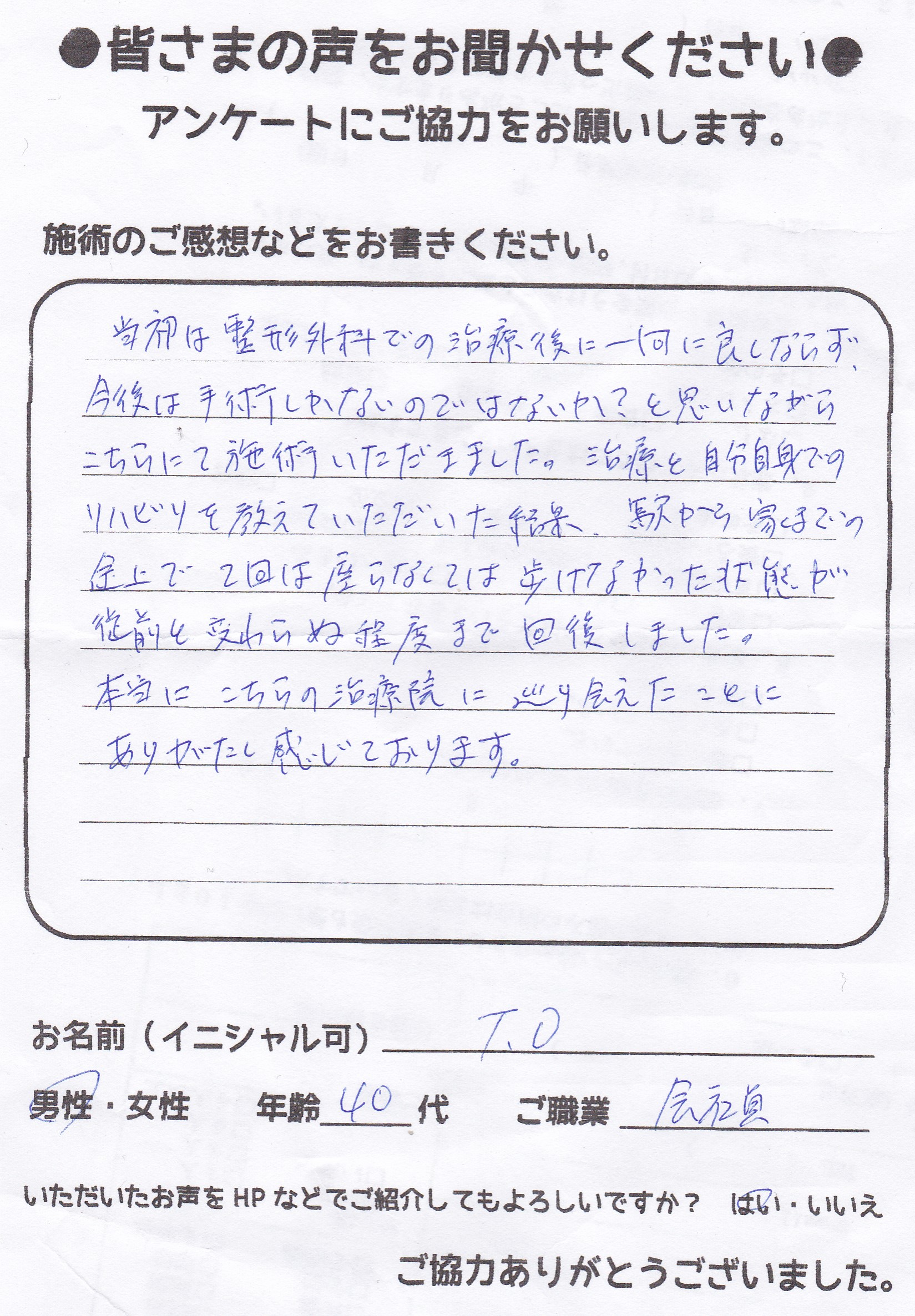 こんにちは!望月治療院の望月です。椎間板ヘルニアで来院した患者様から施術の感想を頂きました。すっかり良くなって私も嬉しいです!ご協力頂きありがとうございました!50代 女性 S,Y様 【品…