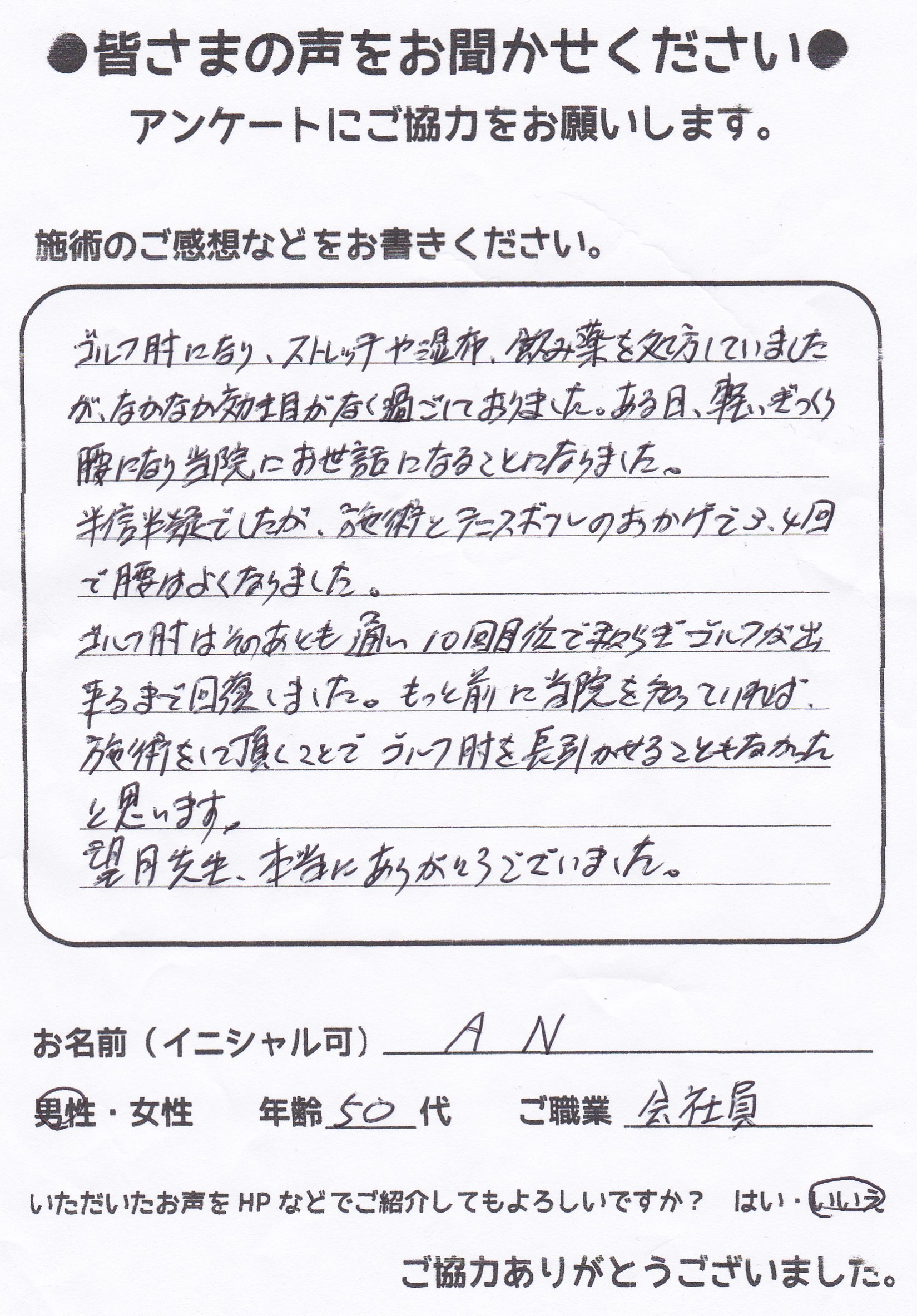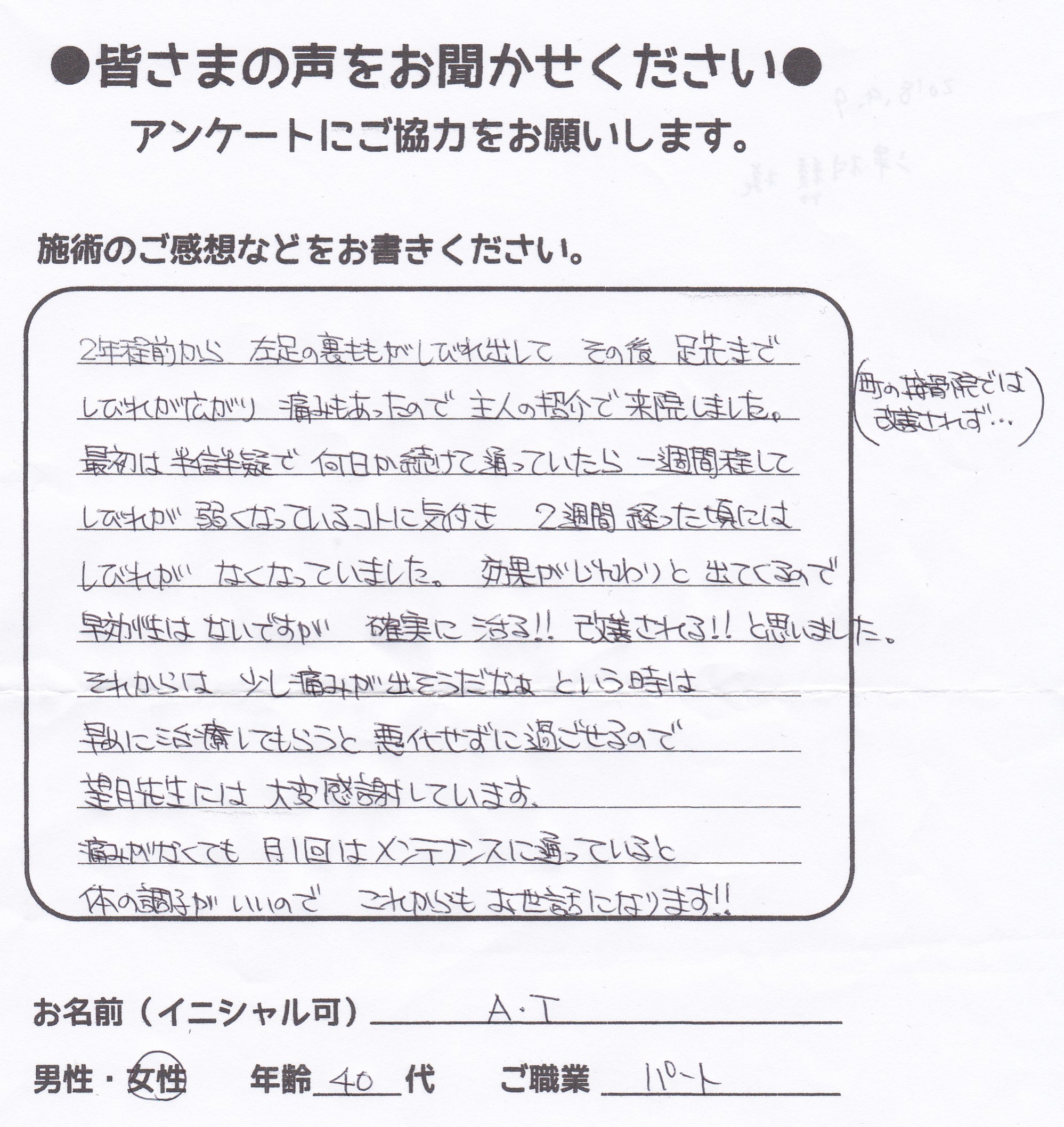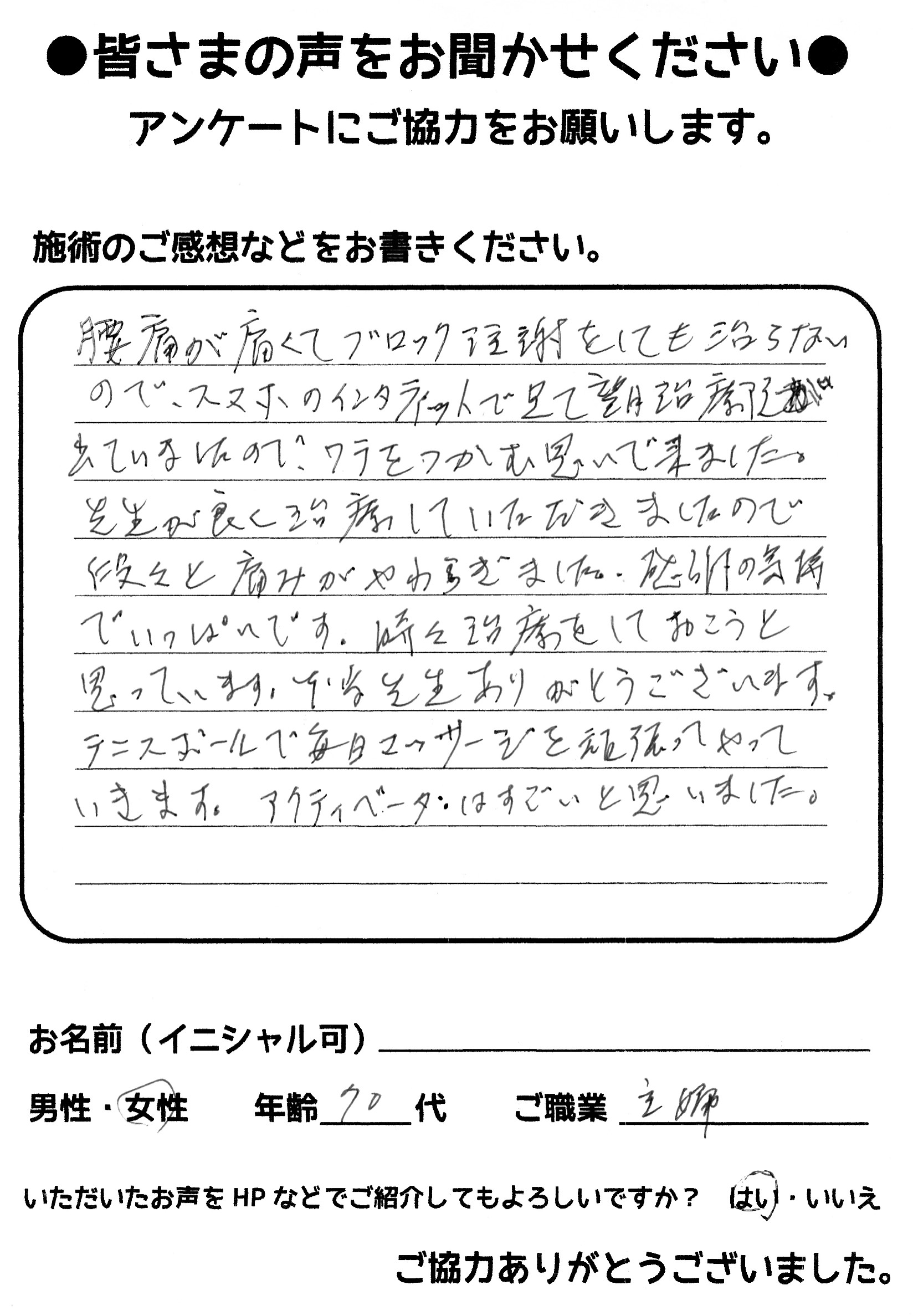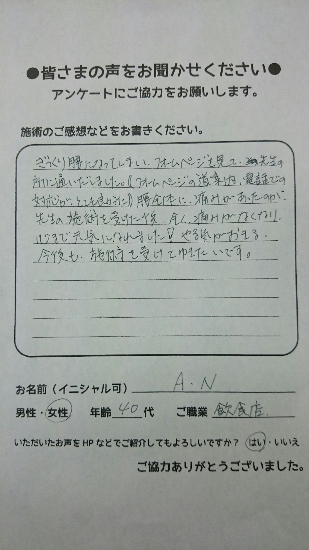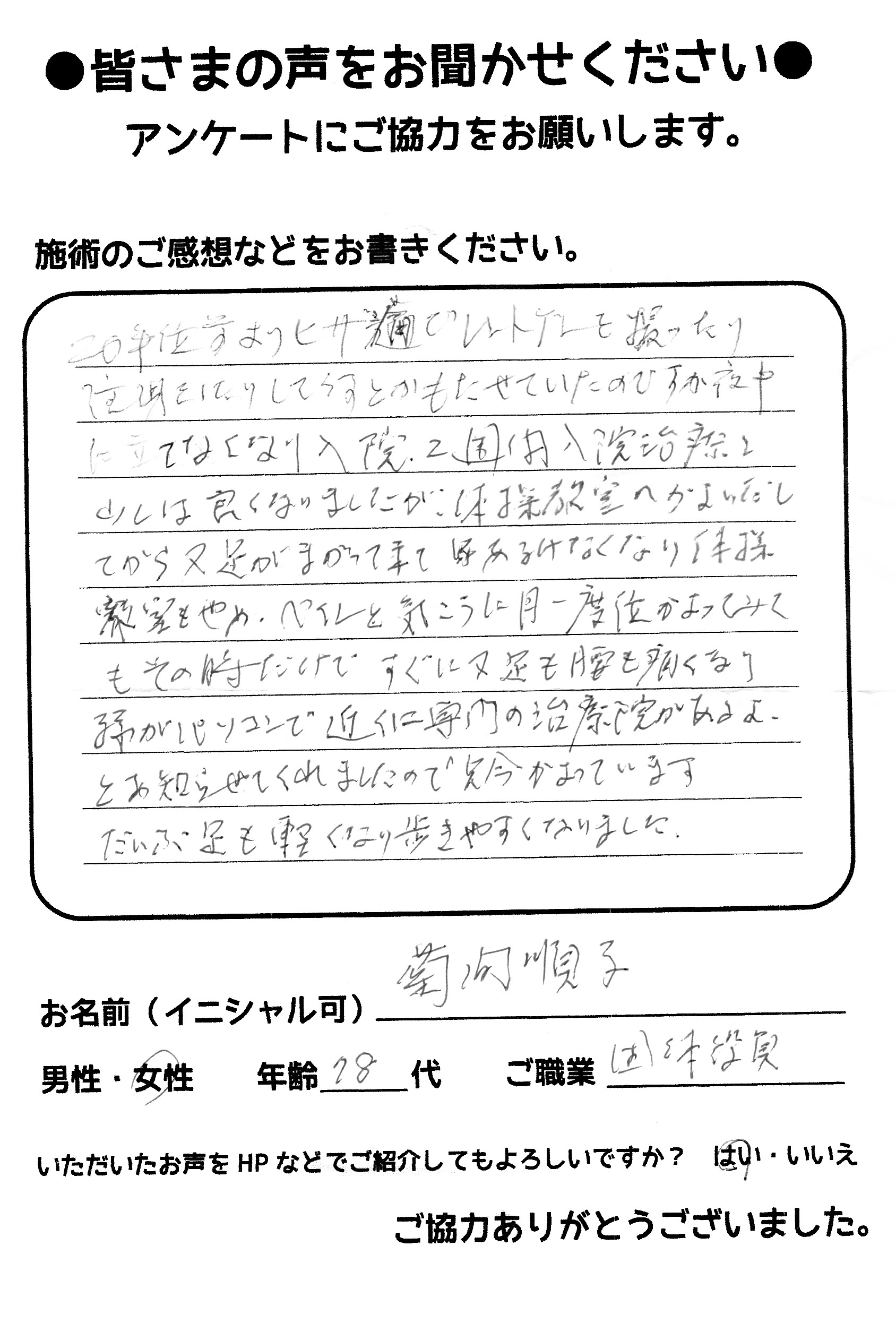 こんにちは!望月治療院の望月です。椎間板ヘルニアで来院した患者様から施術の感想を頂きました。すっかり良くなって私も嬉しいです!ご協力頂きありがとうございました!50代 女性 S,Y様 【品…