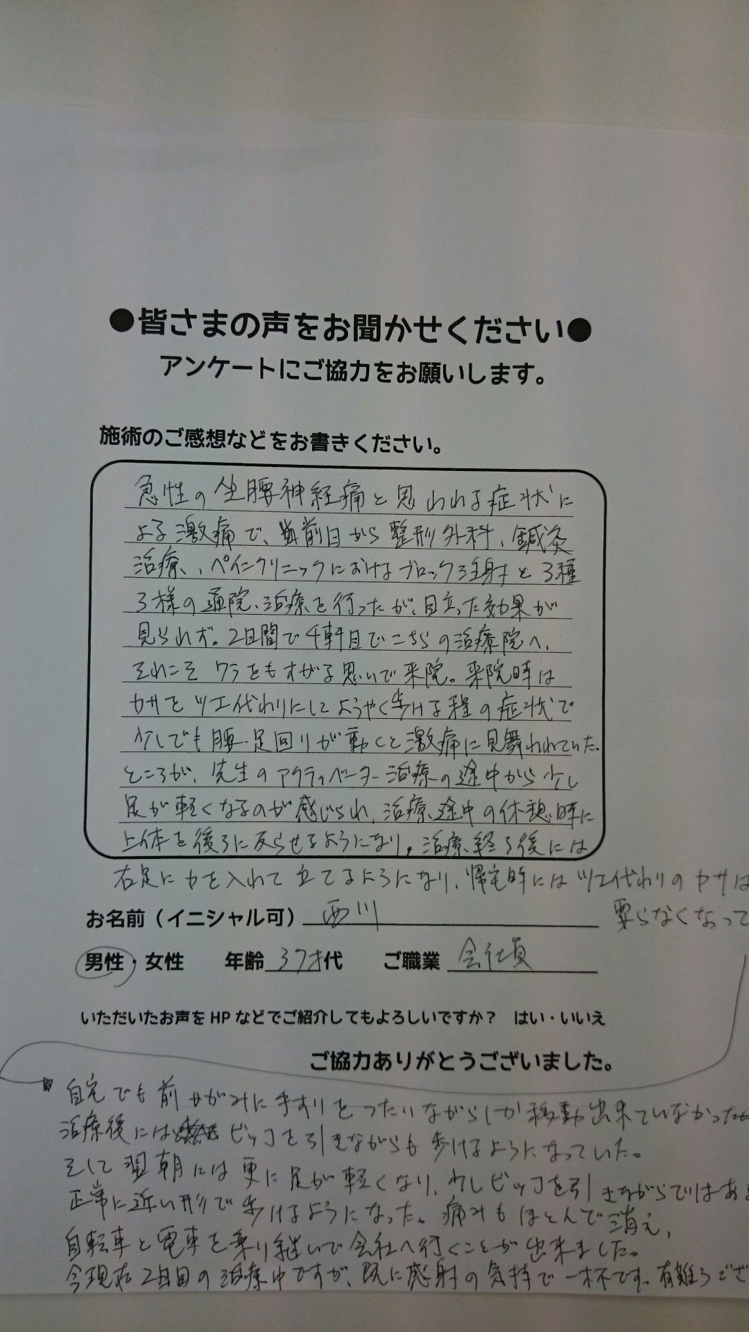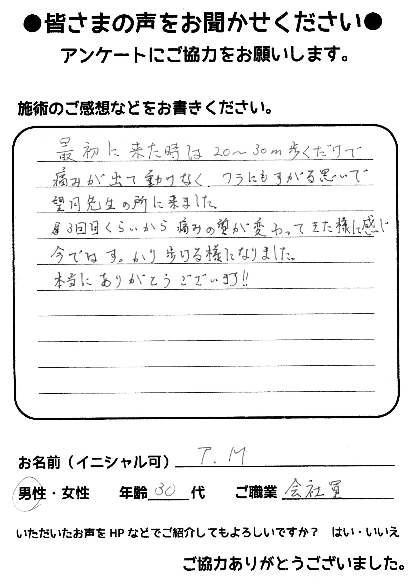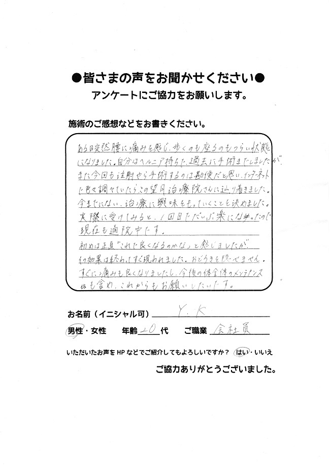 望月治療院の望月です!椎間板ヘルニアと整形外科で診断され板橋区からお越し下さった患者様から施術の感想を頂きました。ご協力頂きありがとうございました!30代 男性 H,Y様 【板橋区】 『椎間板…