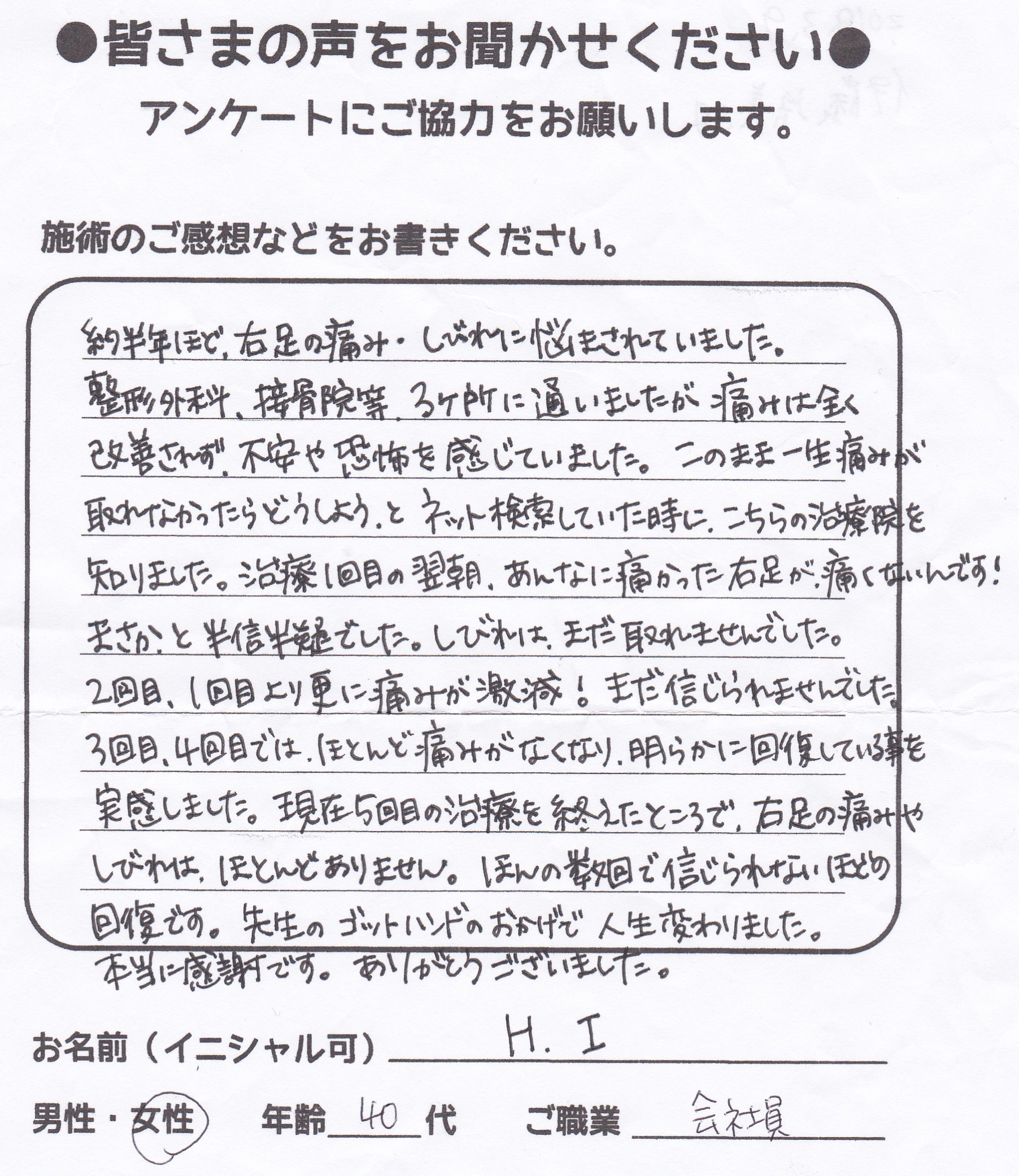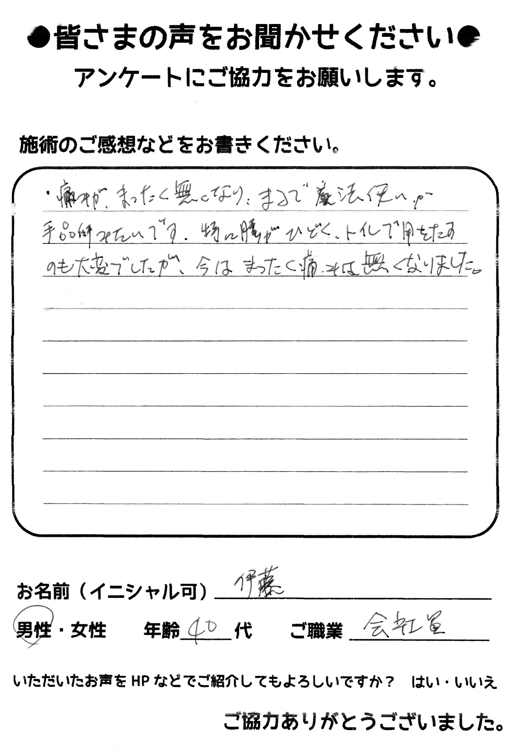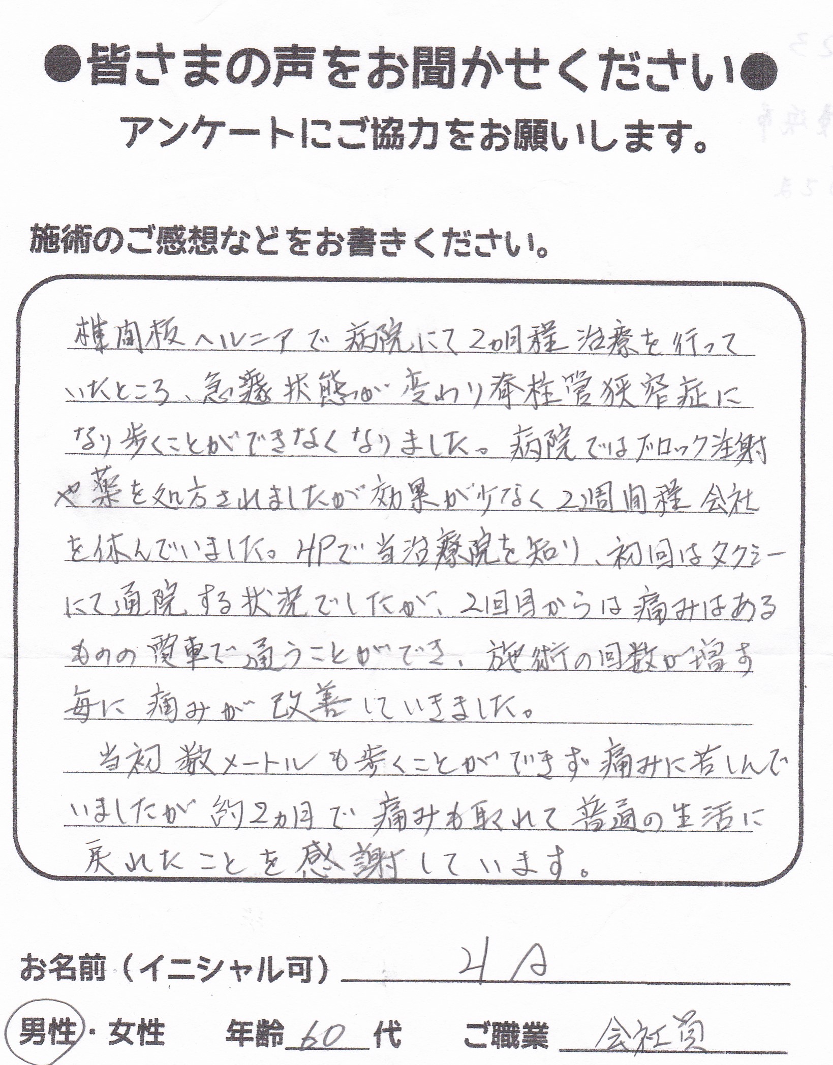 望月治療院の望月です!椎間板ヘルニアと整形外科で診断され板橋区からお越し下さった患者様から施術の感想を頂きました。ご協力頂きありがとうございました!30代 男性 H,Y様 【板橋区】 『椎間板…