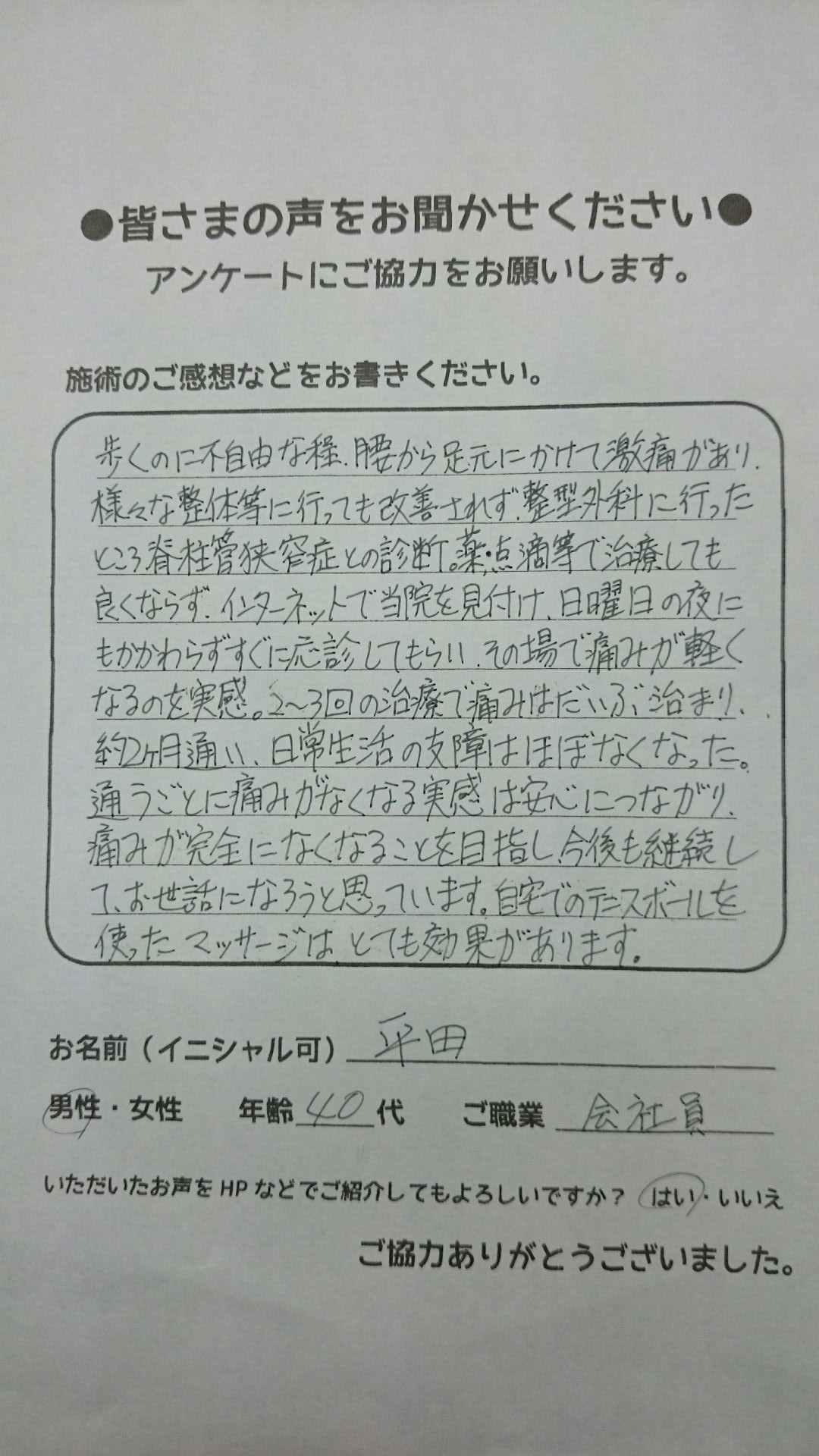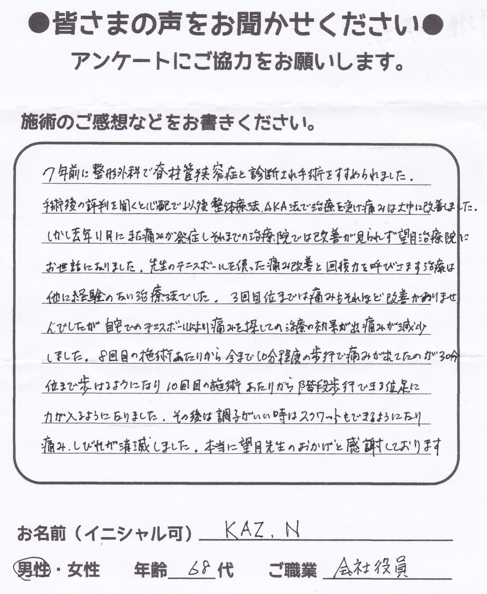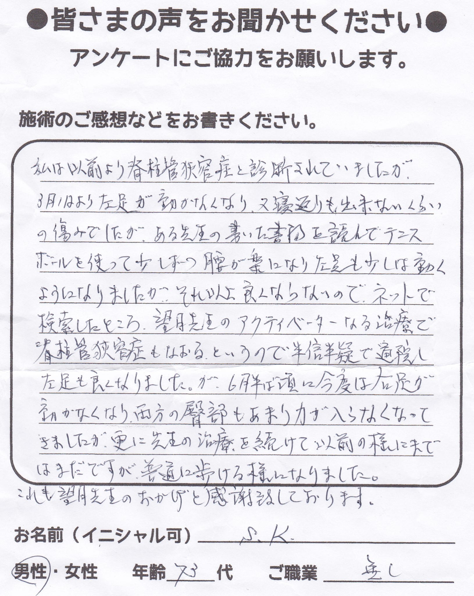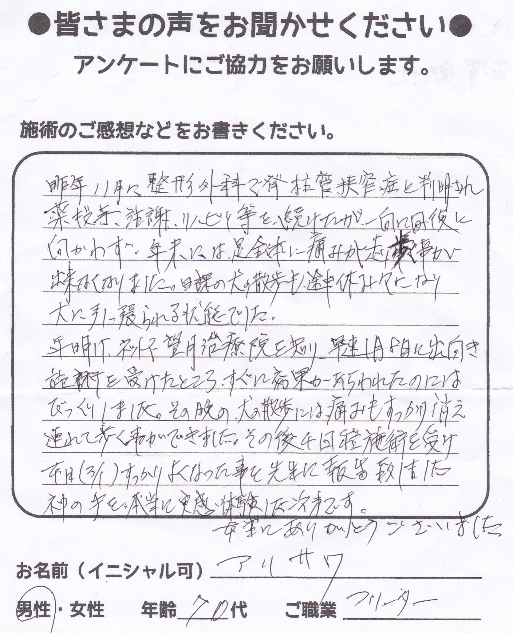 こんにちは!望月です!脊柱管狭窄症と整形外科で診断され葛飾区からお越し下さった患者様から施術の感想を頂きました。ご協力頂いてありがとうございました!80代 男性 F,O様 【江戸川区】 『脊…
