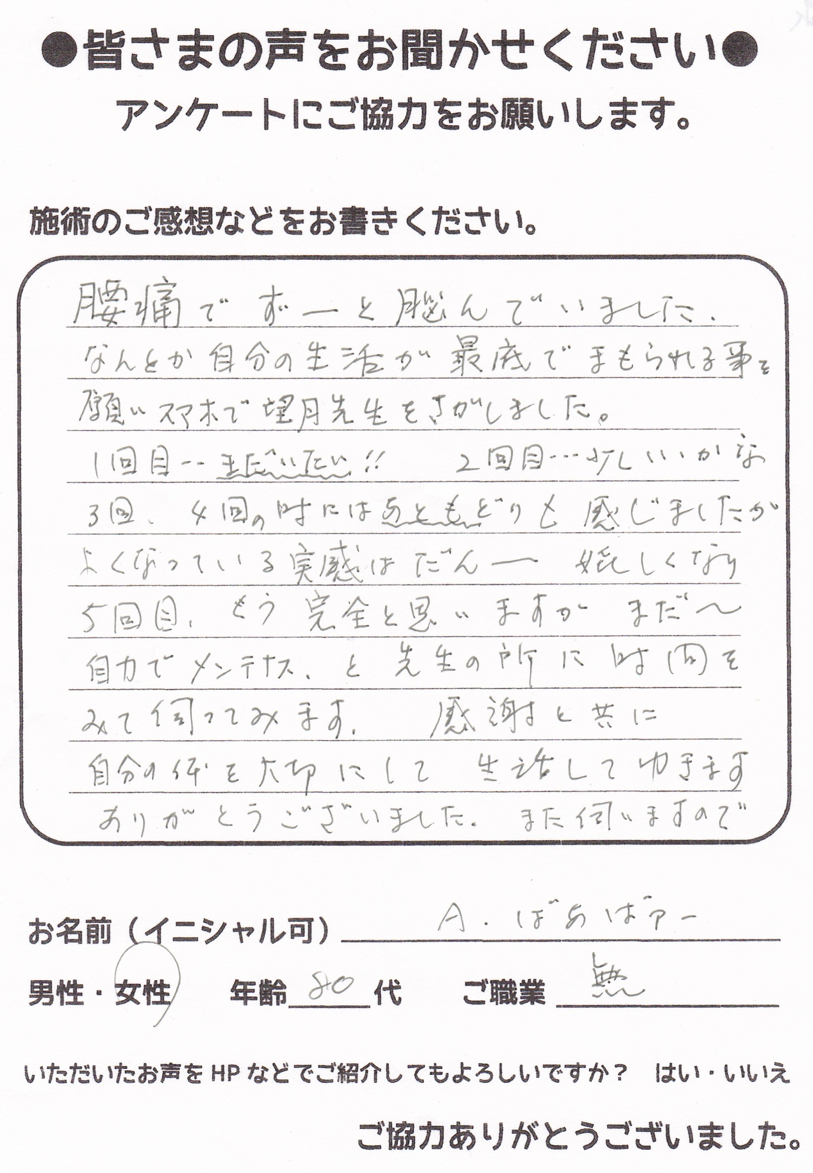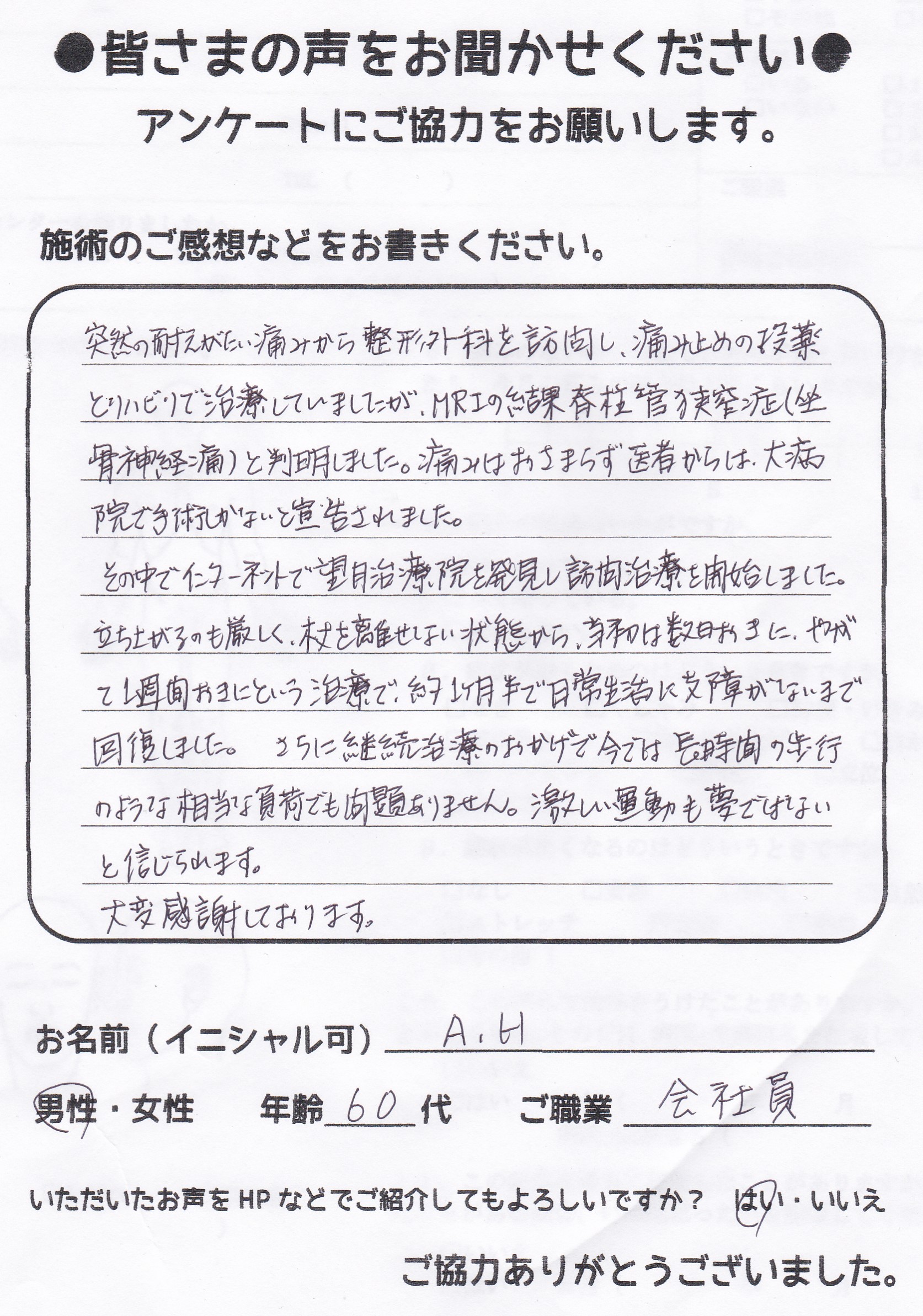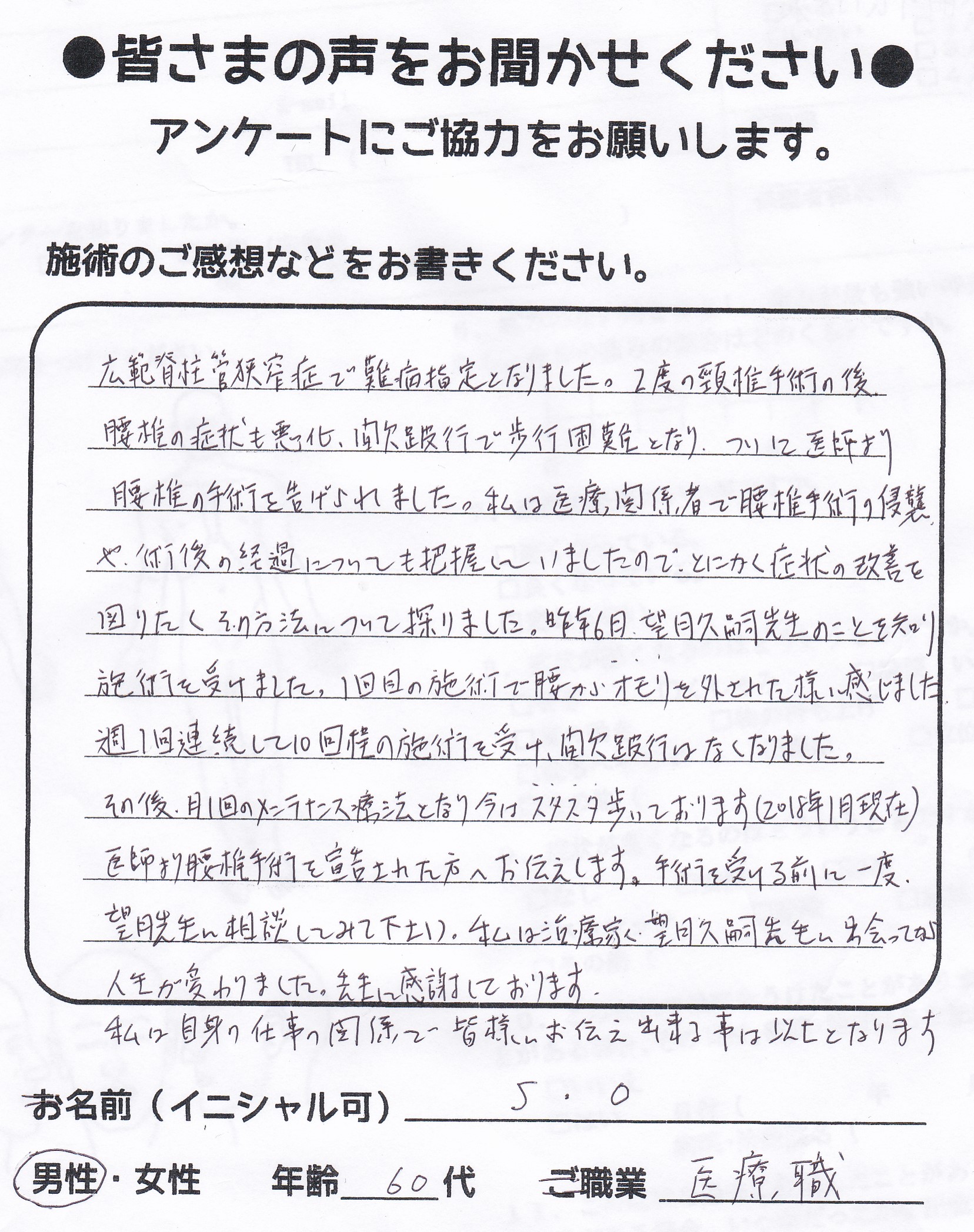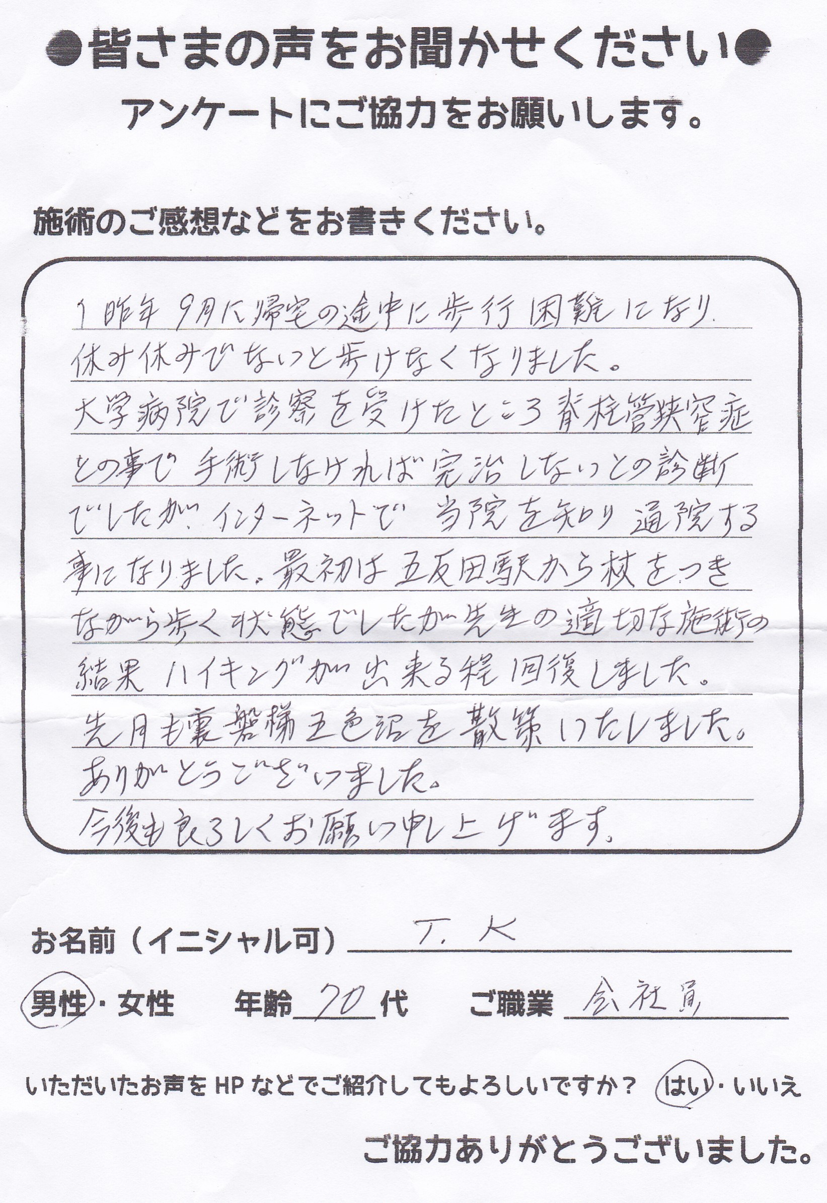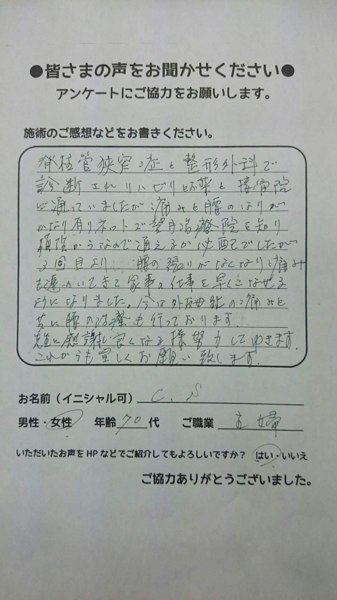 こんにちは!望月です!脊柱管狭窄症と整形外科で診断され葛飾区からお越し下さった患者様から施術の感想を頂きました。ご協力頂いてありがとうございました!80代 男性 F,O様 【江戸川区】 『脊…