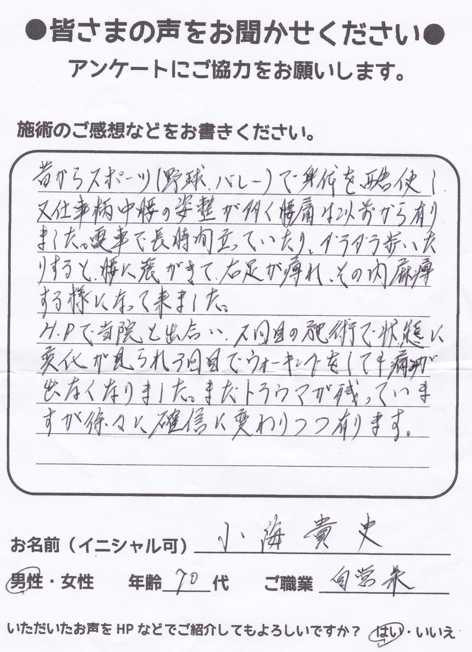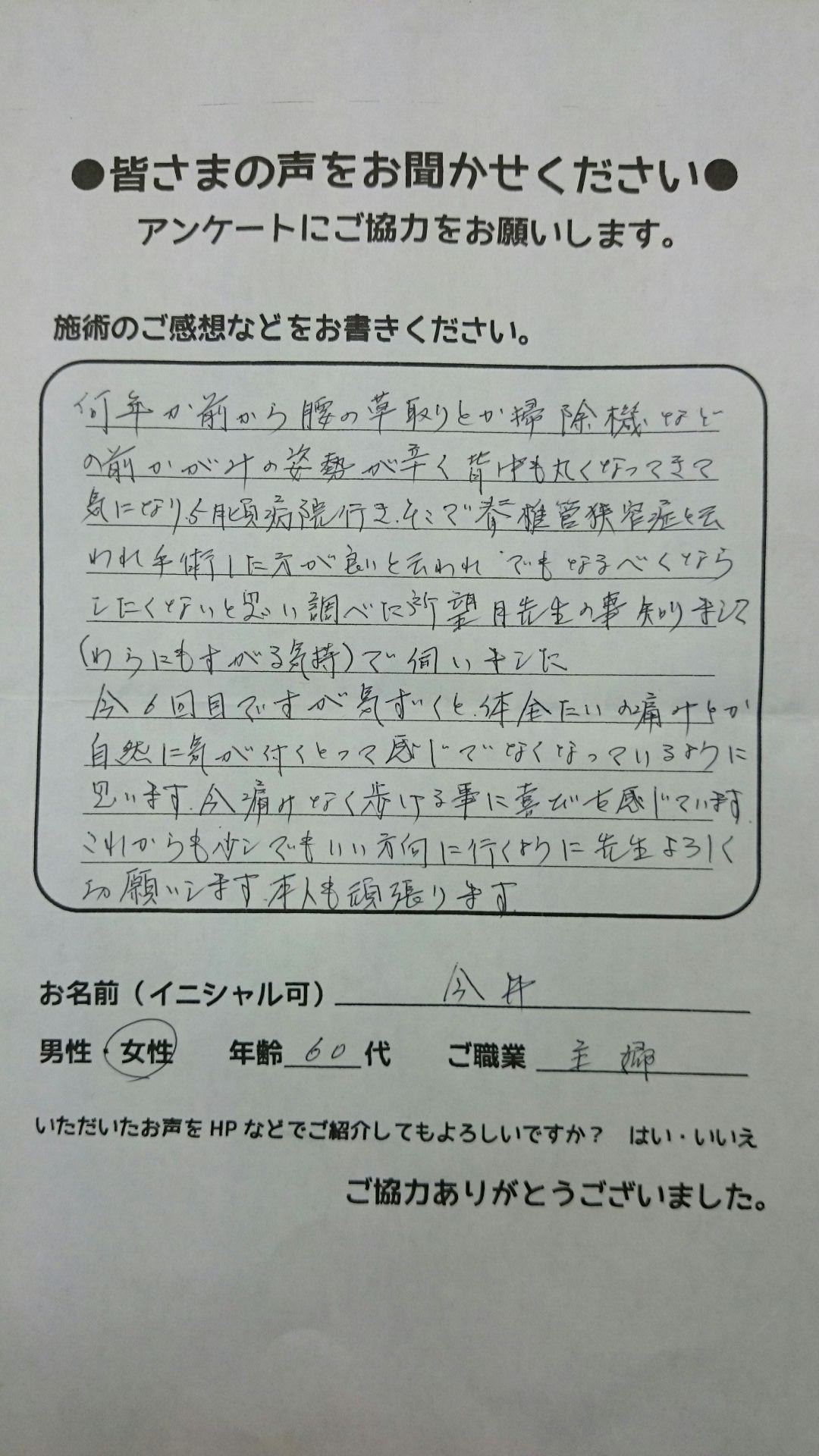こんにちは!望月治療院の望月です。脊柱管狭窄症と整形外科で診断され江東区からお越し頂いた患者様より、治療の感想を頂きました。ご協力頂きありがとうございました!70代 女性 【江東区】 『脊柱…