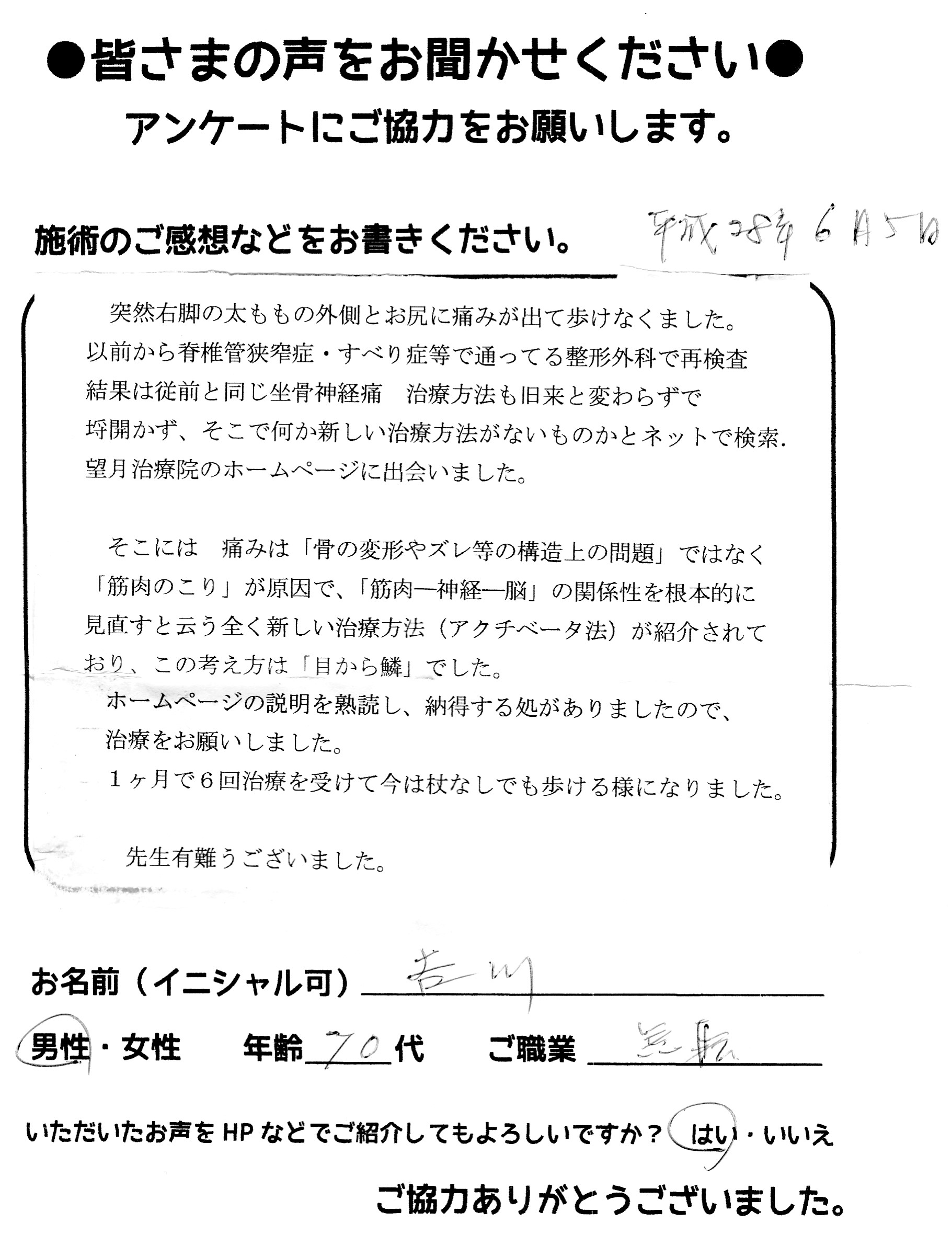 こんにちは!望月治療院の望月です。脊柱管狭窄症による坐骨神経つで来院して下さった患者様から施術の感想を頂きました。ご協力頂きましてありがとうございました!80代 男性 S.I様 『脊柱管…
