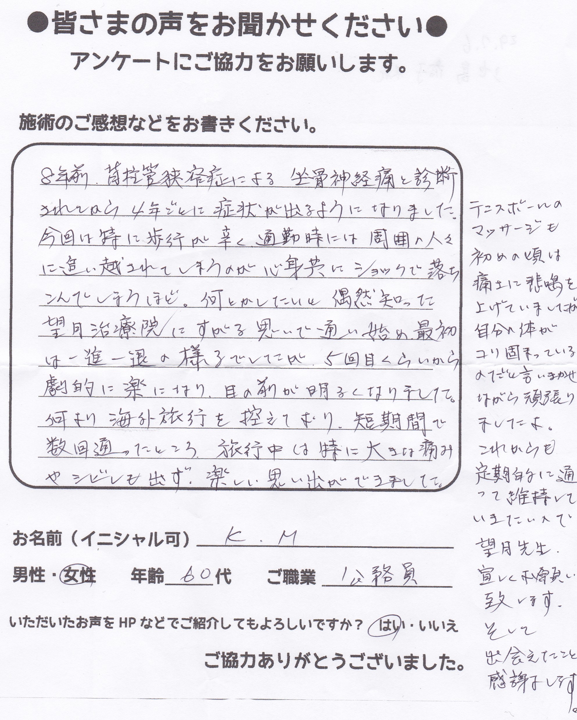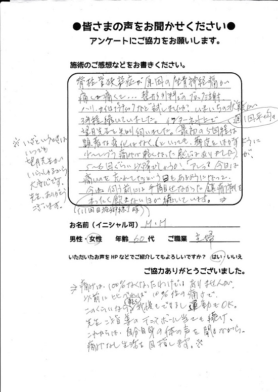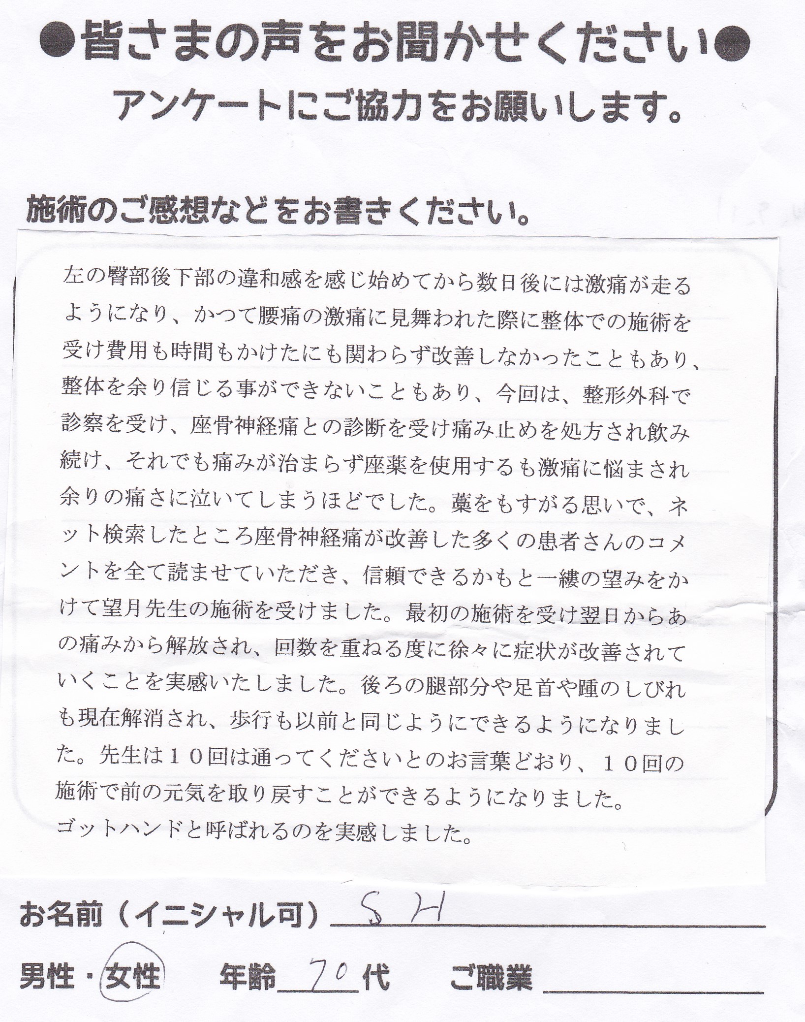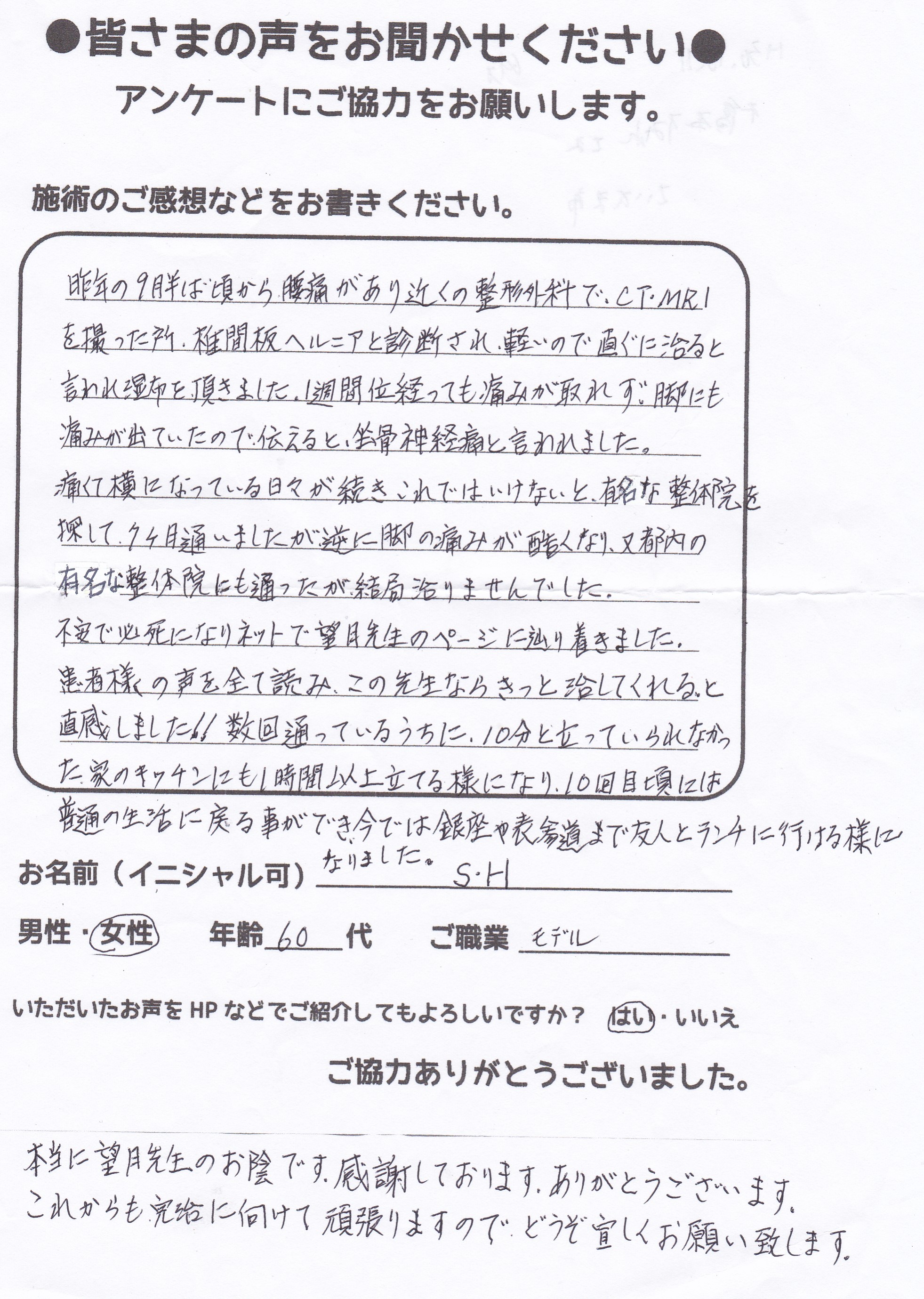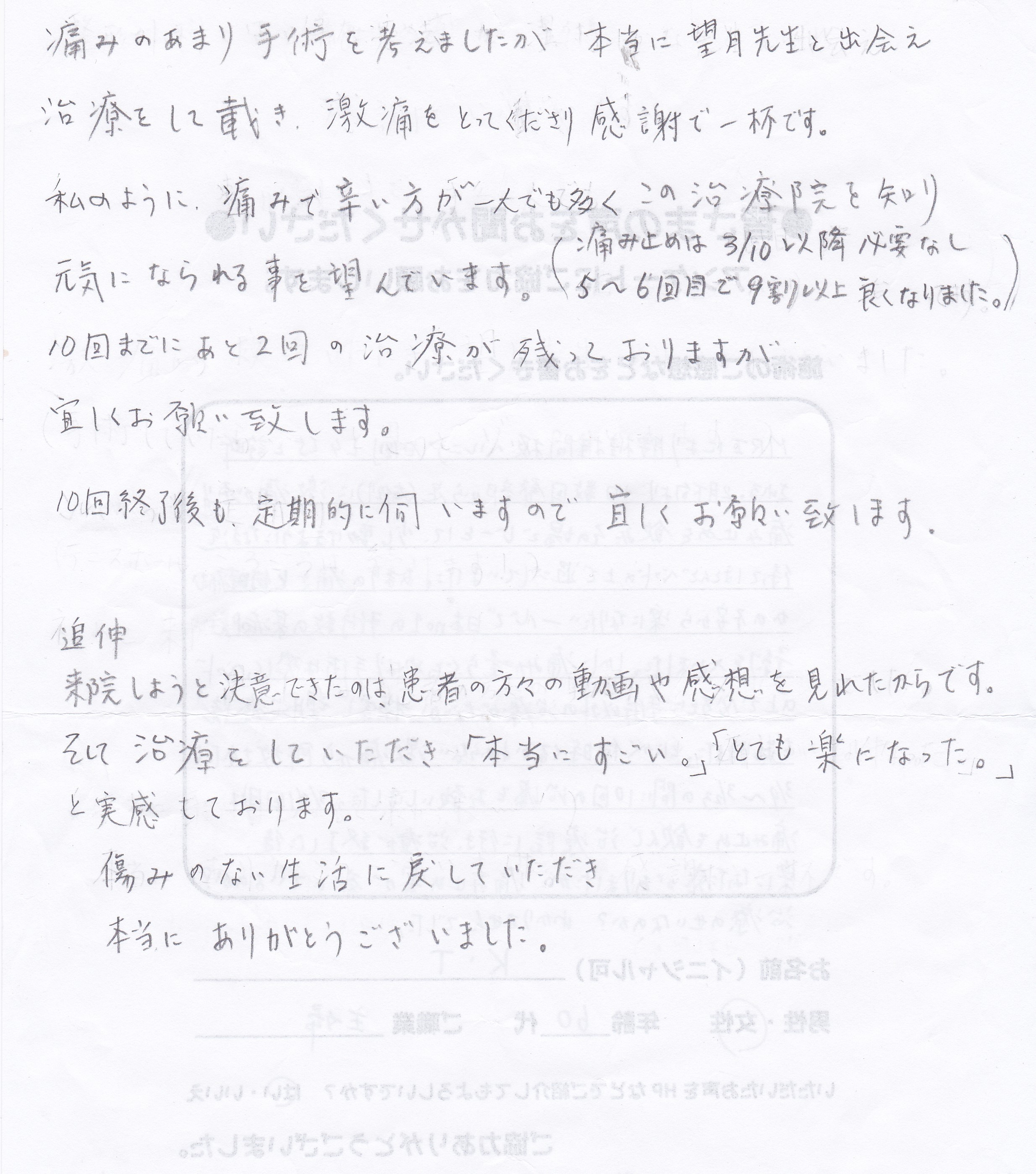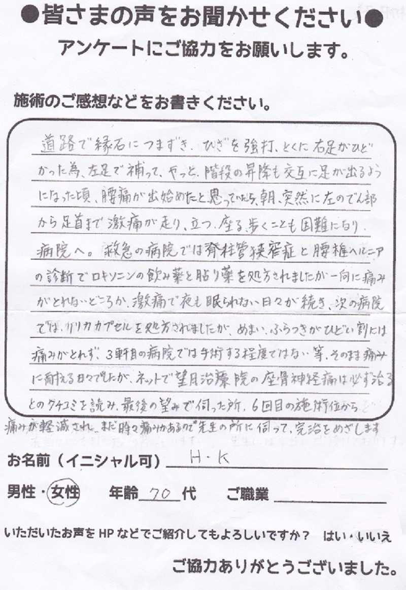 こんにちは!望月治療院、院長の望月です!腰椎すべり症による坐骨神経痛で来院して下さった患者様から感想を頂きました。ご協力頂きましてありがとうございます!70代 女性 Y,S様 【豊島区】 『…