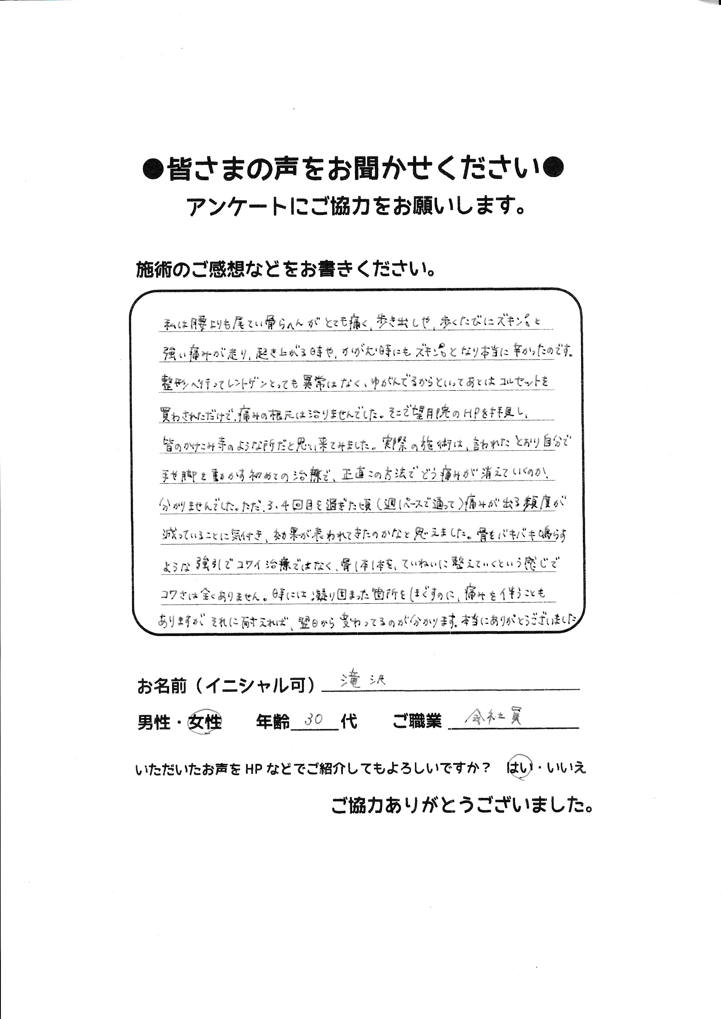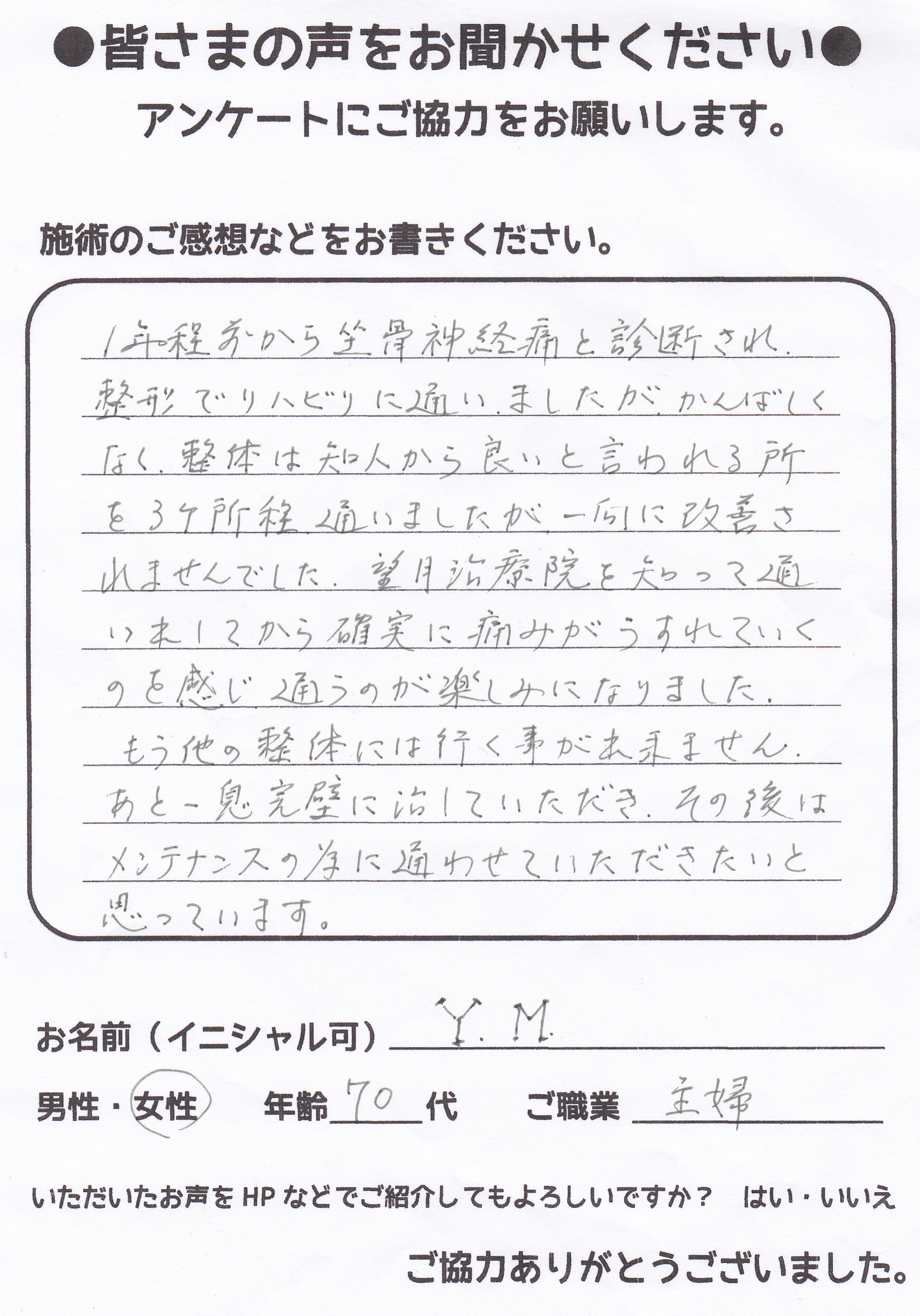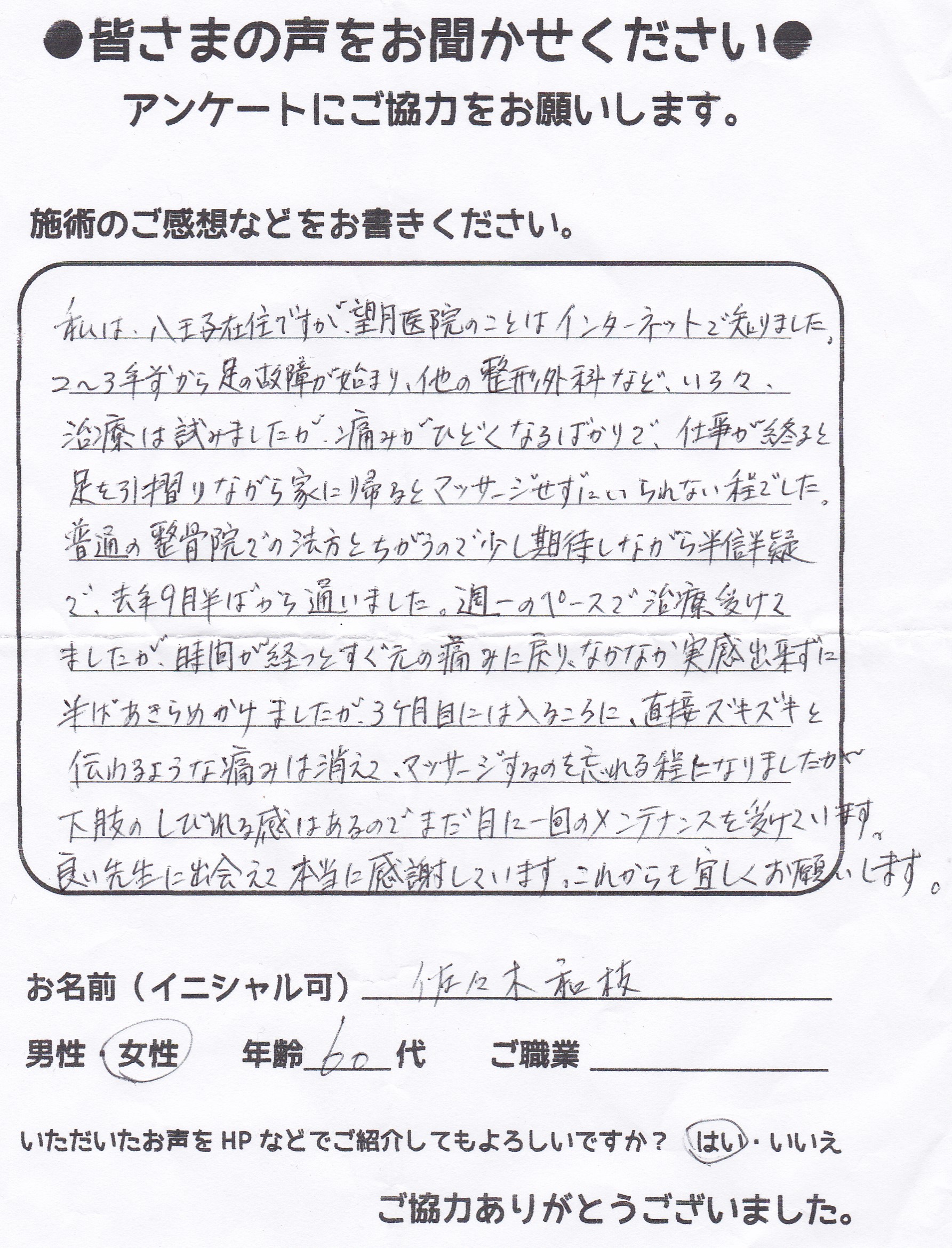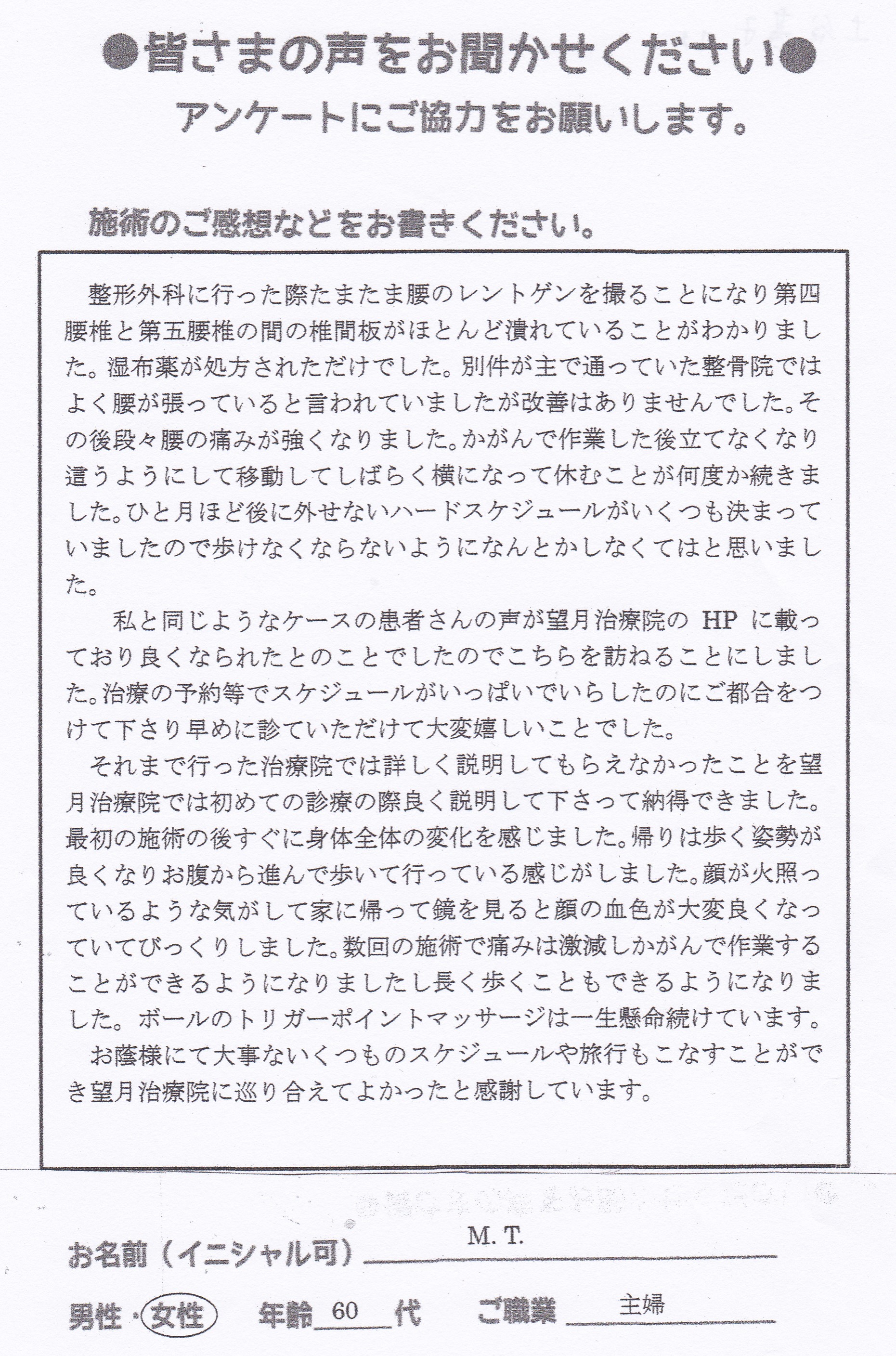 こんにちは!望月治療院、院長の望月です!腰椎すべり症による坐骨神経痛で来院して下さった患者様から感想を頂きました。ご協力頂きましてありがとうございます!70代 女性 Y,S様 【豊島区】 『…