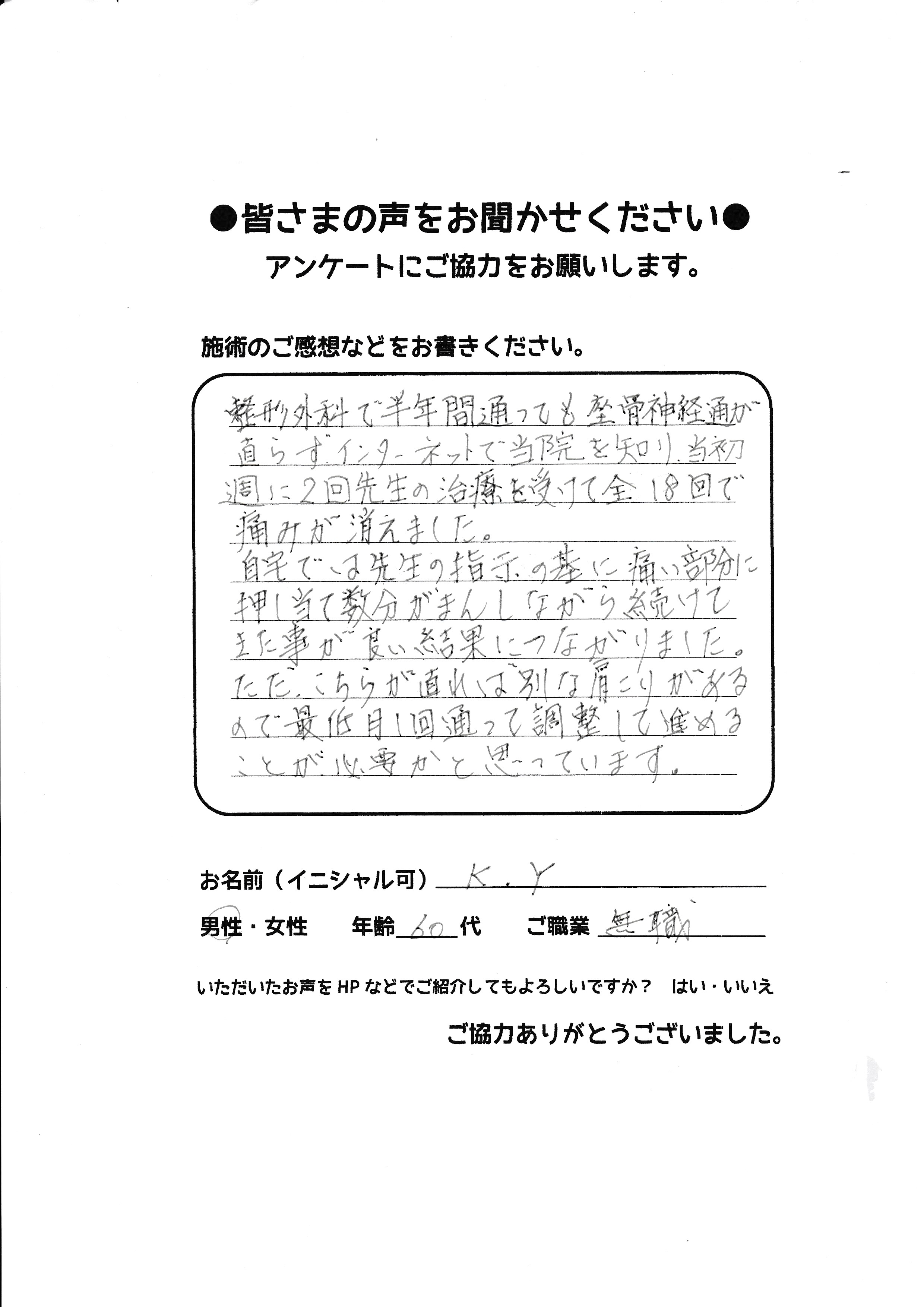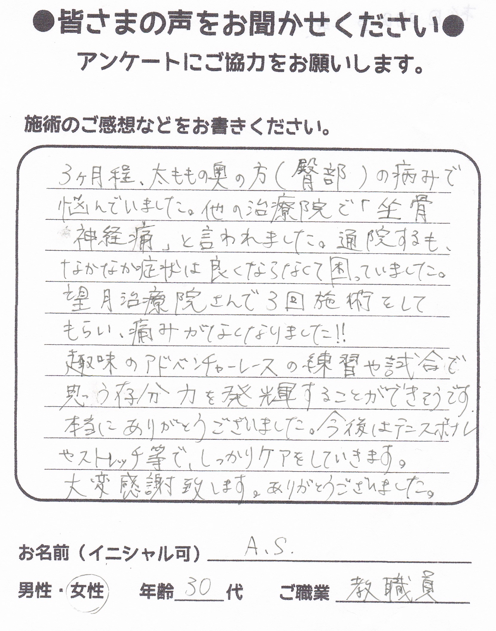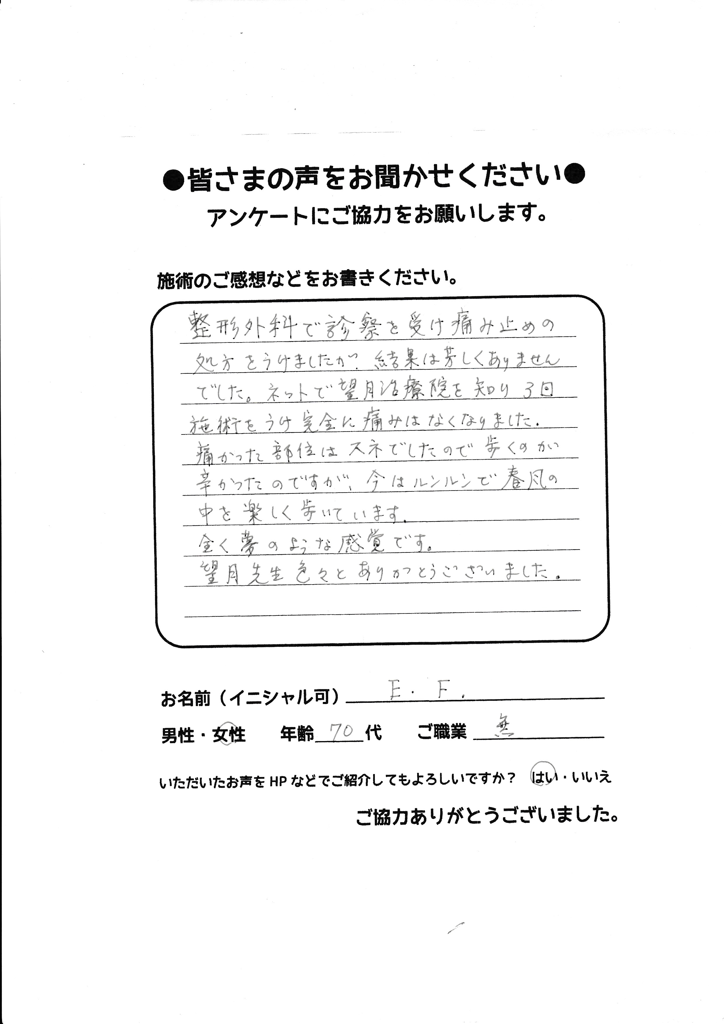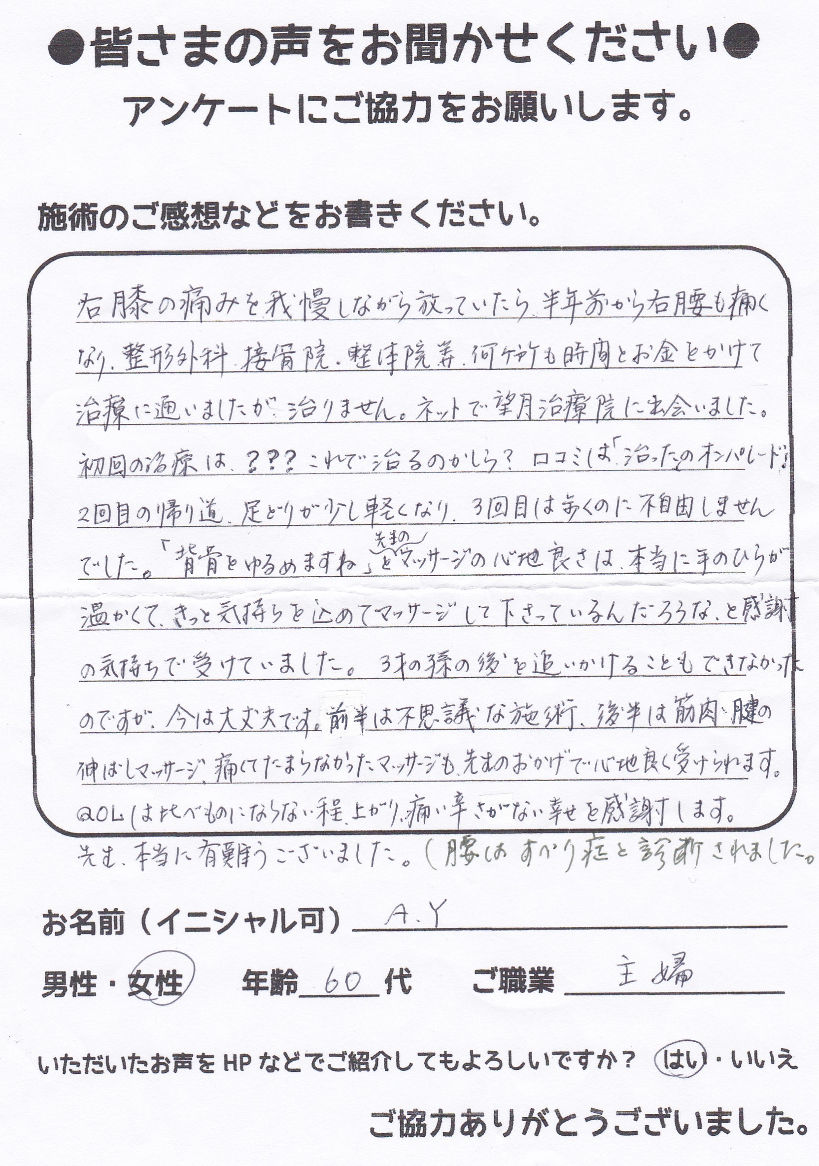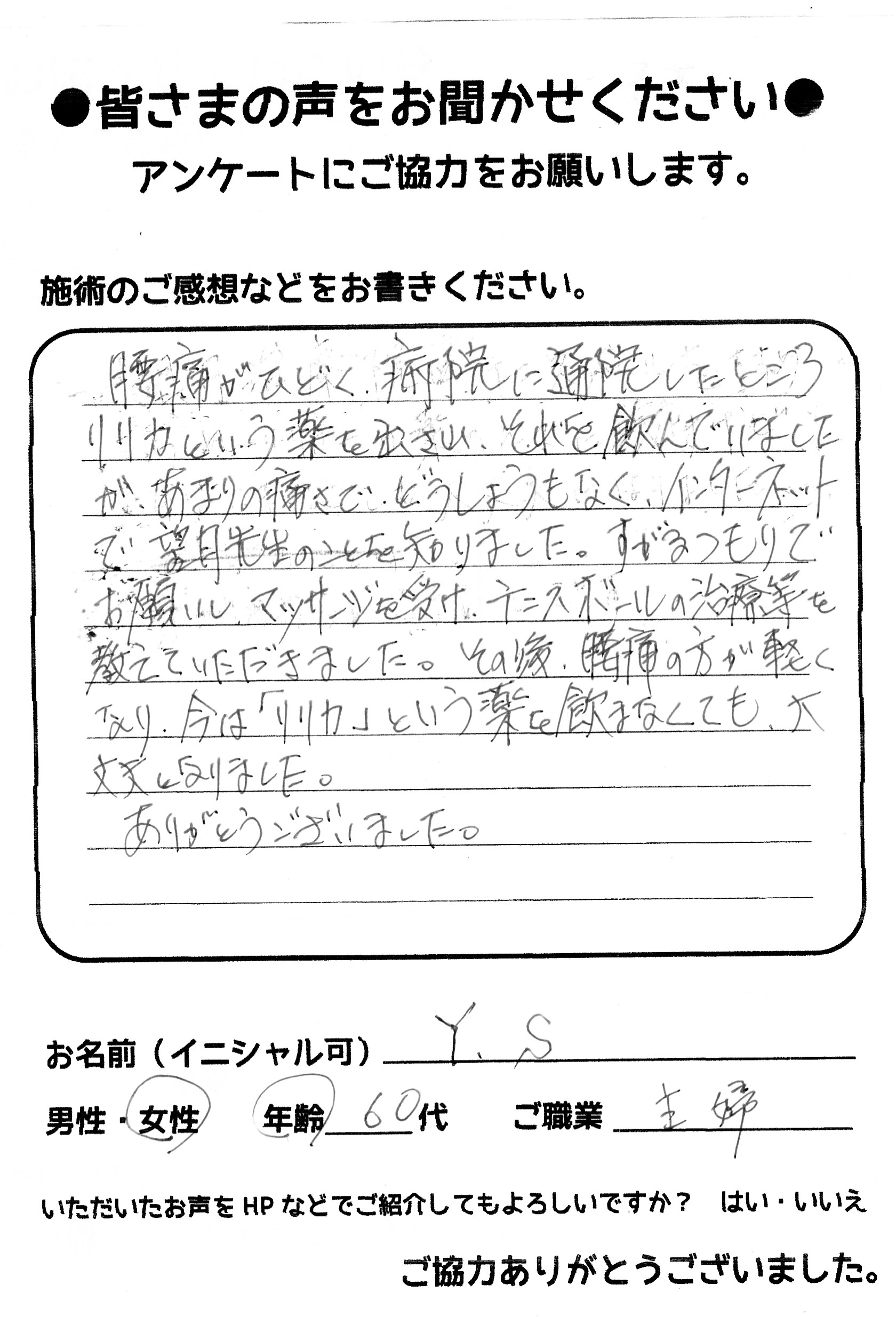 こんにちは!望月治療院、院長の望月です!腰椎すべり症による坐骨神経痛で来院して下さった患者様から感想を頂きました。ご協力頂きましてありがとうございます!70代 女性 Y,S様 【豊島区】 『…