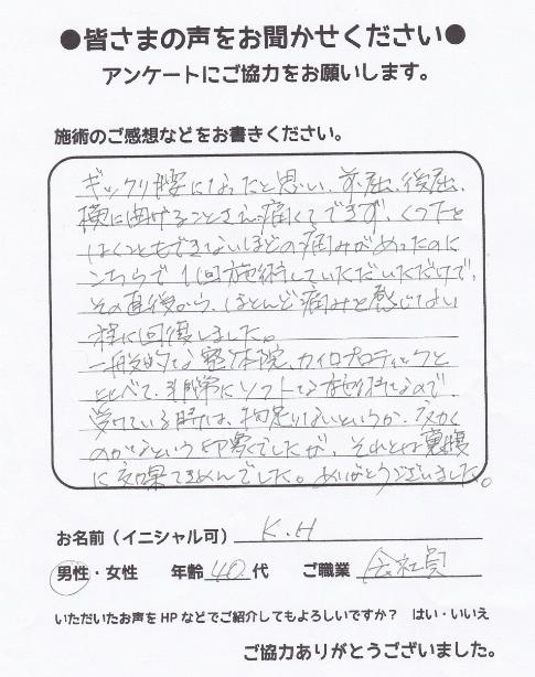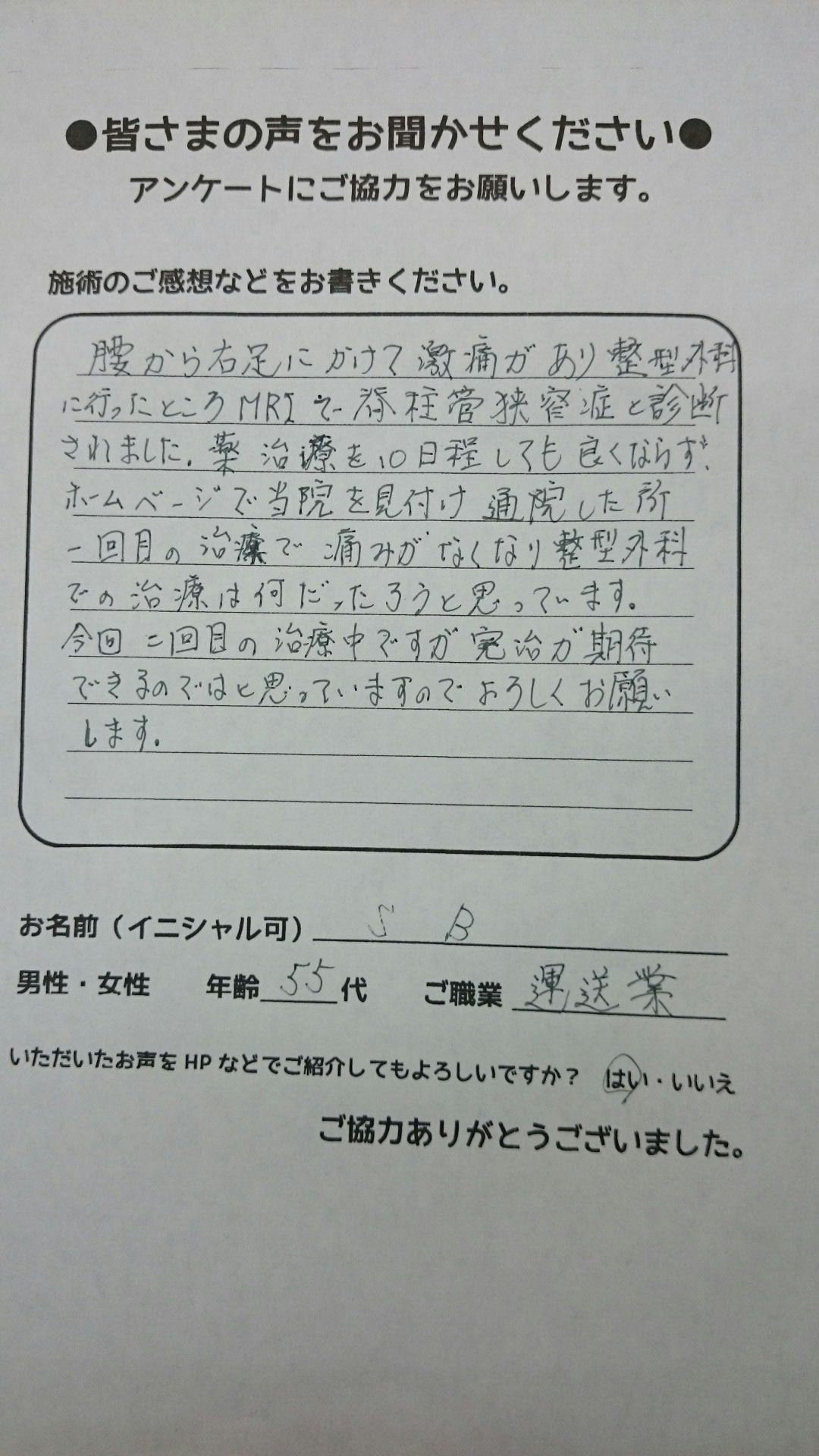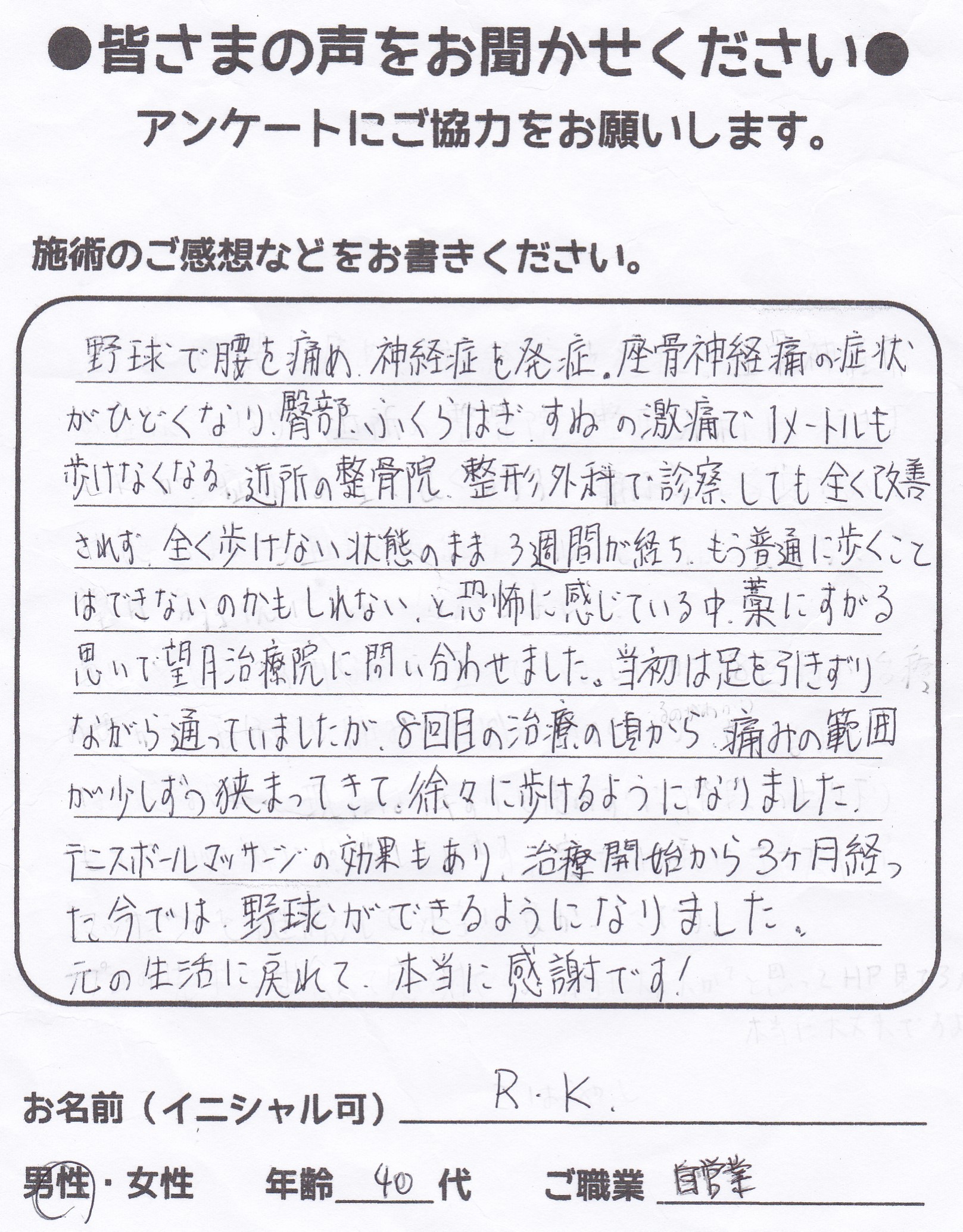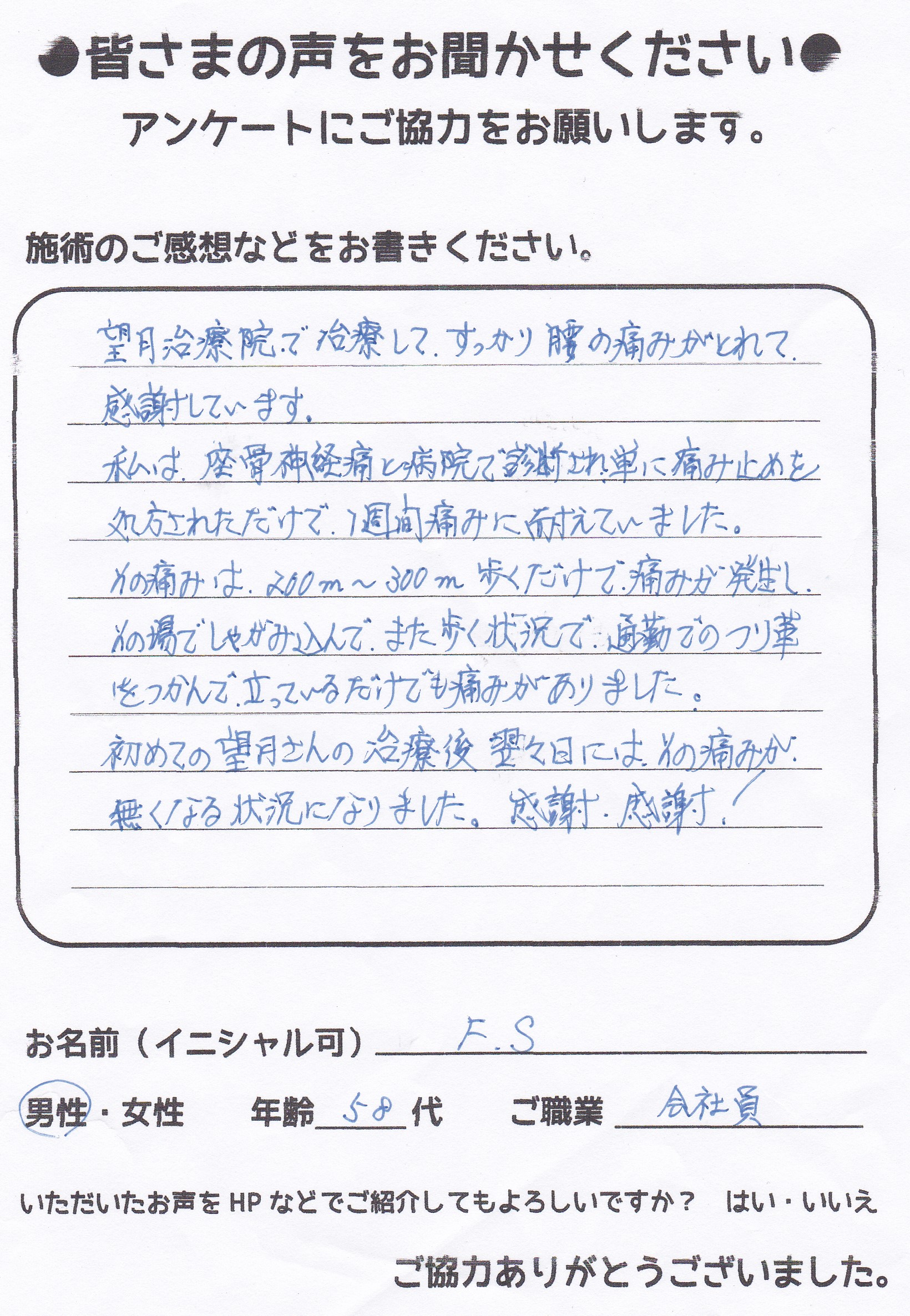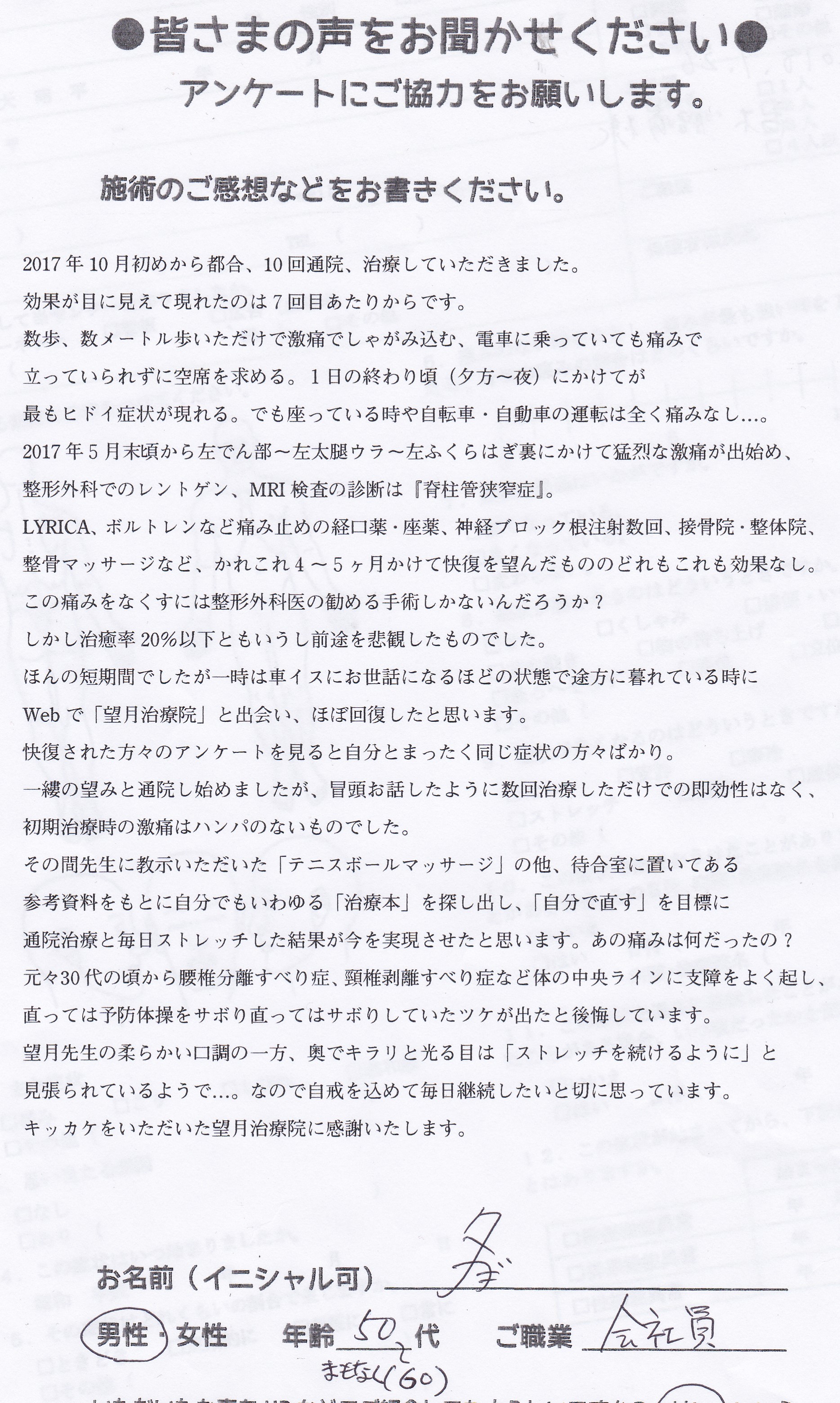 こんにちは!望月治療院の望月です!脊柱管狭窄症、腰椎すべり症による坐骨神経痛で来院した患者様から施術の感想を頂きました。患者様の声にご協力頂きありがとうございました!50代 男性 H,K様 …
