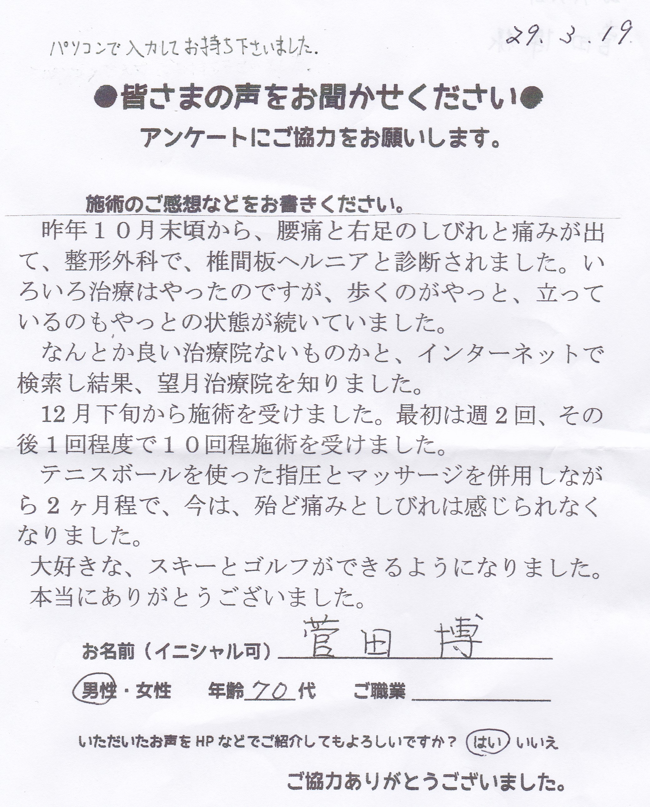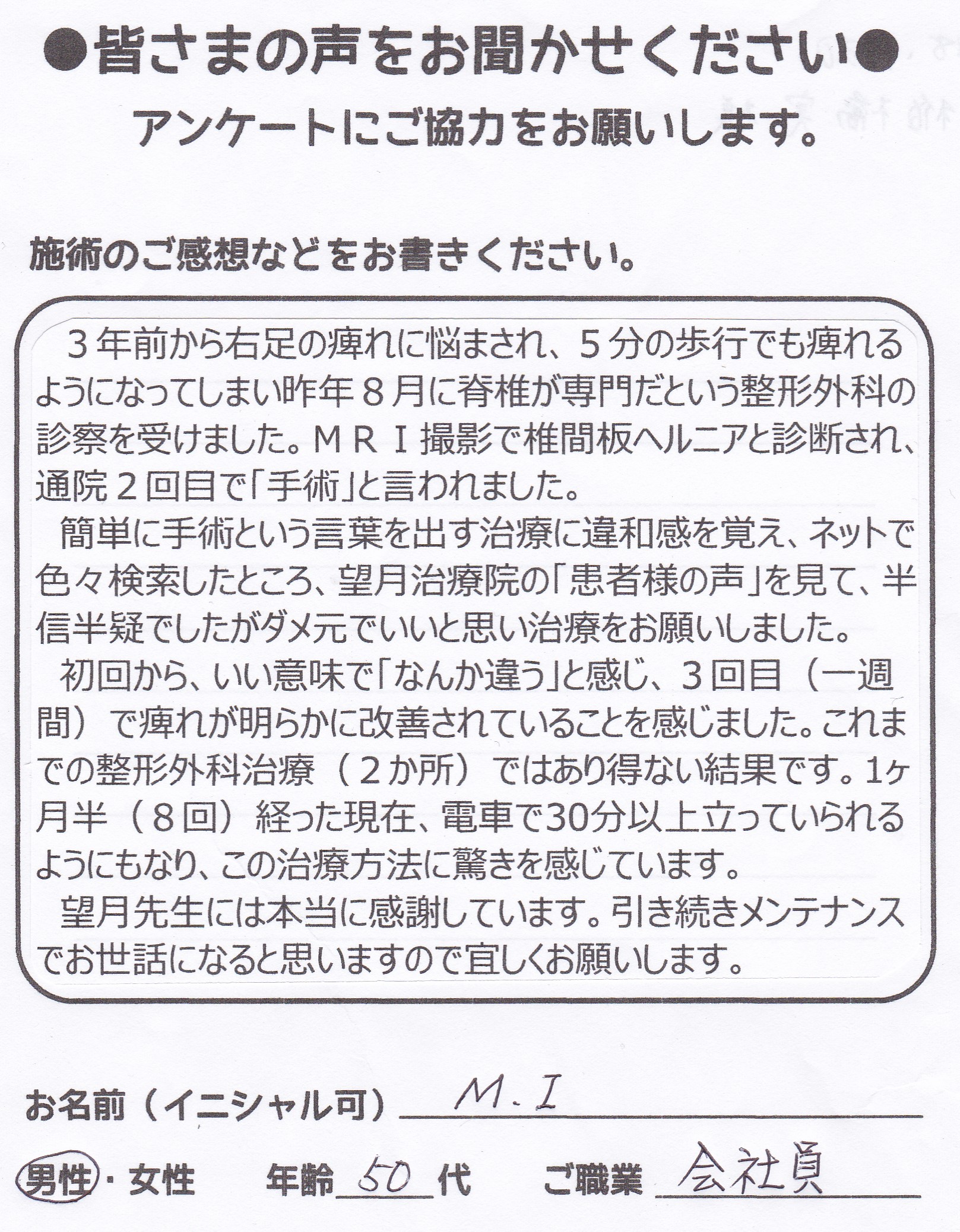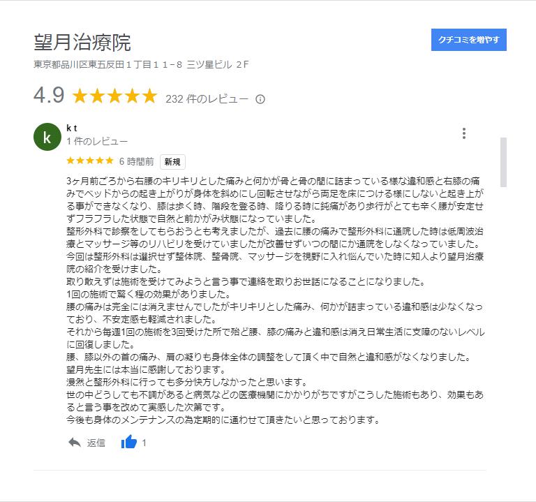 こんにちは!望月治療院の望月です!整形外科で椎間板ヘルニアと診断され墨田区から来院して下さった患者様から施術の感想を頂きました。ご協力頂きましてありがとうございました!60代 男性 N,T様 …