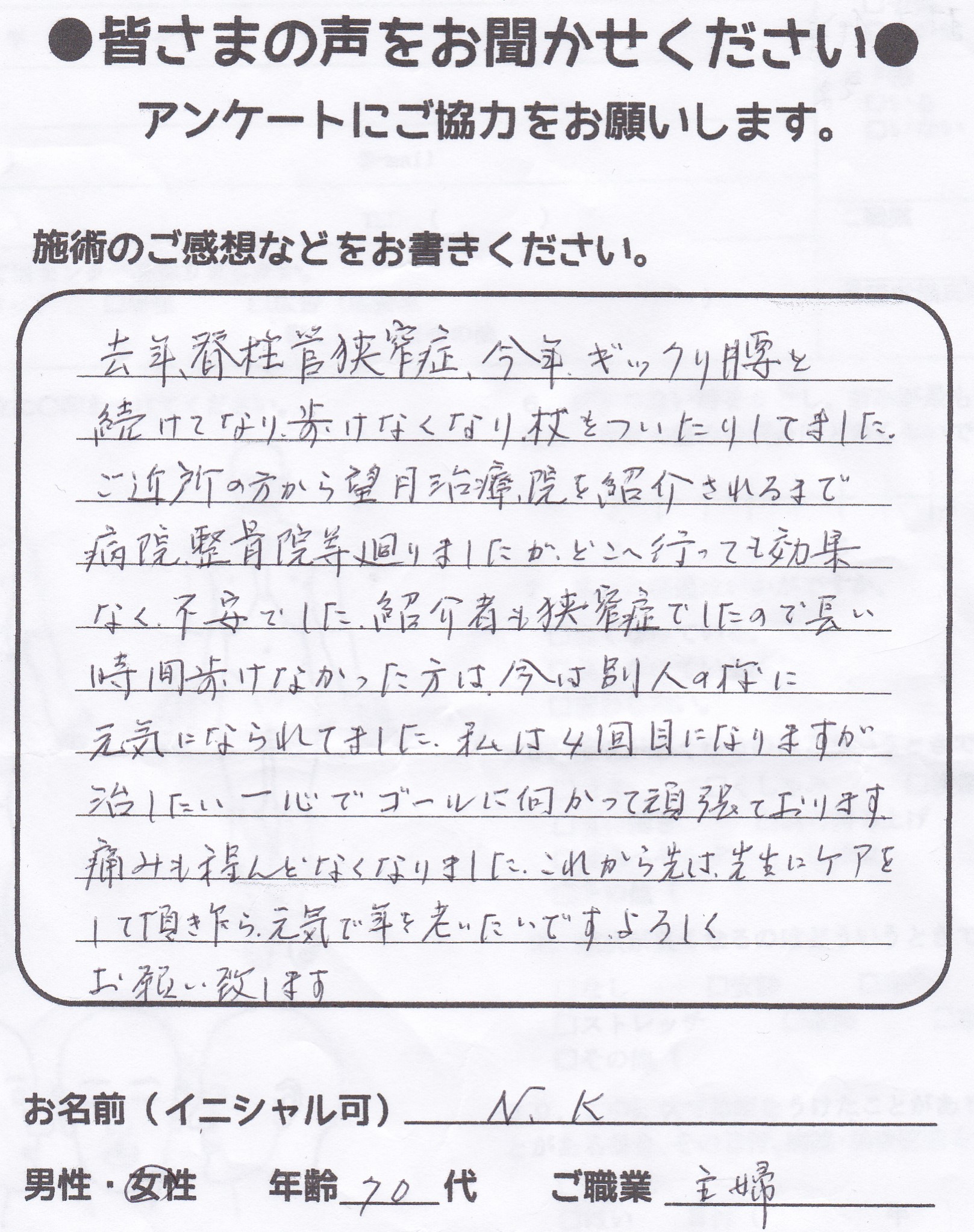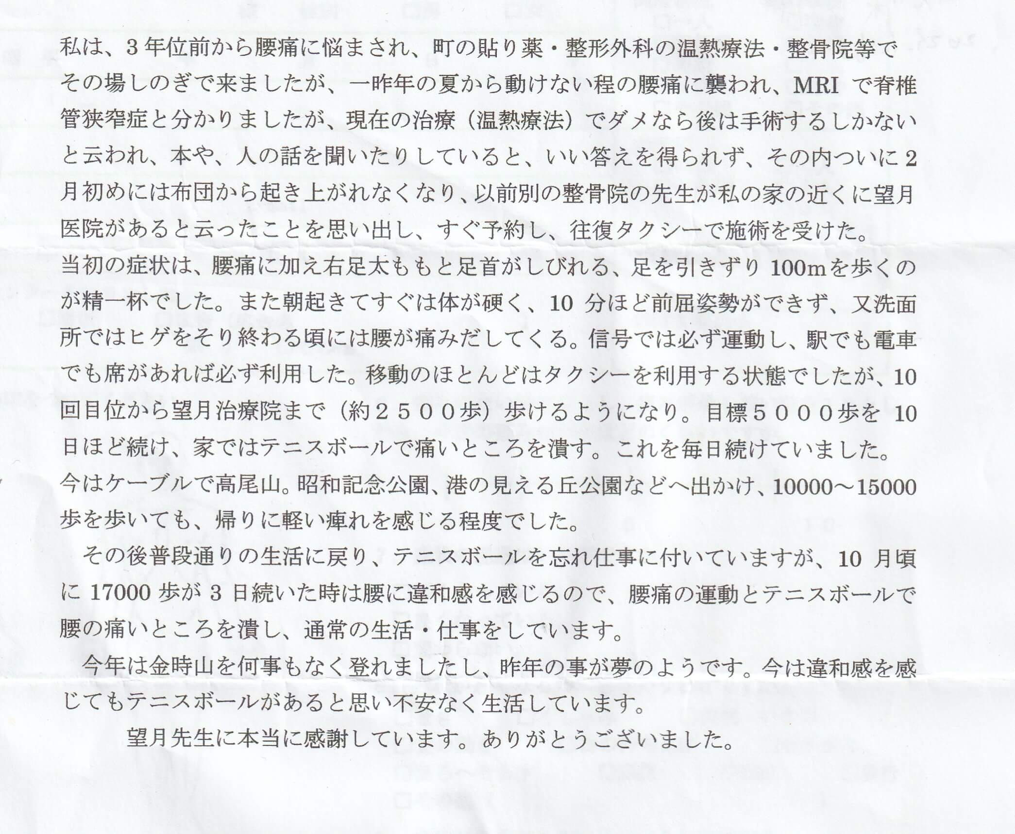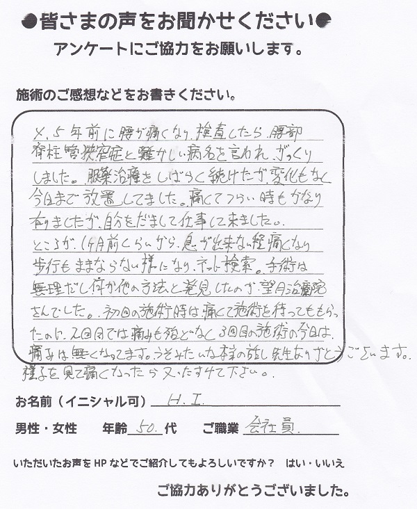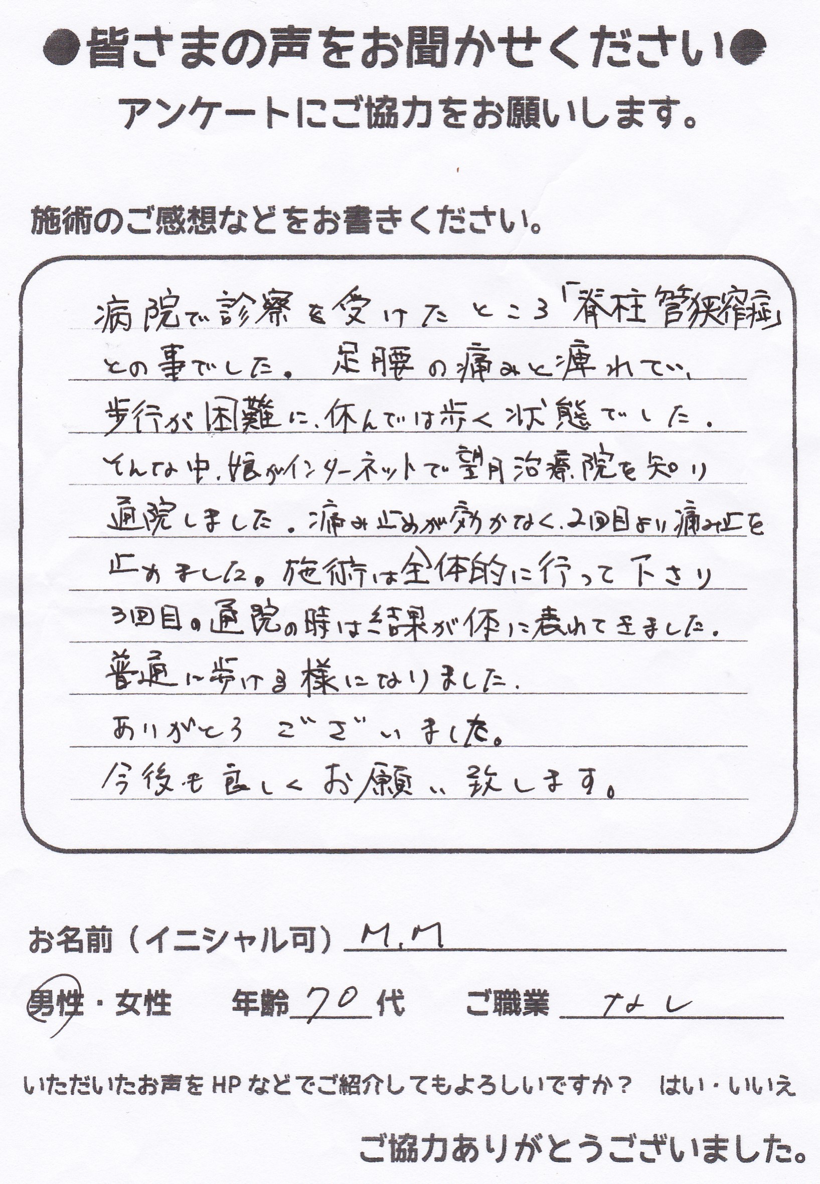望月治療院の望月です!脊柱管狭窄症、椎間板ヘルニアと整形外科で診断され西東京市からお越し下さった患者様から施術の感想を頂きました。ご協力頂きありがとうございました!70代 女性 H,Y様 【…