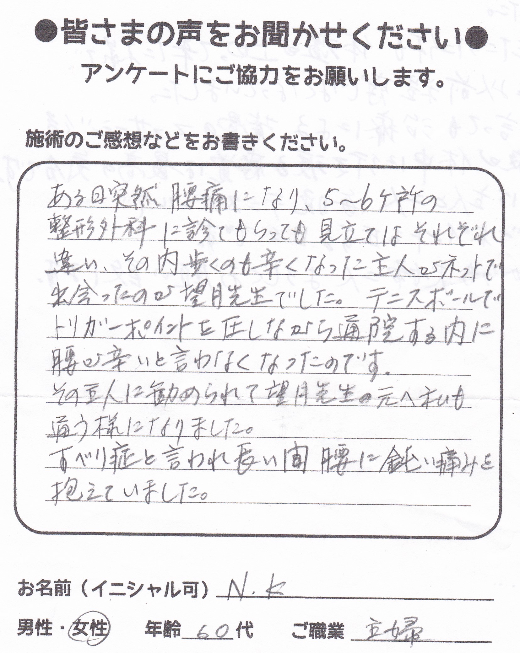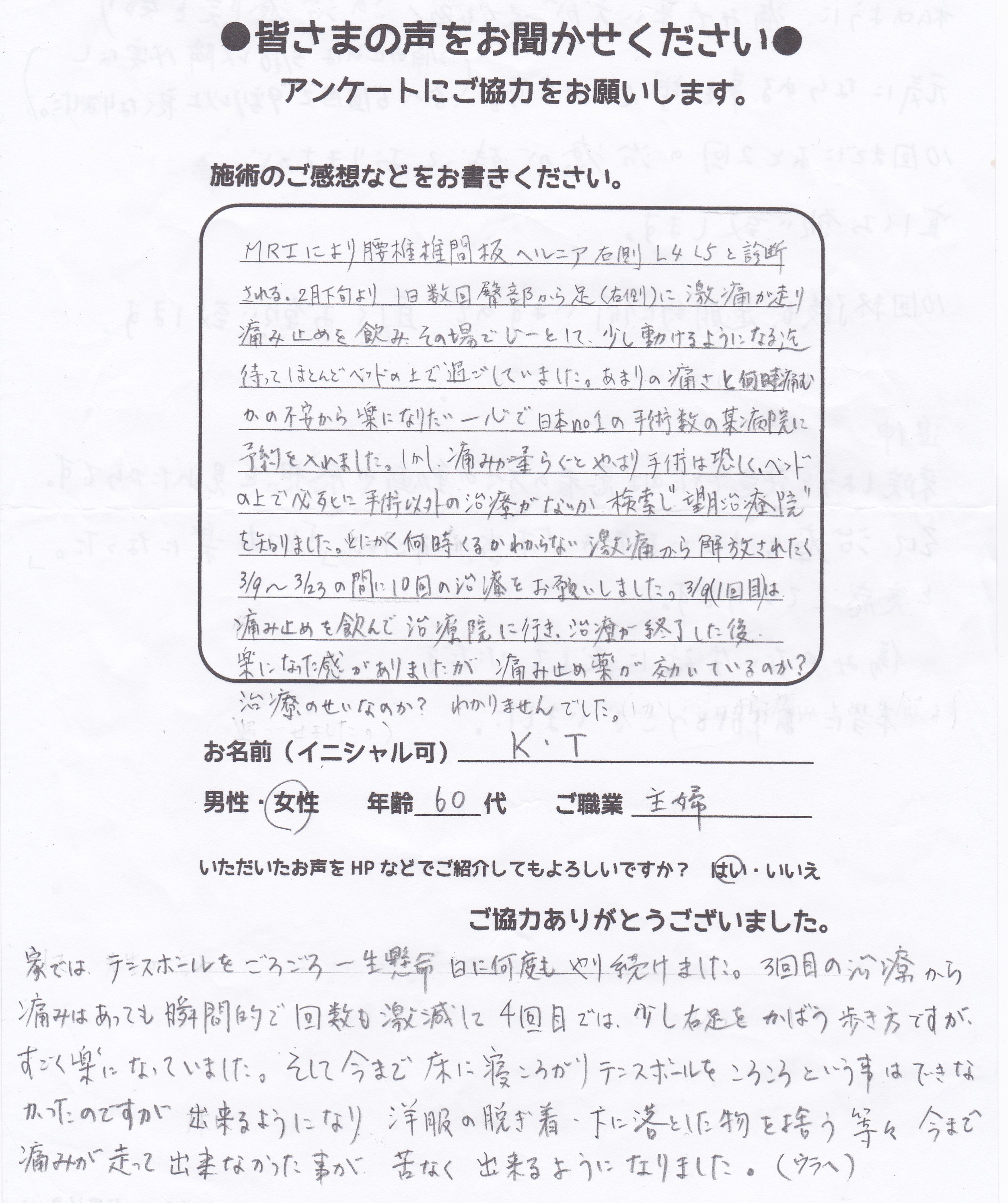 60代 女性 K,T様 【世田谷区】 『椎間板ヘルニアによる坐骨神経痛で2年以上足が痛くて痛くて苦しんでいました。病院で処方された痛み止めを飲み続けたり、整骨院に半年通ったり、有名な兵庫県の整体院に…