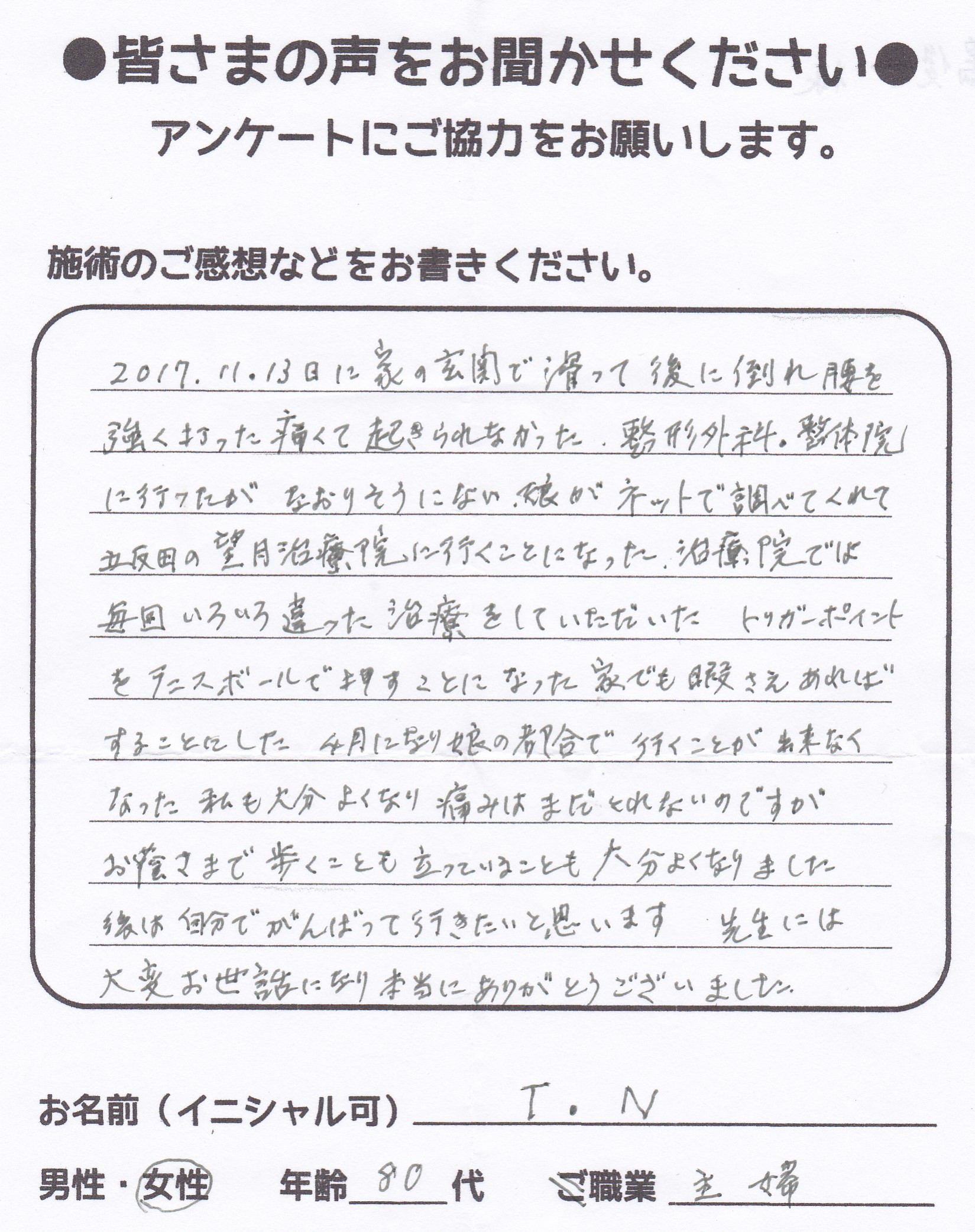 こんにちは!望月です。腰椎すべり症による坐骨神経痛で来院して下さった患者様から施術の感想を頂いました!80代 女性 T,I様 【板橋区】 『腰が痛くて痛くて、腰を伸ばす事すらできないくらい酷…
