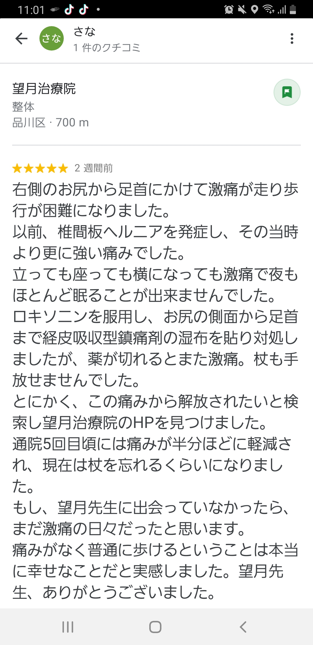 こんにちは!望月です!椎間板ヘルニアで来院された患者様からグーグルの口コミ投稿を頂きました。歩けないほどの激痛で初回は来院して下さいましたが数回の治療で改善しました。すっかり治って私も嬉しい…