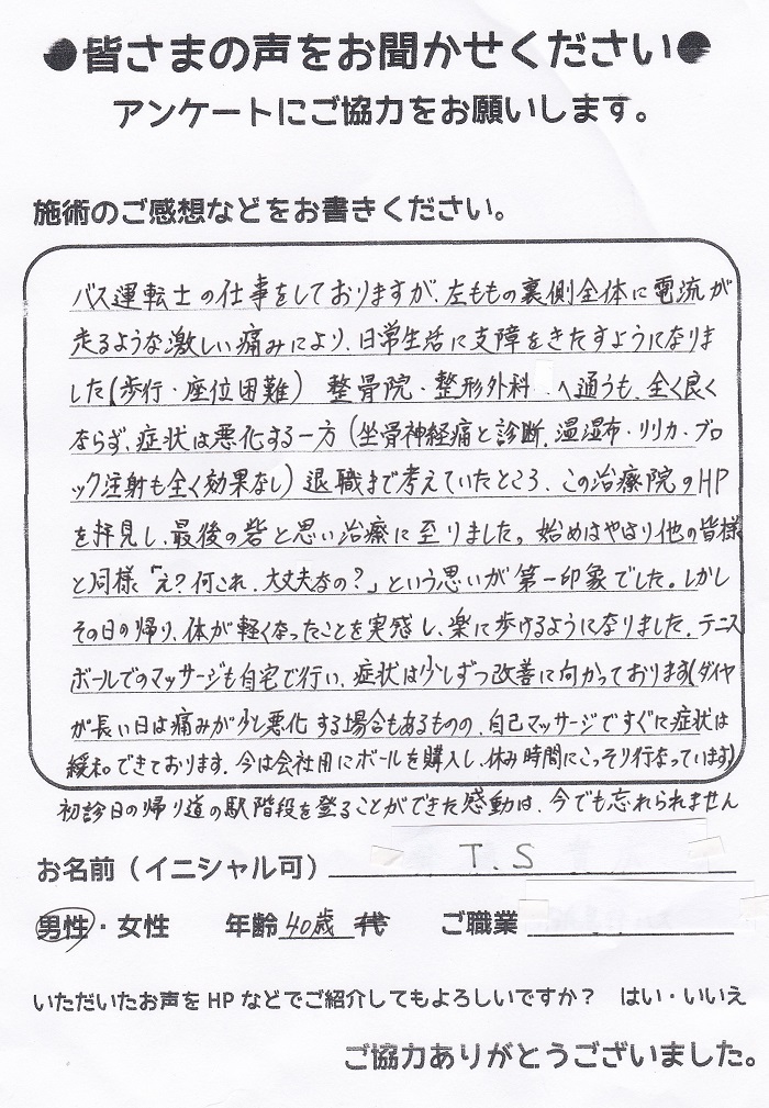 こんにちは!望月治療院の望月です!腰椎すべり症による坐骨神経痛で来院した患者様から施術の感想を頂きました。患者様の声にご協力頂きありがとうございました!40代 女性 M,Y様 【東京都調布市…